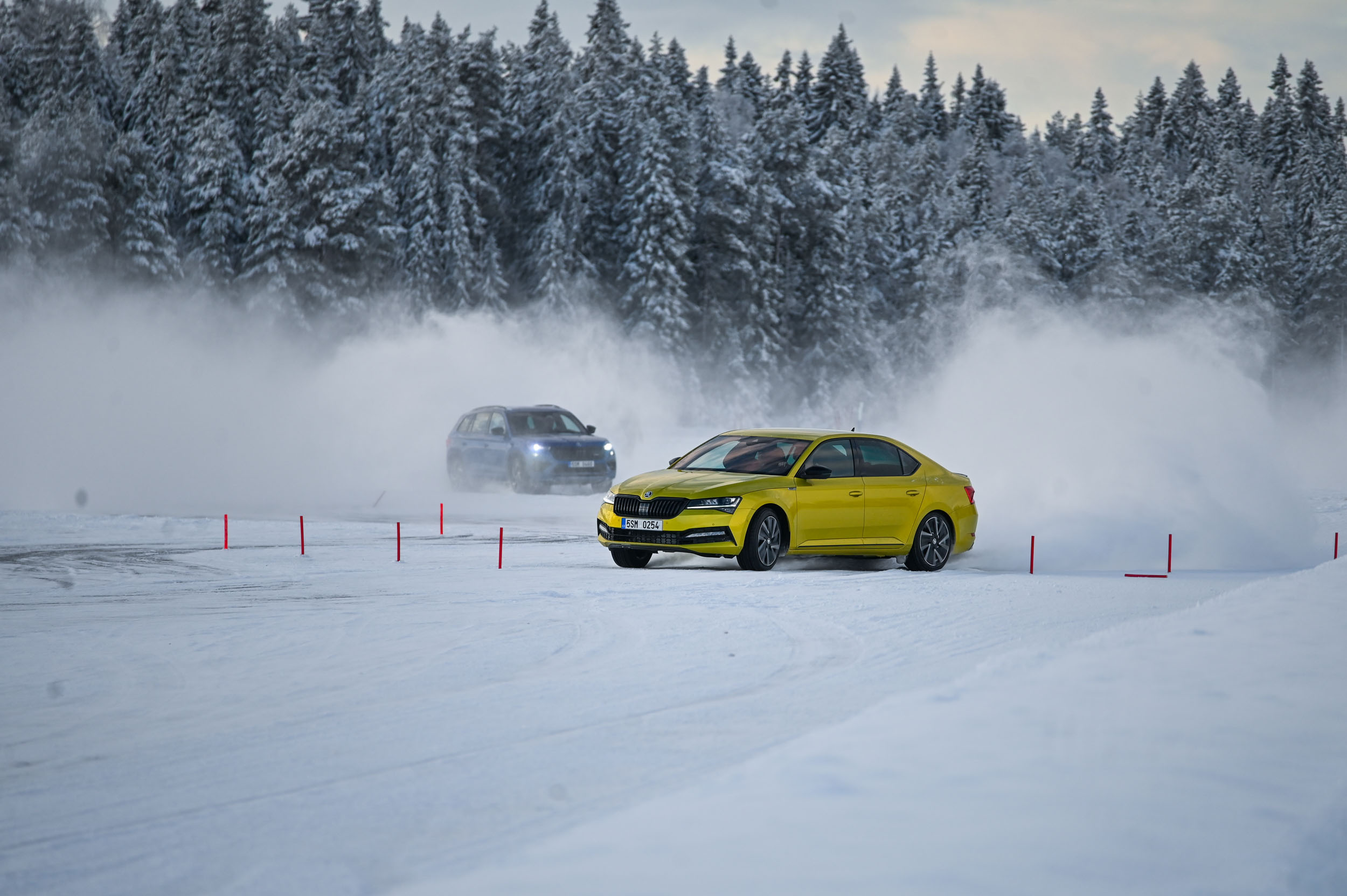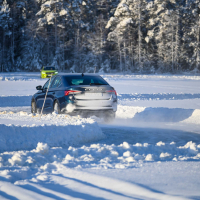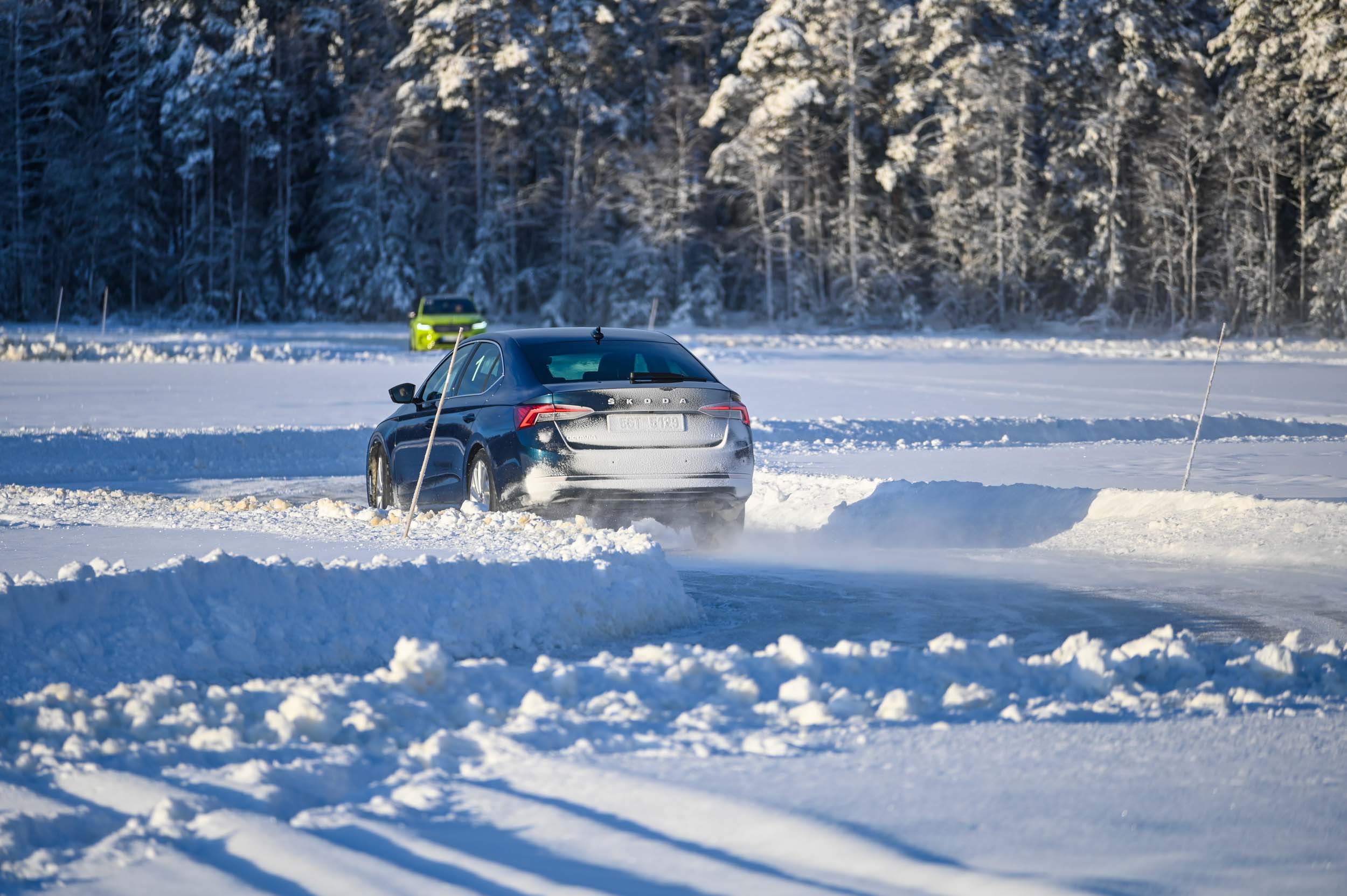 A srhljivi občutki nemudoma izginejo, ko na tem popolnoma ravnem ledenem vozniškem stadionu prvič v elegantnem bočnem drsenju s plinom in rahlimi popravki volana avto “preložiš” v nov ovinek veleslalomskega zavoja. Z vsakim novim odpeljanim krogom dobiš natančnejši občutek za drsenje in vodenje avtomobila. Domači švedski inštruktorji, ki so kot rally vozniki zrasli na ledu in cestah s steptanim snegom, izpostavljajo tudi pomen pravilnega zaviranja. Pred ovinkom z zaviranjem znižaš vstopno hitrost in maso preneseš na prednji kolesi ter tudi tako povečaš oprijem. Potem je treba najprej avto nastaviti v želeno smer in šele nato pohoditi plin, sicer lahko tudi pri štirikolesnem pogonu pride do podkrmarjenja oziroma zdrsa čez prednji kolesi, ko avto kljub zavijanju izgubi smer ter gre namesto v ovinek naravnost v sneg oziroma s ceste. Kako pomembne so izkušnje pri zimski vožnji, je jasno pokazal hiter krog švedskih inštruktorjev, ki so vozili serijske škode z običajnimi zimskimi pnevmatikami, ki imajo na Švedskem lahko nameščene milimeter velike zaobljene žebljičke. Fantje res obvladajo zimo in s pridom izkoriščajo ključno fizikalno prednost štirikolesnega pogona: porazdelitev pogonske moči na vsa štiri kolesa.