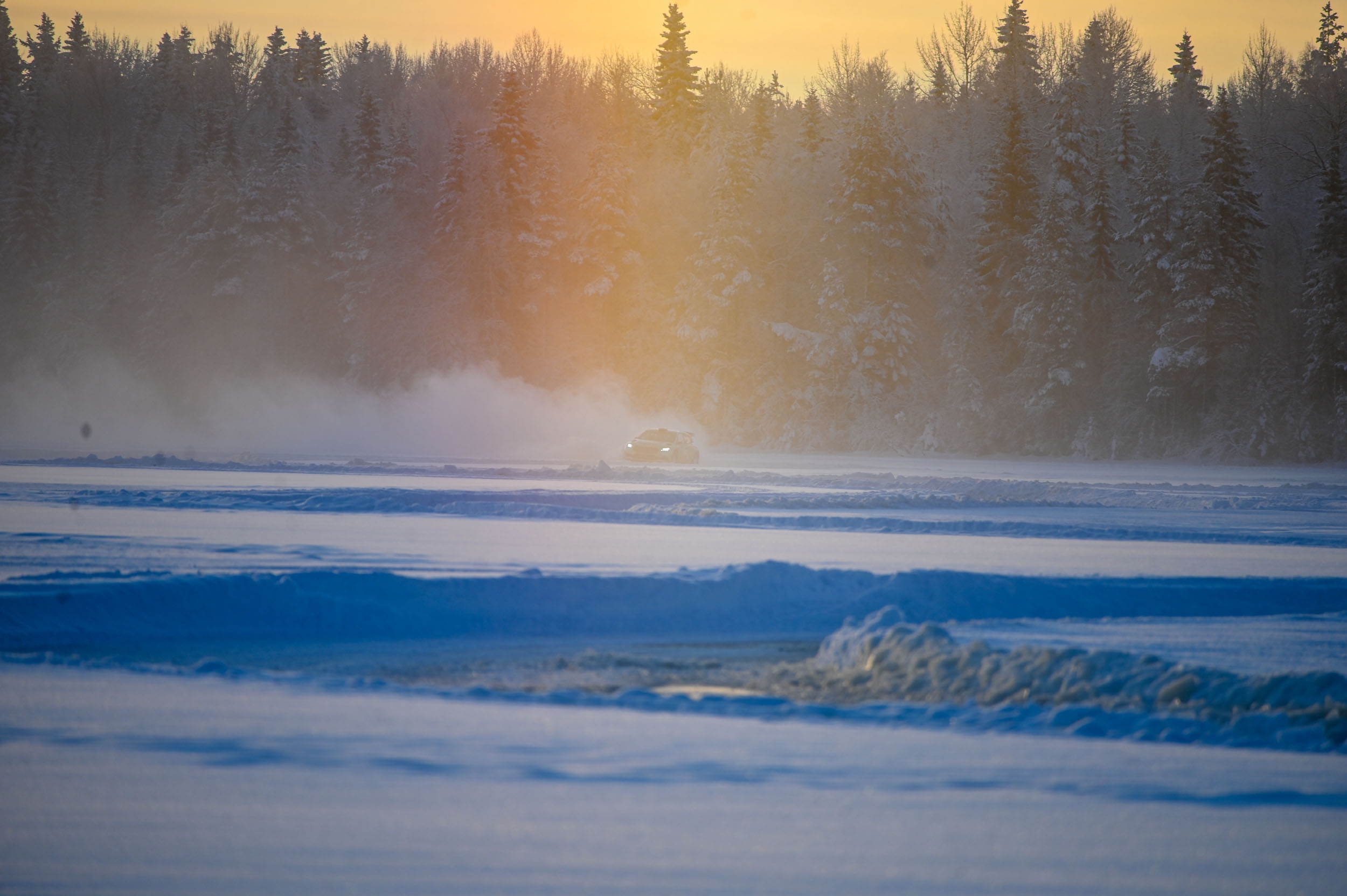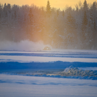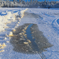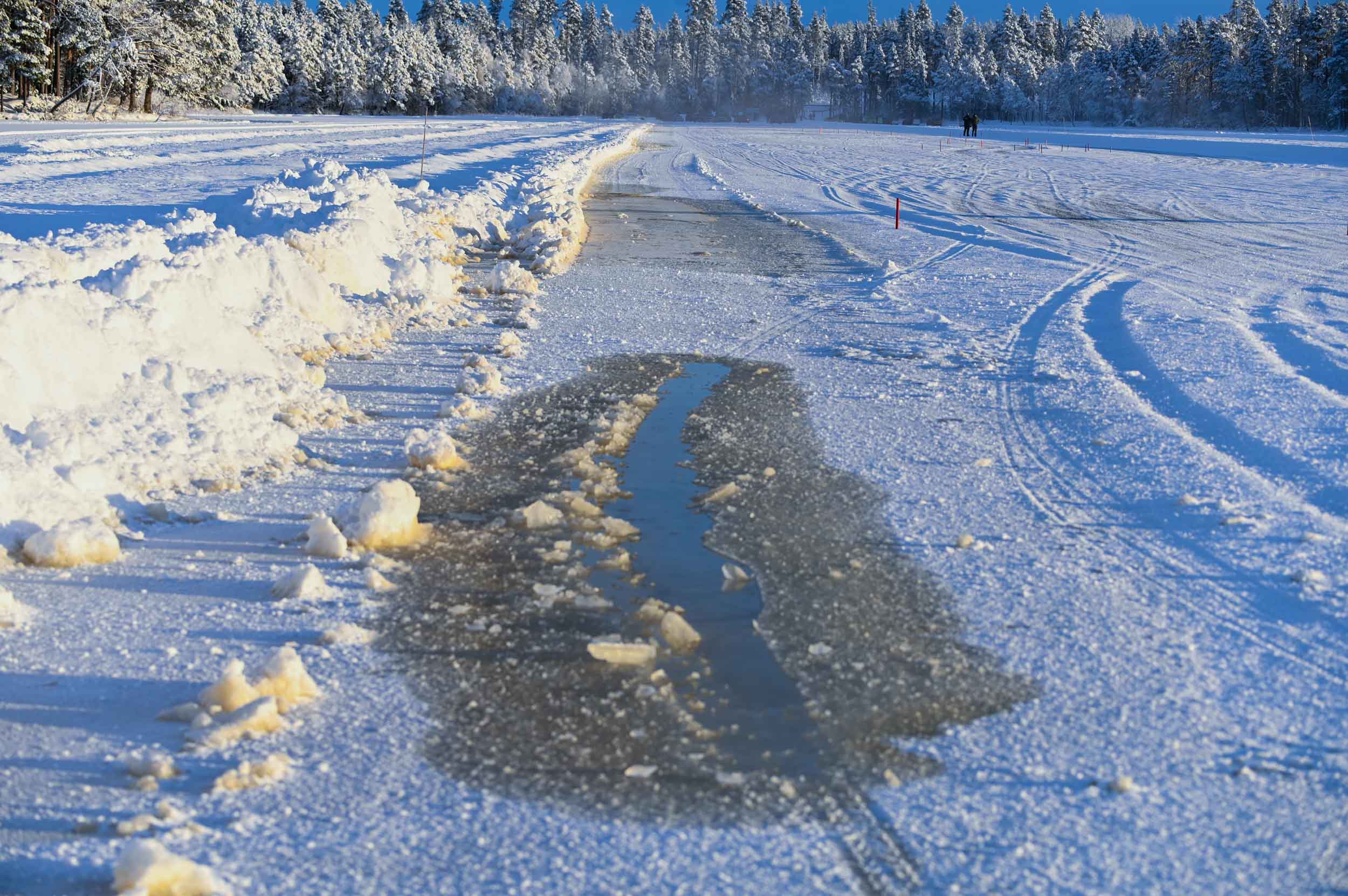 Led, po katerem smo vozili, je bil na precej mestih načet in “polit” z jezersko vodo, ki je na površino pronicala skozi razpoke. A to se pogosto dogaja po obilnem sneženju, saj teža snega še dodatno obteži ledeno pokrovko jezera, voda pa vedno najde pot. Izkušeni domači rally inštruktorji so nam razložili, da je tudi težji električni avto mogoče po jezeru varno peljati po vsega 10 centimetrov debelem ledu. Na četrt metra debelem ledu že lahko pristane manjše letalo. Naš ledeni poligon je pod kolesi ponujal od 35 do 50 cm ledu. Ko prvič iz avtomobila sredi jezera stopiš na ledeni parter, je malce srhljiv občutek, saj pod nogami slišiš zamolklo pokanje ledene gmote, pod katero kroži “živa voda”. Gledaš obrušeno površino, s katere kristale krog za krogom trgajo “ježevke” oziroma zimske pnevmatike z zaobljenimi jeklenimi žebljički. Nato z malce cmoka v grlu daleč od obale prvič pohodiš plin.