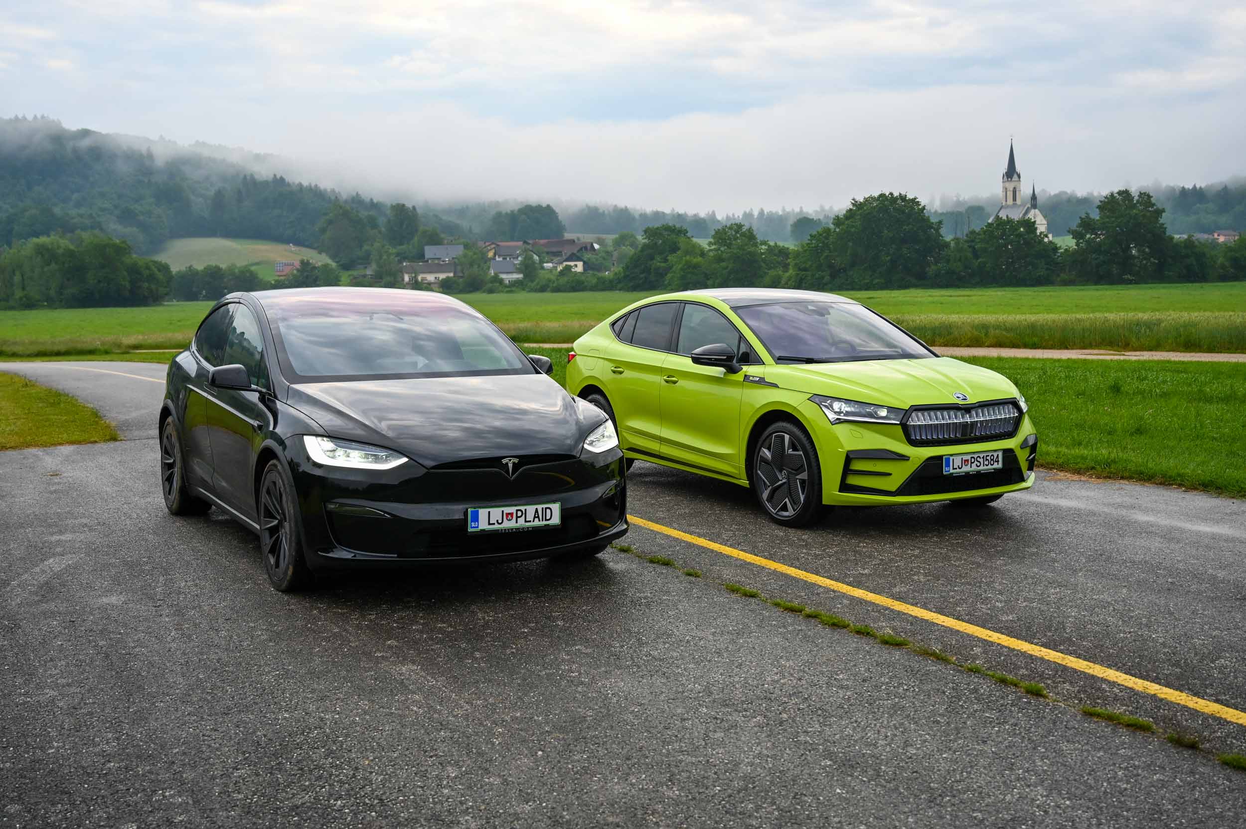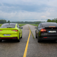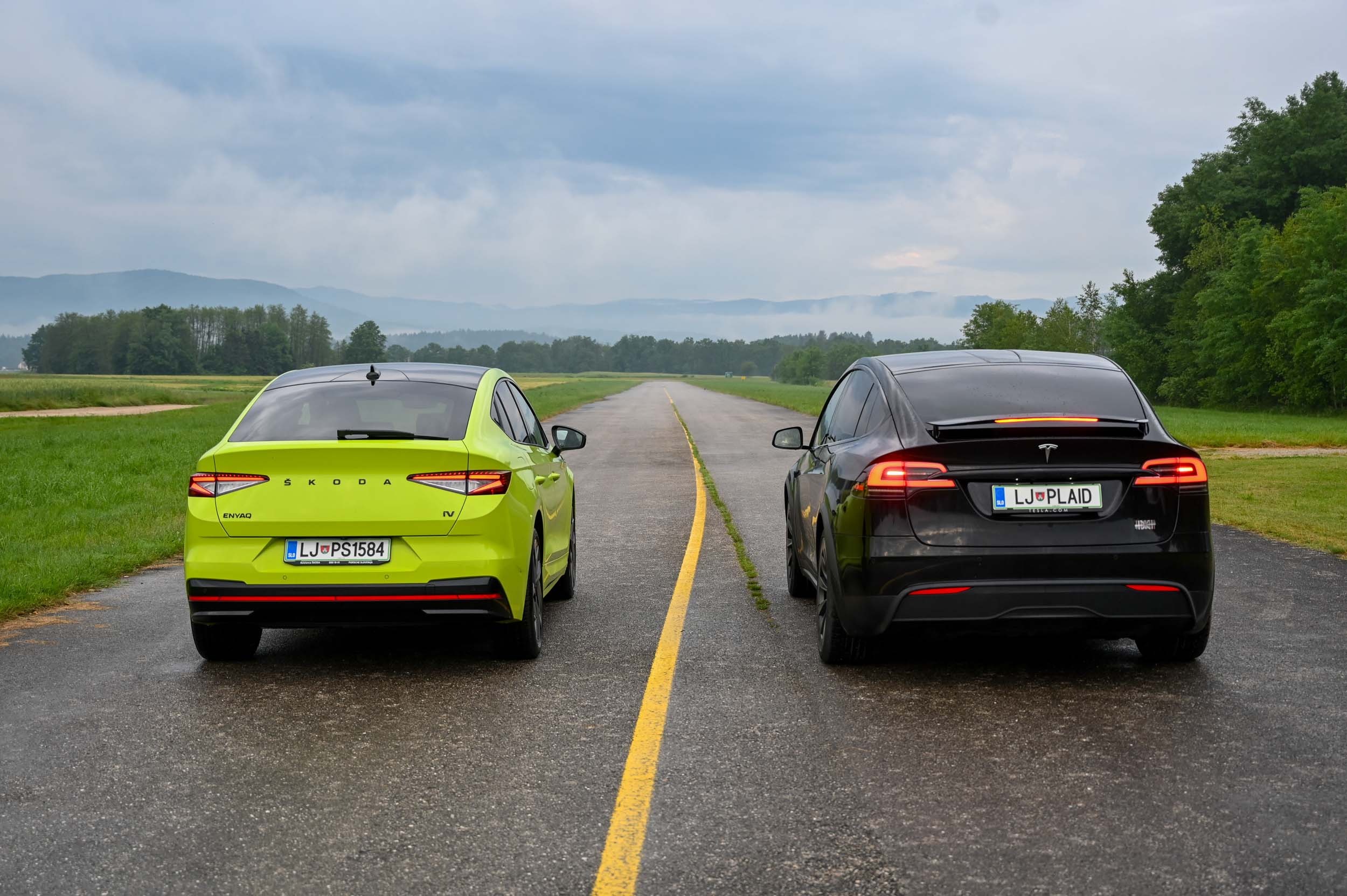Kako peklensko hiter je z mesta model X, si oglejte na zgornjem videoposnetku. Za primerjavo zmogljivosti smo malce v šali in malce zares na kratko letališko stezo v Prečni pri Novem mestu ob teslo postavili najhitrejšo električno škodo - štirikolesno gnanega kupejevskega enyaqa RS iV, ki je s svojimi 300 konji iz dveh električnih motorjev zmogljiv avto. Po videzu je celo bolj “strupen” kot model X plaid. Že trenutek po štartu pa je bila škoda le avto, tesla X pa raketa.