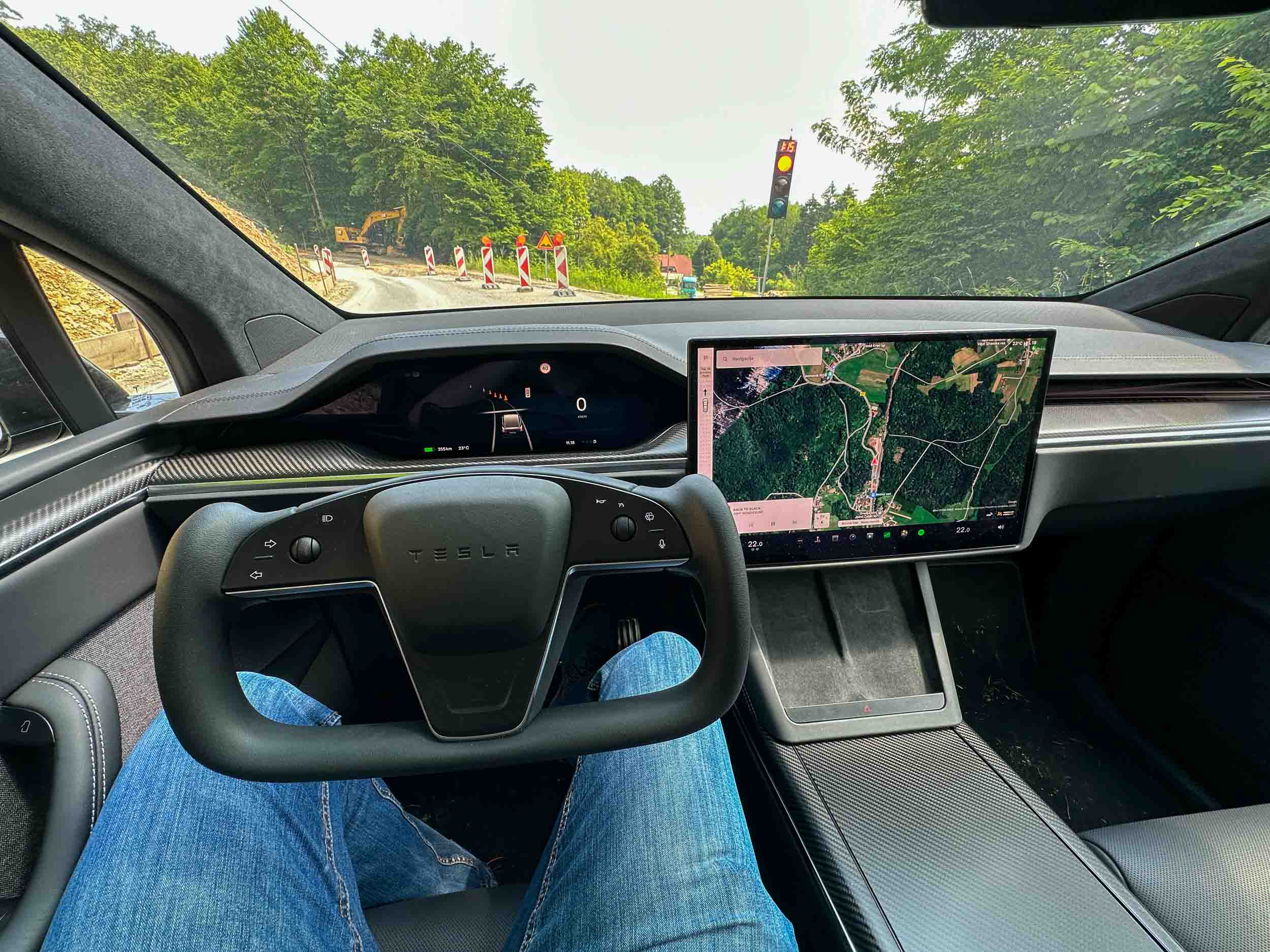 Drugi sodelavec pa se je tako pogumno lotil iskrenega opisovanja svojega doživetja: “Spoznavanja s tole Teslo se ni začelo najbolje. Še preden sem sedel vanjo, me je dvakrat odrinila z vrati ("Zagotovo ima tipalo!"), za prvim križiščem, na testni vožnji pa ob hipnem pospešku še lopnila po glavi. Vsaj zadnjega avtomobilu, ki do stotice požene v času, krajšem od lastnega prdca, ne gre preveč zameriti. Pospeški so res brutalni in tudi v ovinkih se ne čuti, da skupaj s potniki tehtamo skoraj tri tone. Rekuperacija deluje odlično, brez uporabe zavore ustavi tudi po klancu navzdol. Volan oziroma yoke daje dober občutek tistemu, ki ga drži za roge, sila vračanja v nevtralno lego je ravno pravšnja, česar pa ne morem reči za količino povratnih informacij izpod koles, teh je premalo. Yoke ima tudi izboklini na pravih mestih, ki omogočata povsem enostavno vrtenje - kot pri običajnem volanu. (Vrtljivi) gumbi na njem zahtevajo daljši čas privajanja, enako velja za nastavitve klimatske naprave, ki zna iz silno prikritih rež prav neugodno pihati naravnost v obraz. Nad odsotnostjo haptičnih komand nisem navdušen, gigantski zaslon sredi armature požira preveč pozornosti. Vsi sedeži so udobni, tisti v tretji vrsti so primernejši za vsaj nekaj cm nižje od mene. Tako jim ni treba tiščati glave v strop, ki je na nekaterih mestih čudno votel in ob trkanju ne deluje nič kaj imenitno. Podobno je z velikanskim delom trde plastike pred zadnjim kolotekom. Pod črto prostoren in izjemno zmogljiv avtomobil, ki navduši predvsem voznika, sopotnike, ki se med res dinamično vožnjo počutijo kot na slabo zasnovanem vlakcu smrti, pa nekoliko manj. Dokler ne sedejo za yoke in ga primejo za roge …”