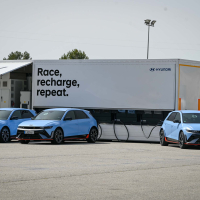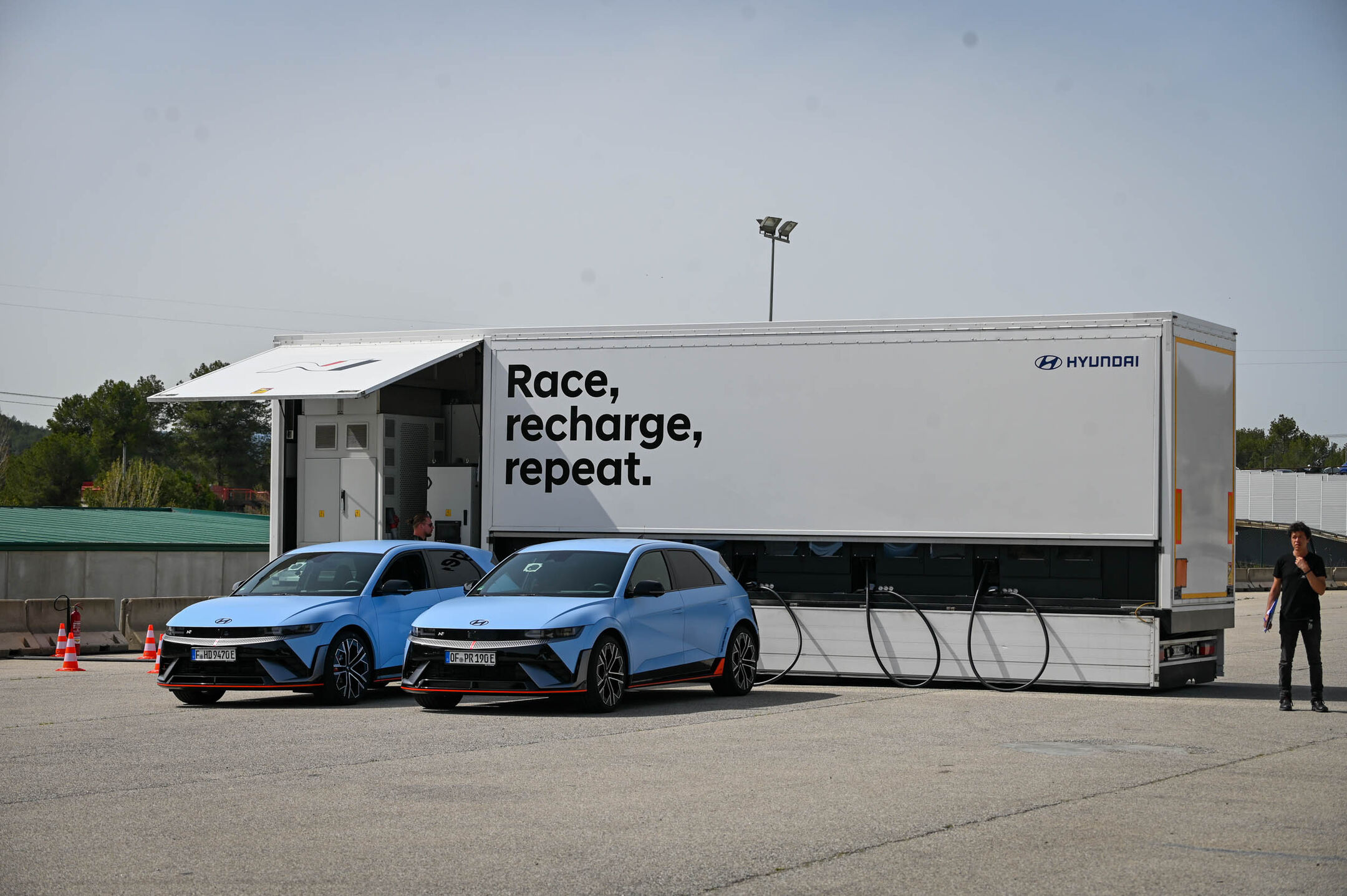 | Na dirkališče je Hyundai pripeljal tudi svoj mobilni električni zalogovnik. Gre za vlačilca, ki ima na prikolici 30 ton litij-ionskih akumulatorjev s klimatskim termičnim nadzorom in inverterjem. Na njem je na voljo 10 vodno hlajenih priključnih kablov z močjo 320 kW. Iz dirkališča smo našega ioniqa 5 N pripeljali na polnjenje in takoj je začel polniti z močjo 262 kW. |
