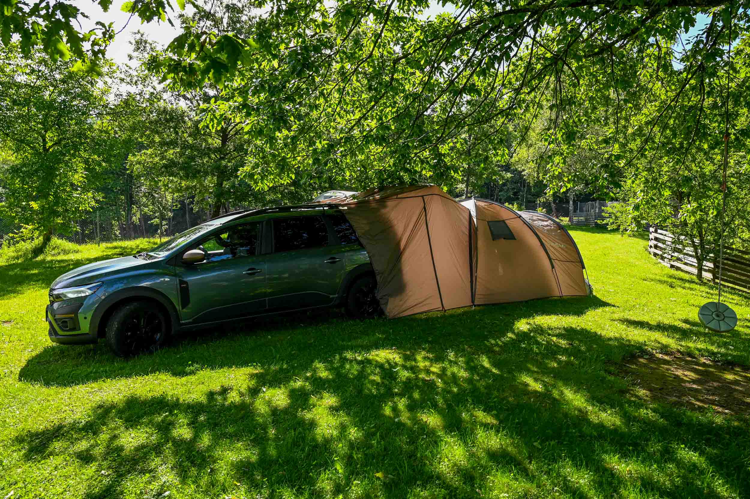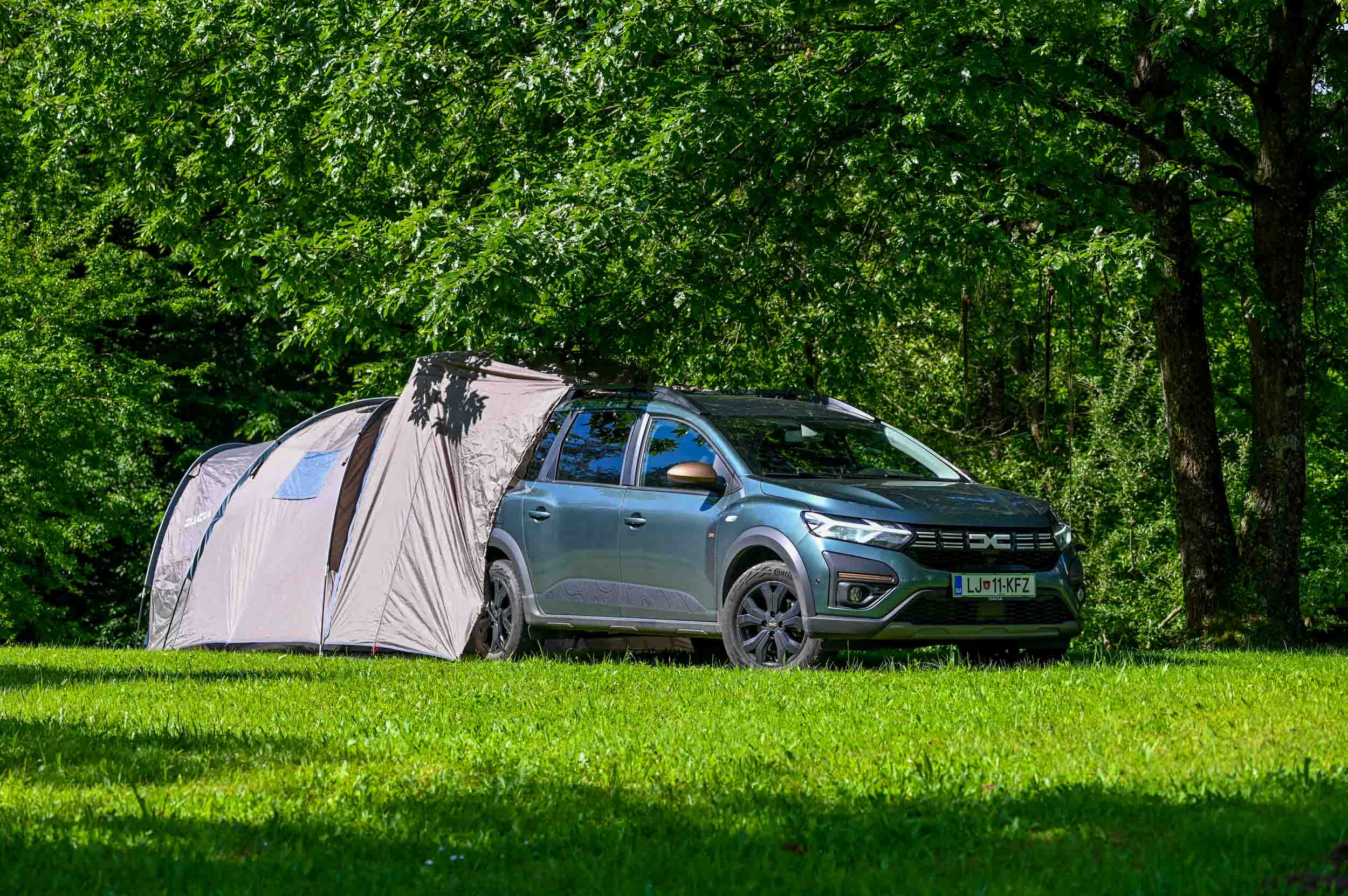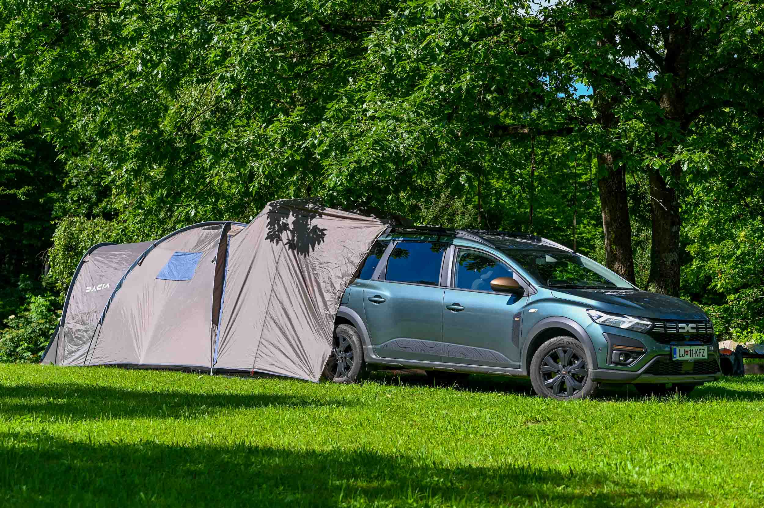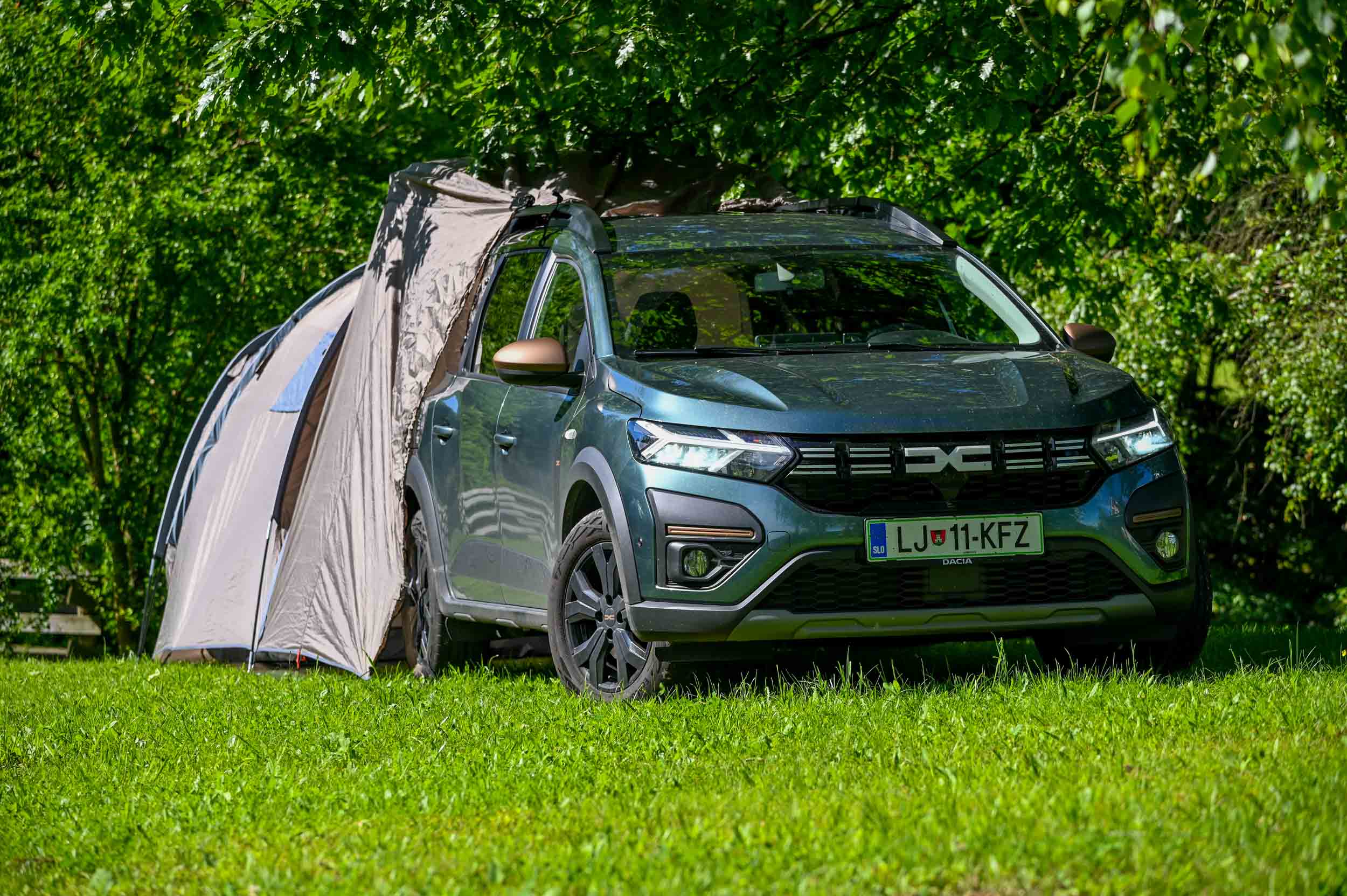 Daleč pred prvim velikoserijskim hibridnim avtodomom iz prave industrije počitniških vozil Dacia na ceste pošilja hibridni avtomobilski bivak, ki v svojem razširjenem oziroma podaljšanem tlorisu ponuja 9 metrov dolgo karoserijsko-šotorsko počitniško “hišico” za 2693 evrov doplačila. Parkirali smo pod čudovitim hrastom in joggerja spremenili v bazni tabor, v katerem se da v kampu z ustrezno infrastrukturo preživeti čisto prave počitnice. Seveda se da spalni paket učinkovito uporabljati tudi brez šotorskega podaljška in to je tudi najslajši del bivaka, dvignjenega od mokrih ali vlažnih tal in diskretno postavljenega čez dve tretjini potniške kabine. Ob tem velja izpostaviti, da je brez šotorskega podaljška jogger navzven čisto običajen avto, ki z ničemer ne sporoča, da je v njem spalna ploščad iz vezane plošče dimenzije 190 x 130 centimetrov. Na tej ploščadi je ležišče iz pene, ki omogoča dovolj udobno spanje dvema odraslima. Na parkirišču ob plaži ali jezeru nihče ne bo vedel, da je v avtu skrit bivak, sploh ker je mogoče na vsa stekla enostavno namestiti gibljive zastore, ukrojene po okvirju stekel. Ti zastori so dovolj gosti, da zasenčijo notranjost in ohranijo diskretnost tega avtomobilskega bivaka.
