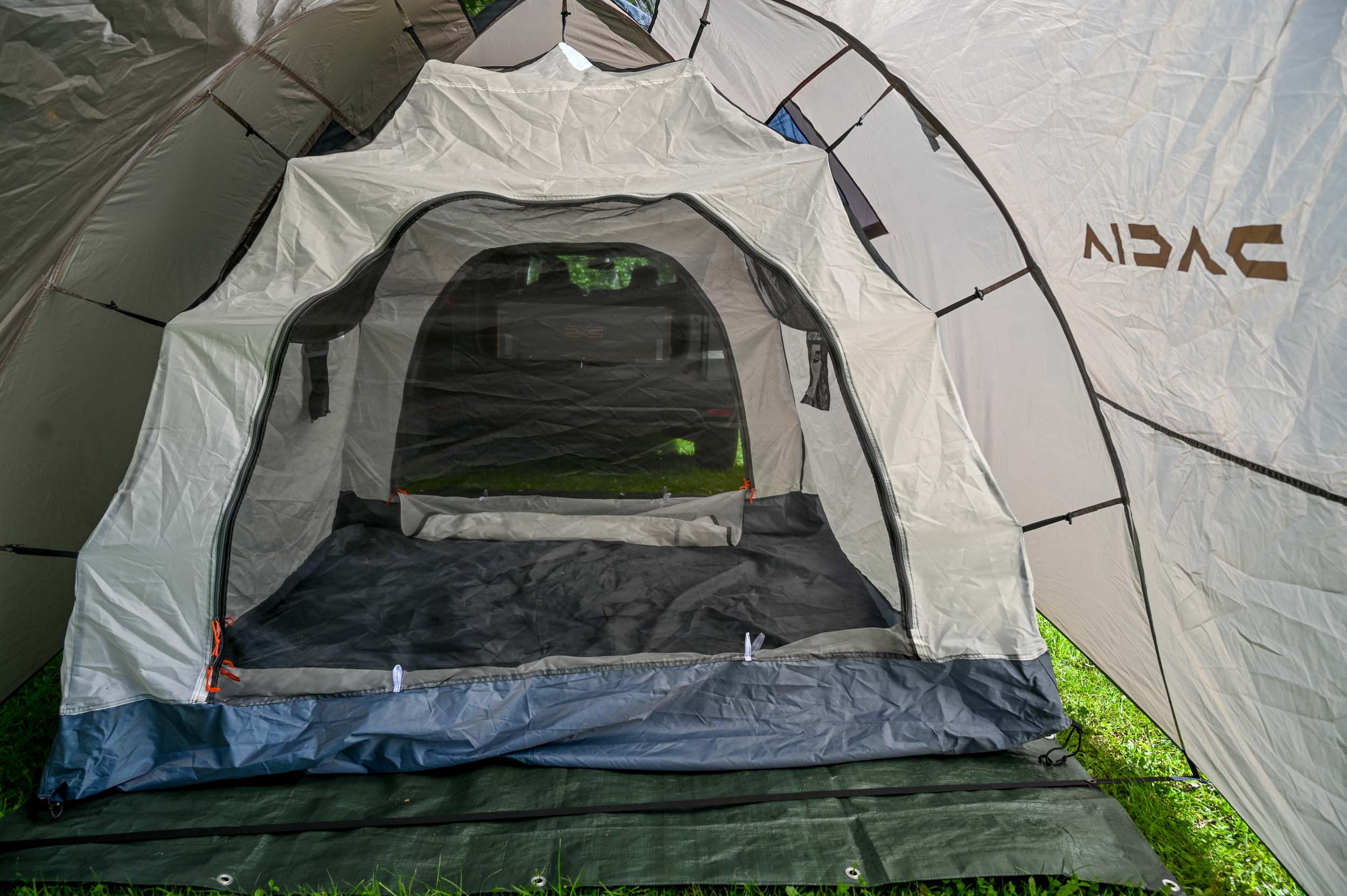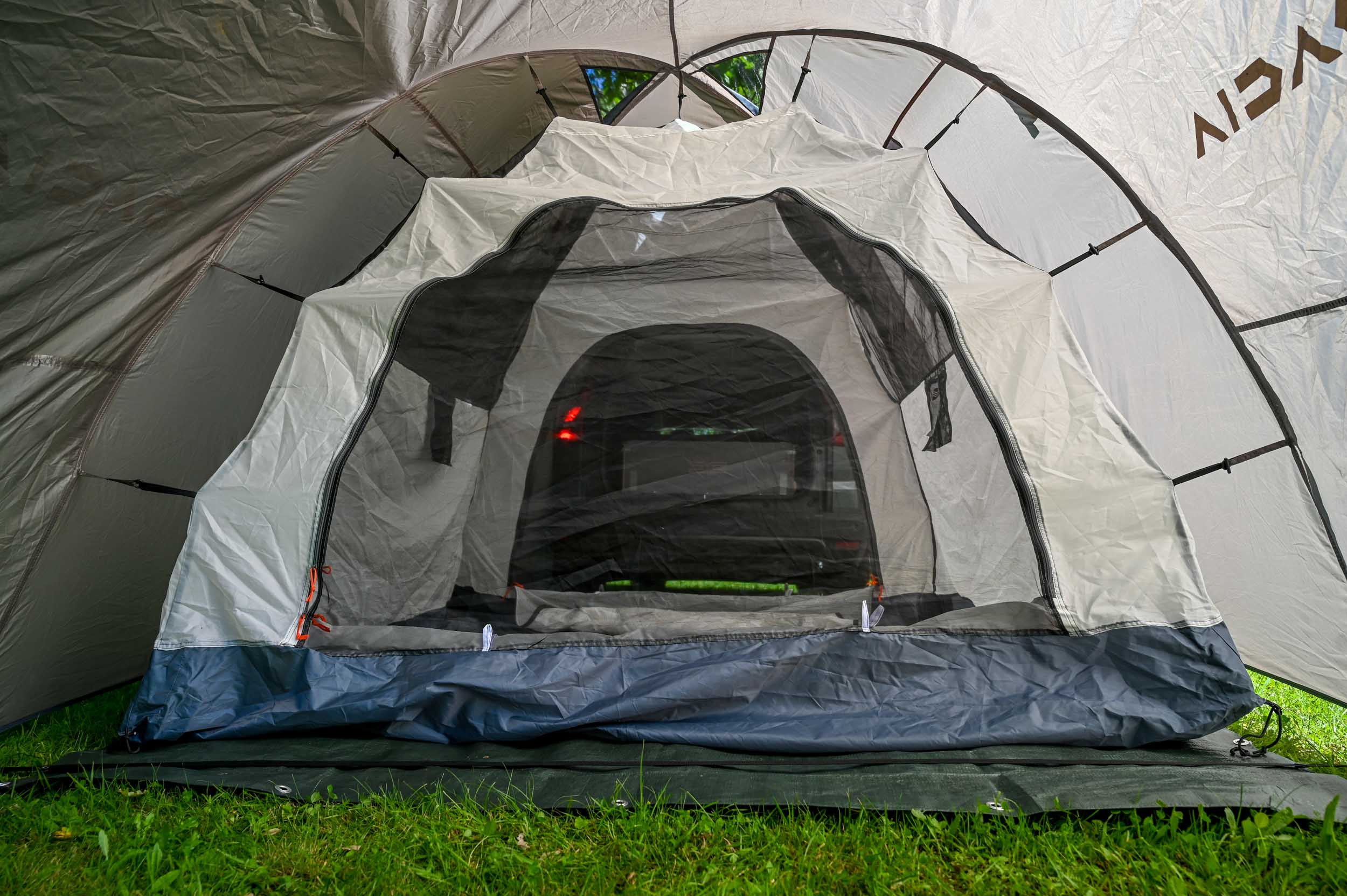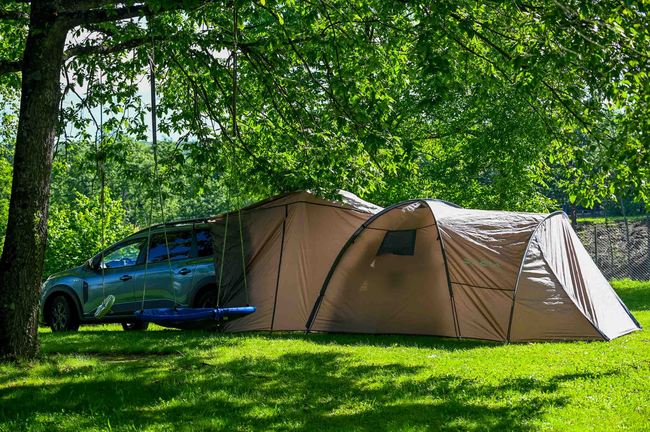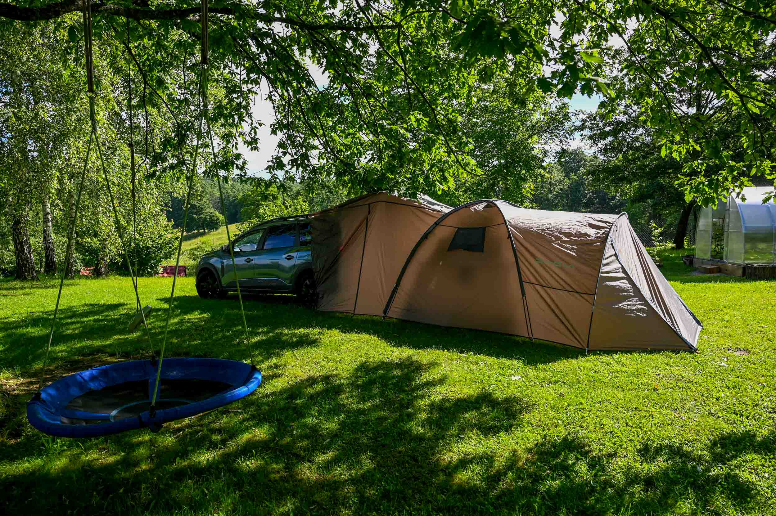 Malce več dela je, če želite karoserijsko spalnico nadgraditi še s šotorskim podaljškom, v katerem lahko prespita še dve osebi. Postavitev in vpetje šotora prek odprtih prtljažnih vrat in zadnjega dela avtomobila, vključno z namestitvijo zateznih trakov in zabijanjem klinov za vetrno stabilizacijo šotora, vzame slabe pol ure časa. A jogger z razpetim šotorom potem postane pravi poletni bazni tabor - celotna kompozicija v dolžino meri skoraj 9 metrov.