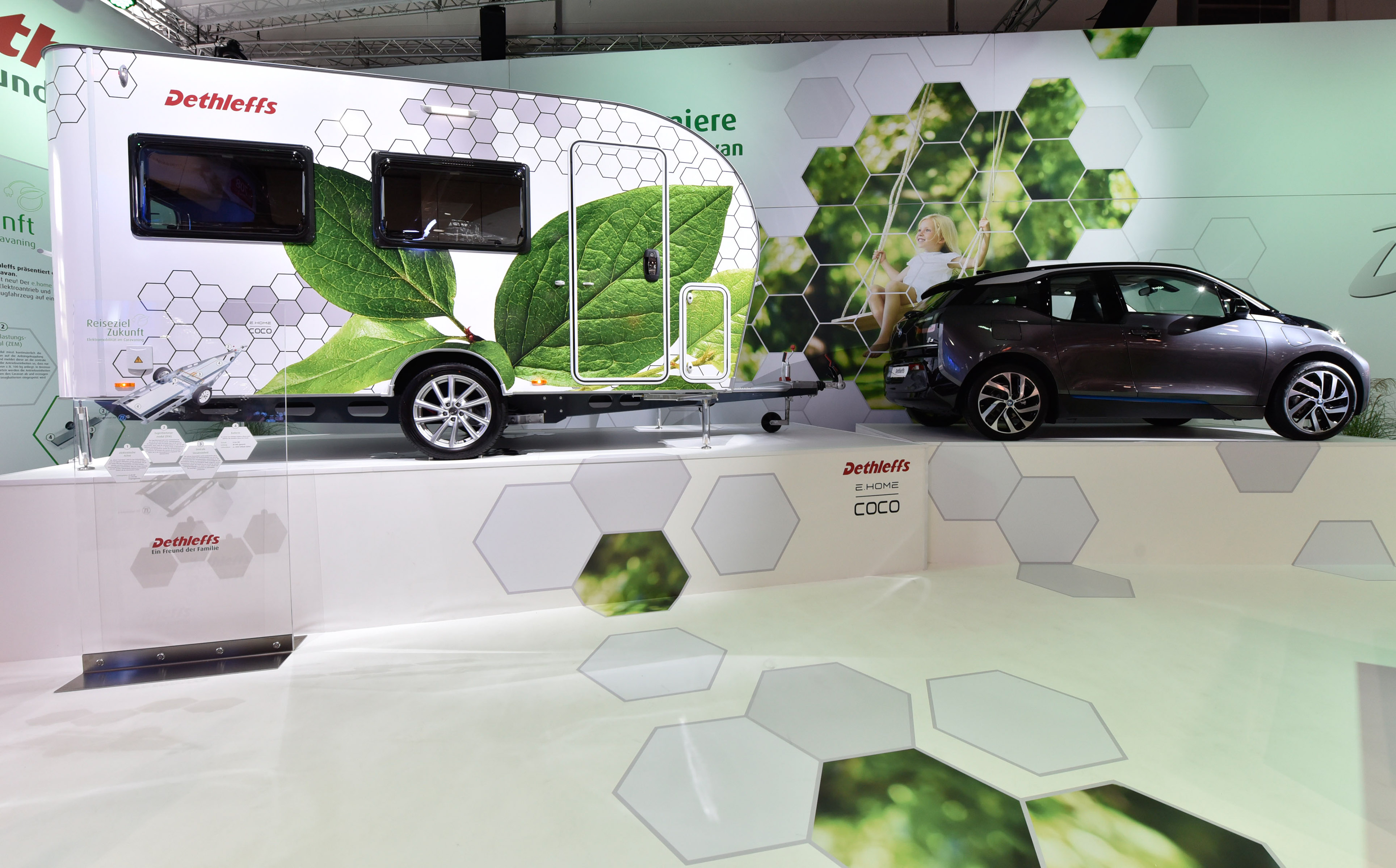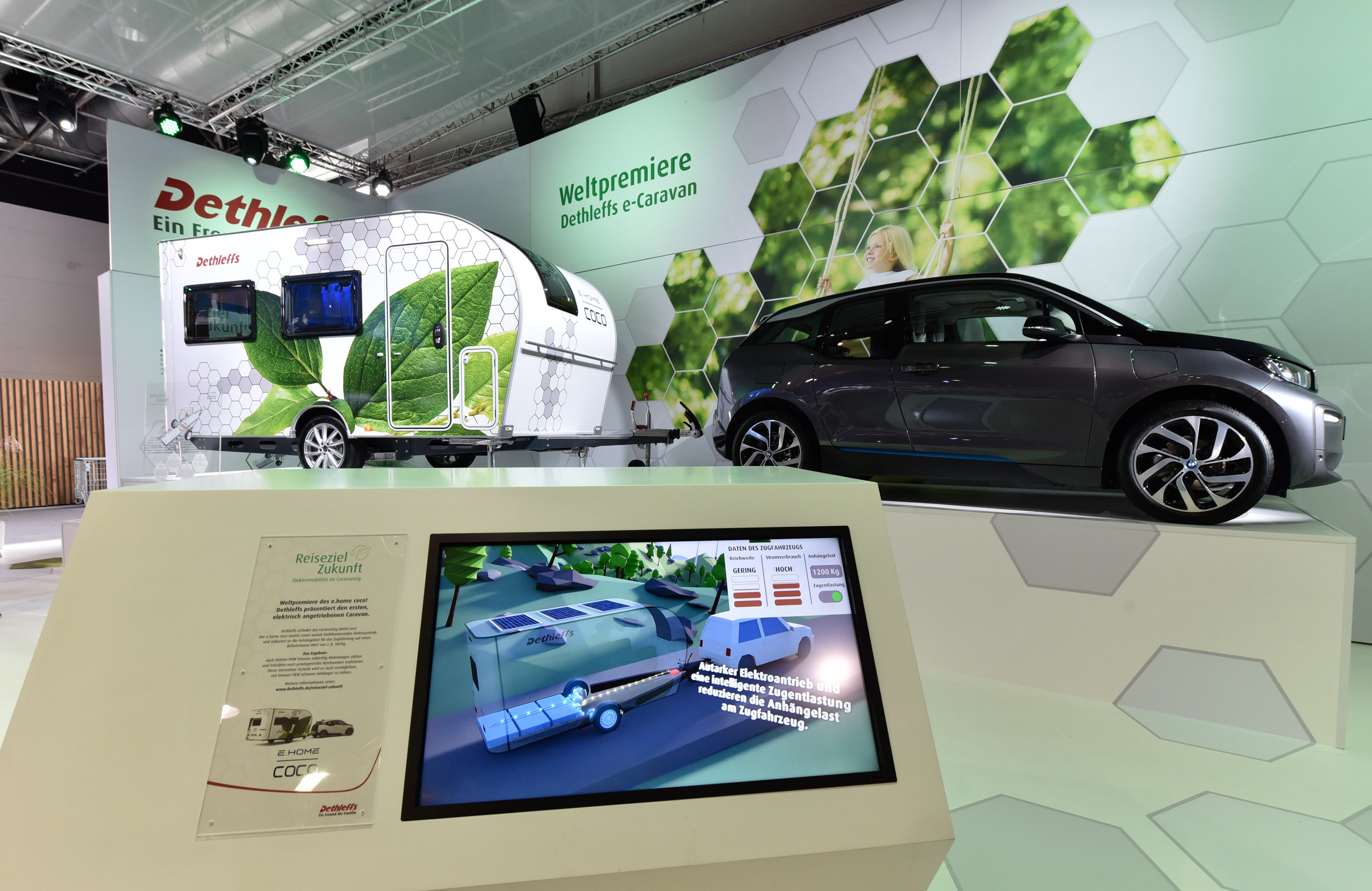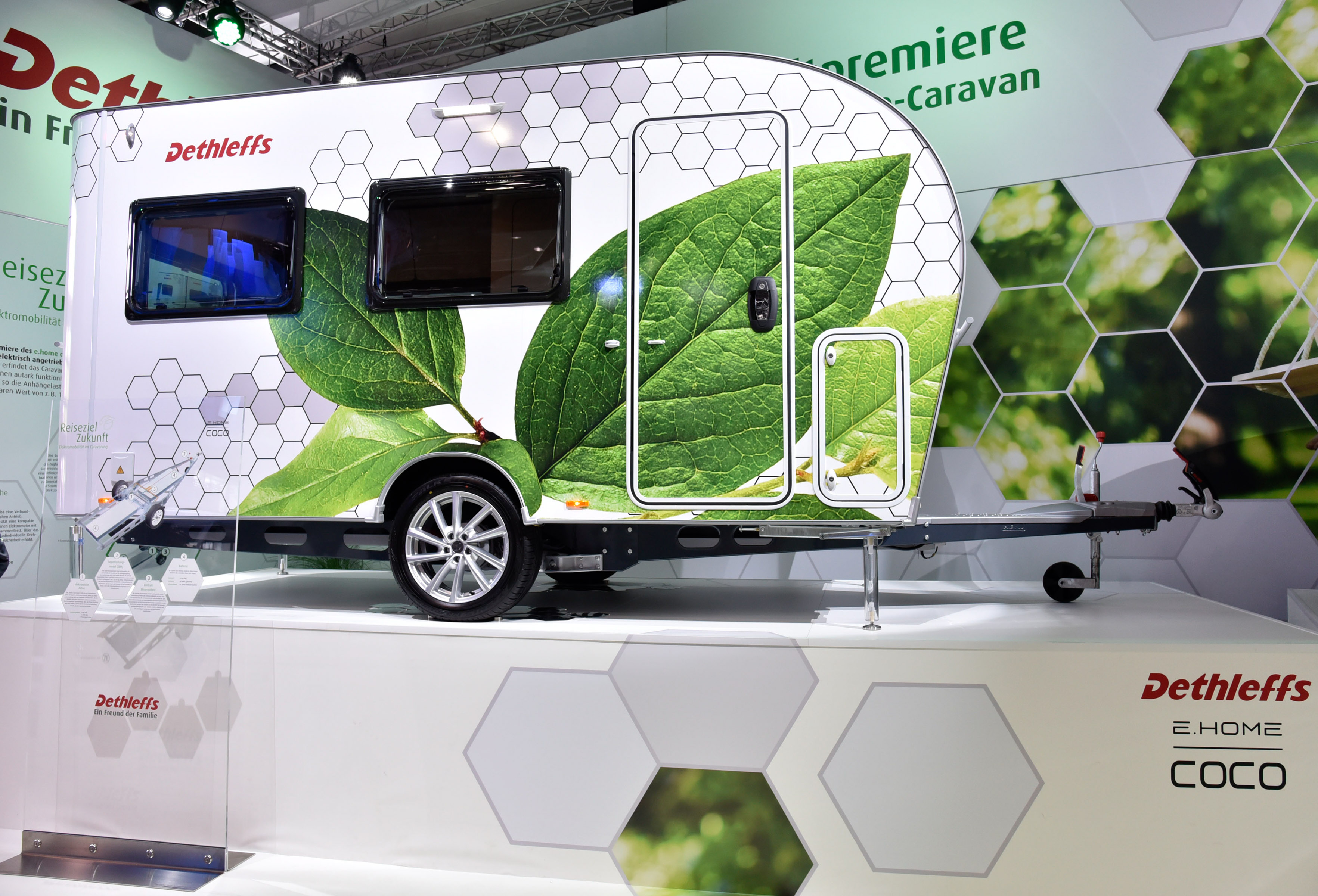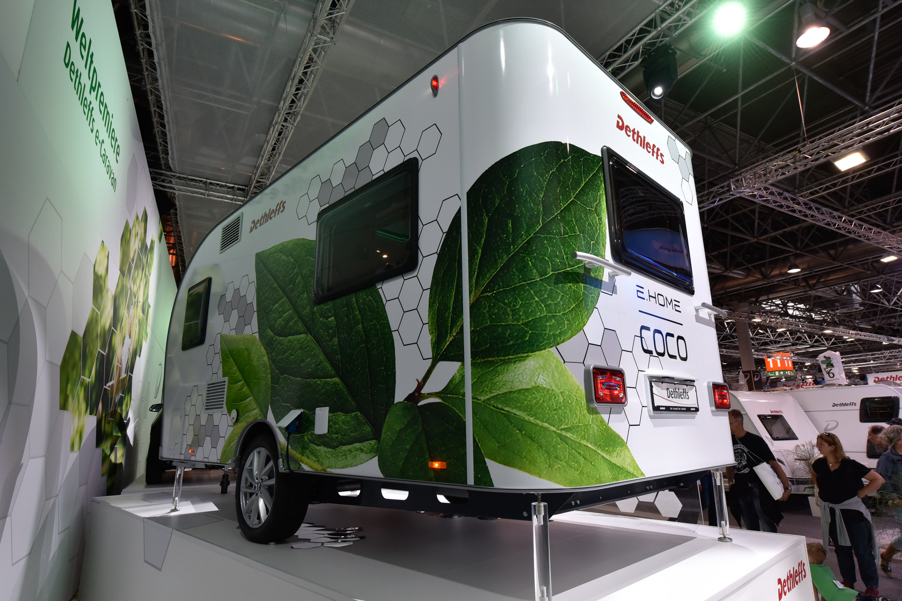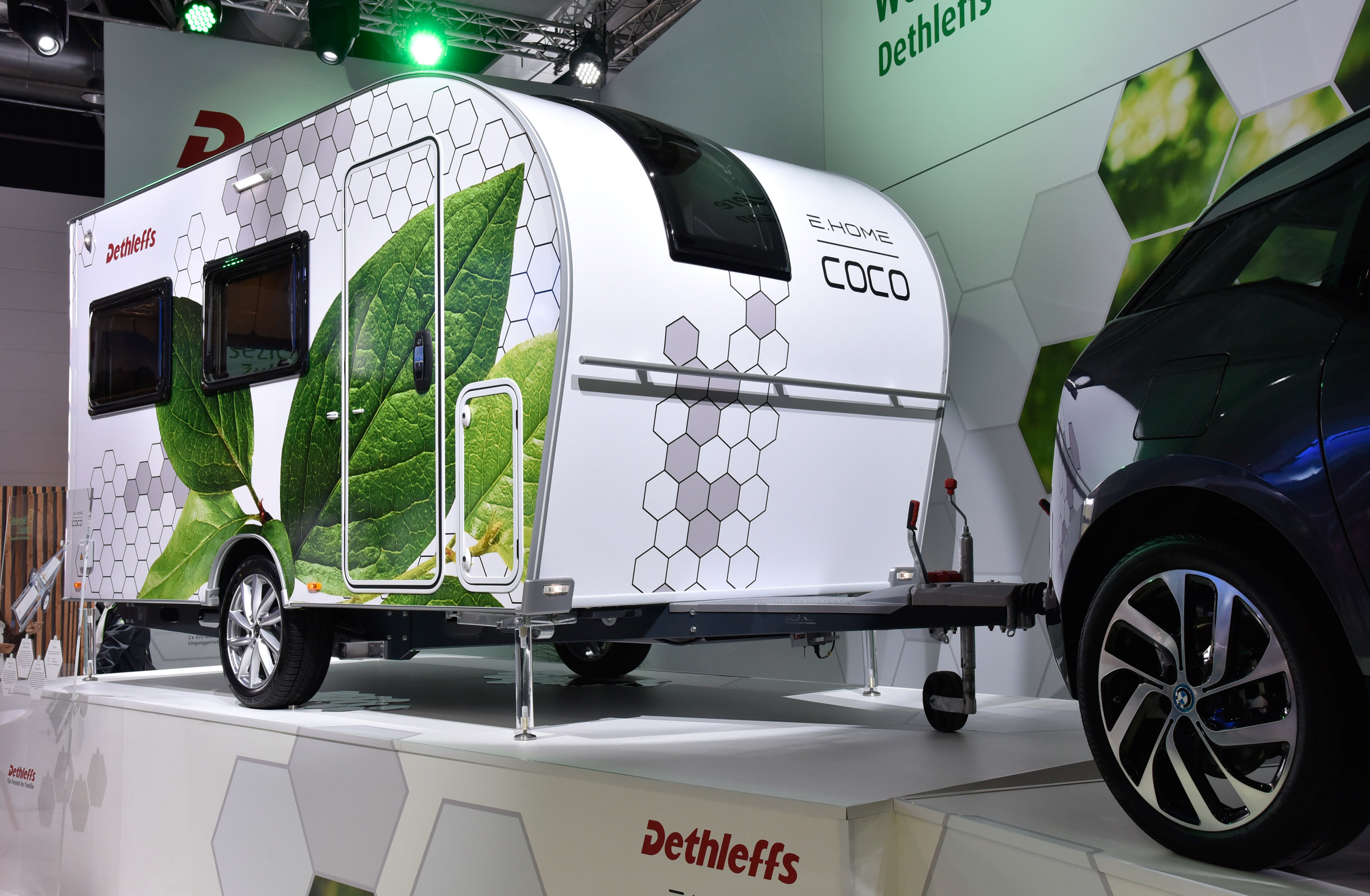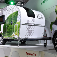 Zanimivo rešitev so predstavili pri Dethleffsu, kjer so predstavili koncept prve počitniške prikolice z lastnim električnim pogonom - e.home coco. V prikolico so vgradili zmogljivejši akumulatorski sklop, dva elektromotorja in pameten elektronski krmilnik. Ta prikolica ni več pasivno vlečeno vozilo, pač pa vozilo z lastnim pogonom, ki pomaga avtomobilu pri vožnji. S tem dosežejo učinek, da v najboljših primerih avto porabi precej manj energije, saj prikolica z lastnim pogonom precej zmanjša potrebno moč za vleko. Tudi manjši avtomobili bi na tak način lahko vlekli večje in težje prikolice.
