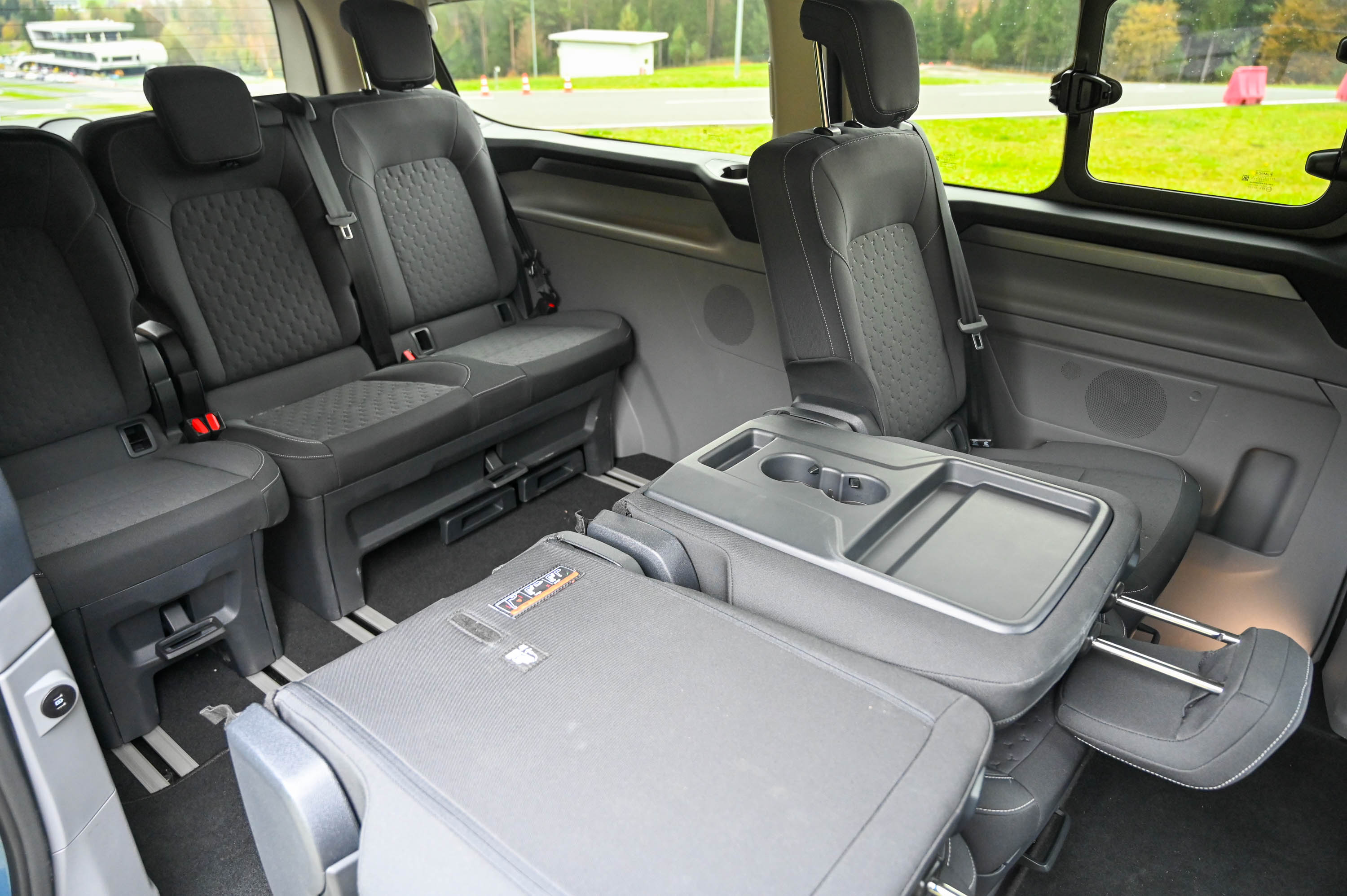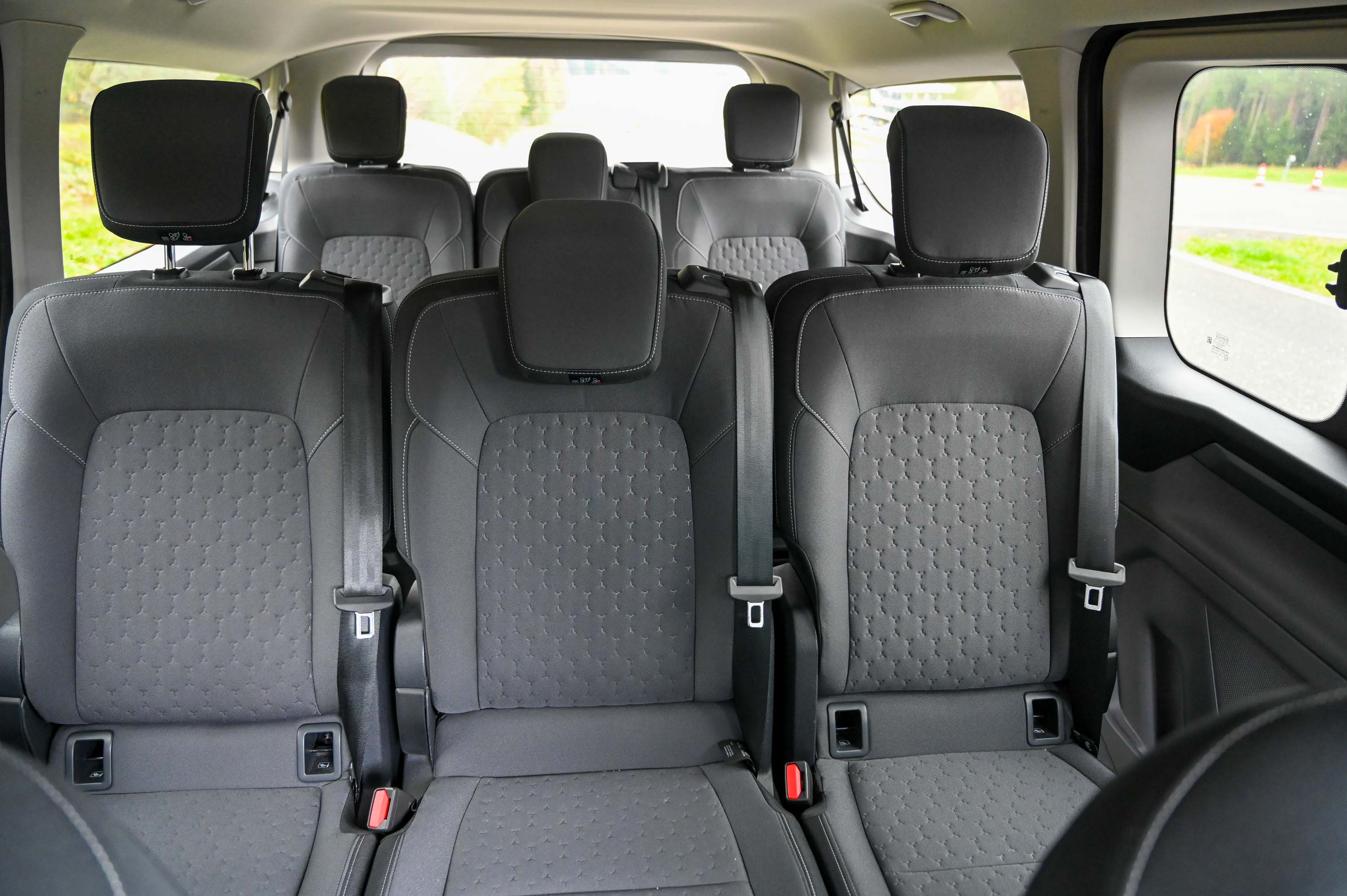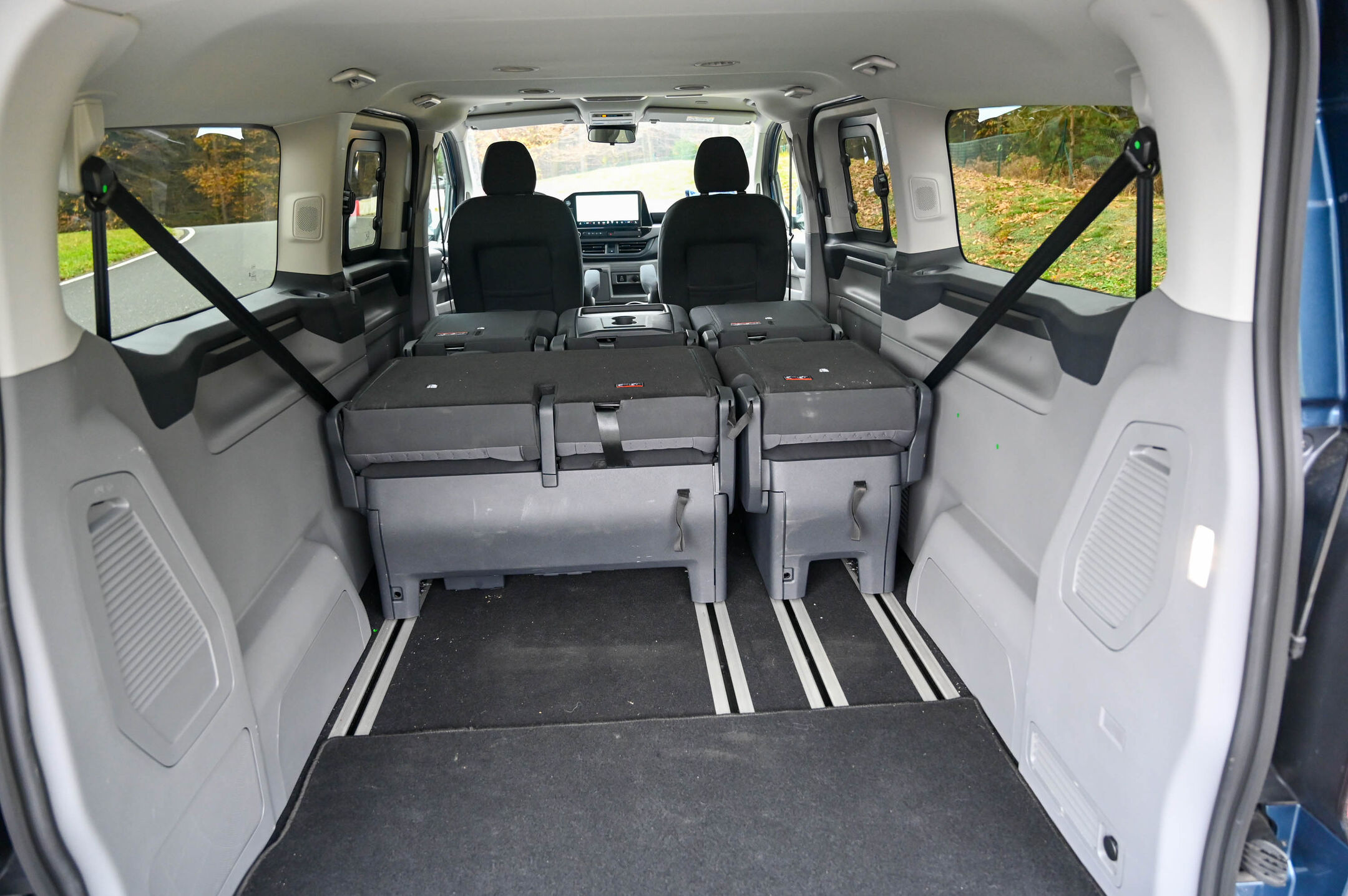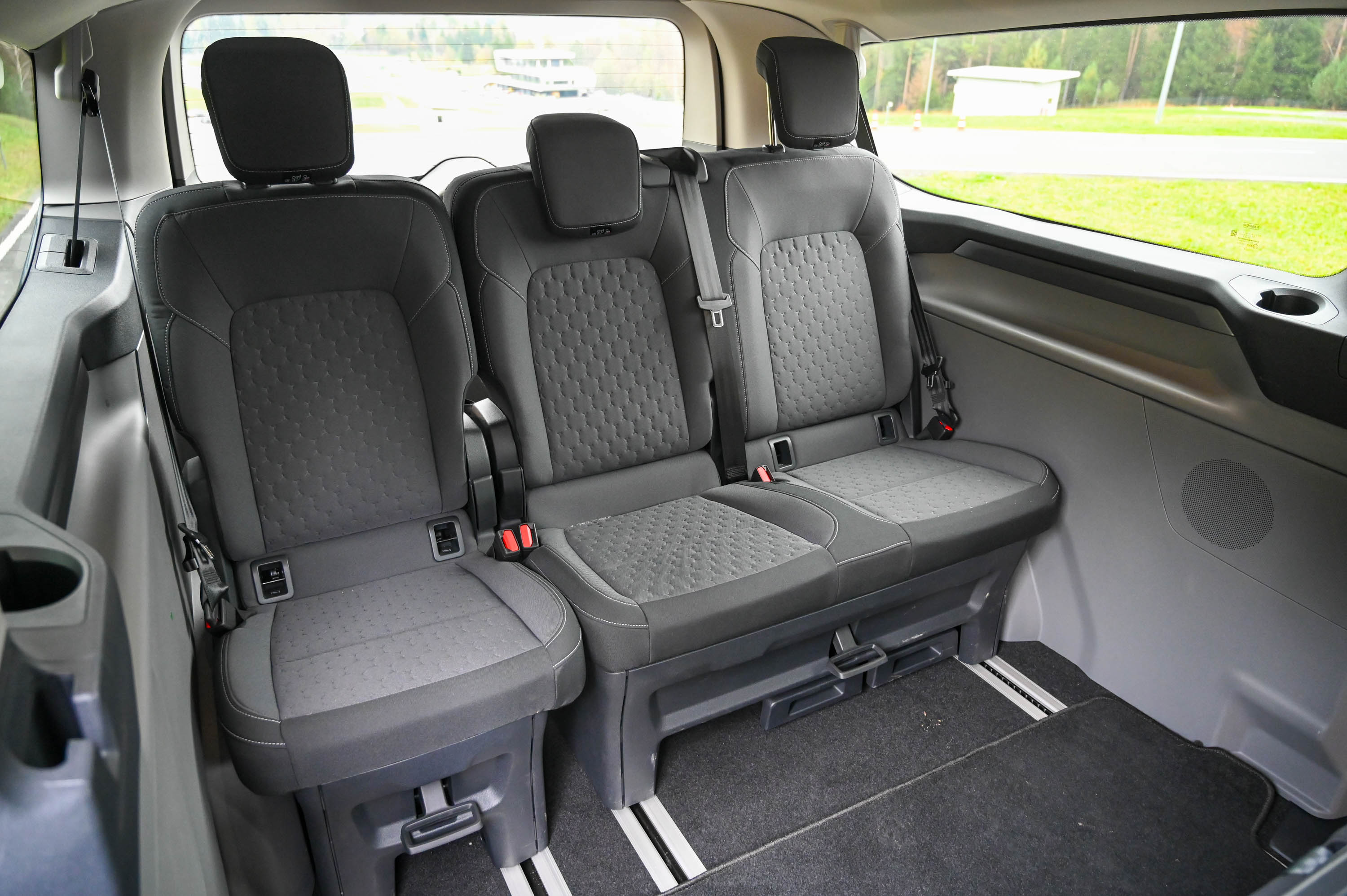Ključni talent, ki hkrati močno izoblikuje še značaj tega vozila, je seveda velika prilagodljivost bogato odmerjenega prostora za potnike in prtljago. Medosna razdalja je dolga kar 3,5 metra. Ob vozniškem je na voljo še 7 sedežev, med katerimi so štirje opremljeni z lahko dostopnimi sidrišči isofix za pritrjevanje otroških sedežev. Sedeži srednje vrste so v talna vodila vpeti posamezno, v tretji vrsti pa je dvosedežna klop in še en posamičen sedež. Celoten sedežni tloris je na vodilih izjemno enostavno mogoče prilagajati glede na število potnikov oziroma tovorne zahteve. Vseh šest sedežev zadaj ima zložljiva naslonjala, sredinski sedeži pa na hrbtni strani še trdo plastično oblogo z držali za pijačo, ki postane priročna miza. Vseh šest sedežev je mogoče tudi razmeroma enostavno odstraniti iz avtomobila, kar pomeni, da tak potniški kombi hitro postane zastekljen furgon s petimi kubiki prostora in tovornim prostorom dolgim dobre tri metre. Zato je tak podaljšan tourneo custom s prilagodljivimi sedeži lahko z malce iznajdljivosti tudi odličen bivalni potovalnik za dva. V petsedežni postavitivi je denimo prtljažni prostor že tako velik in dolg, da je vanj mogoče zapeljati vsaj dve gorski kolesi. Tudi ob vseh treh sedežnih vrstah pa v prtljažniku ostane dovolj prostra za srednje velik pasji boks in cel kup prtljage. Zelo priročen je tudi nizek nakladalni rob, ki je od tal oddaljen dobrega pol metra.