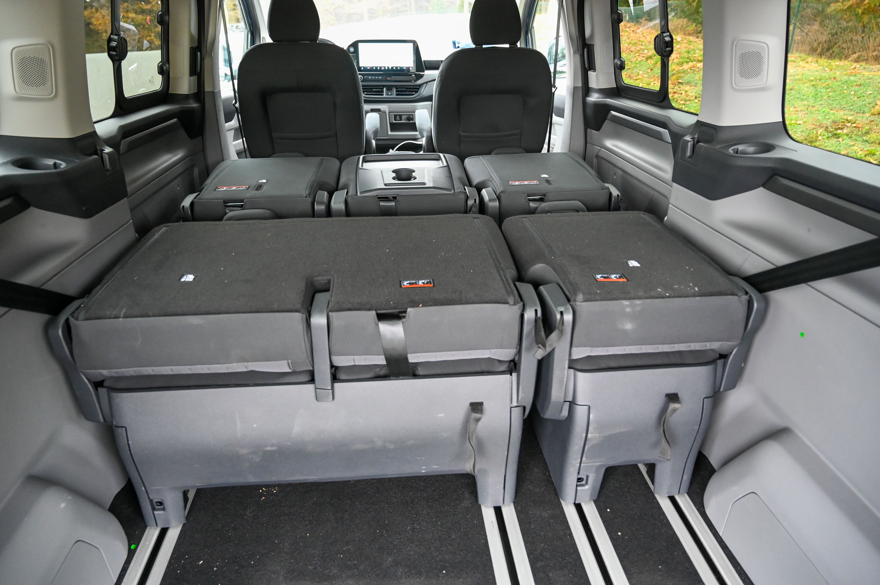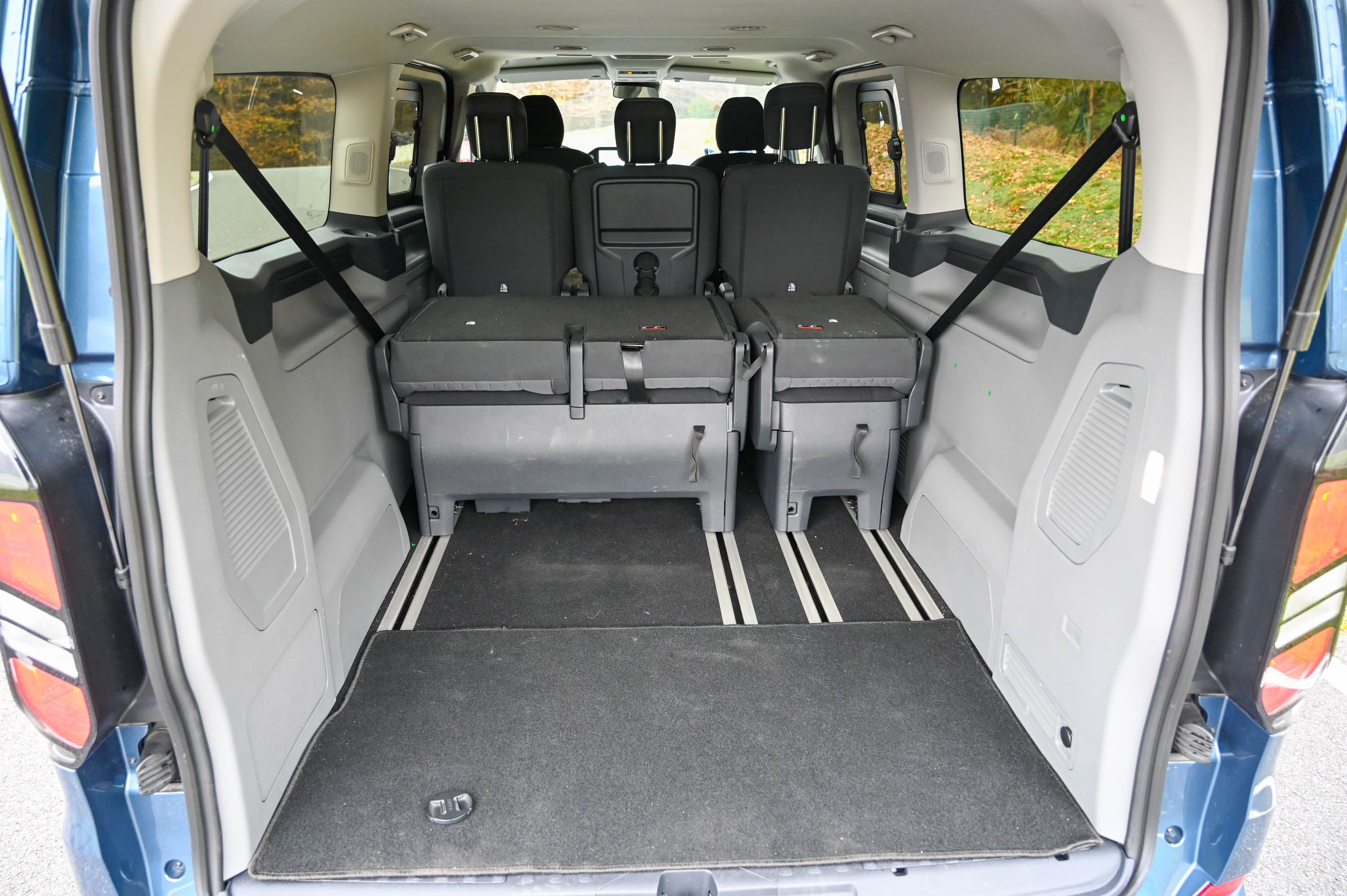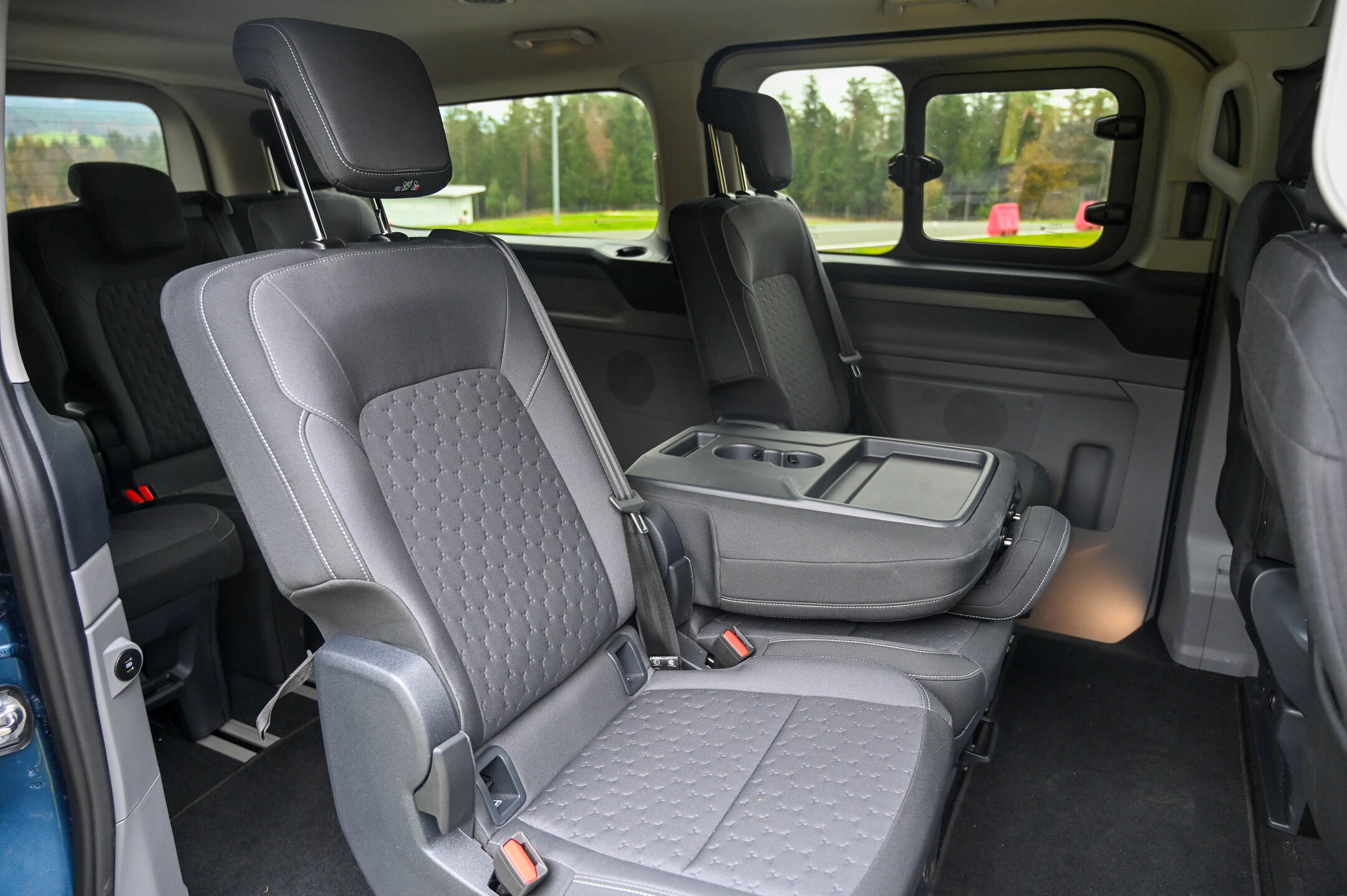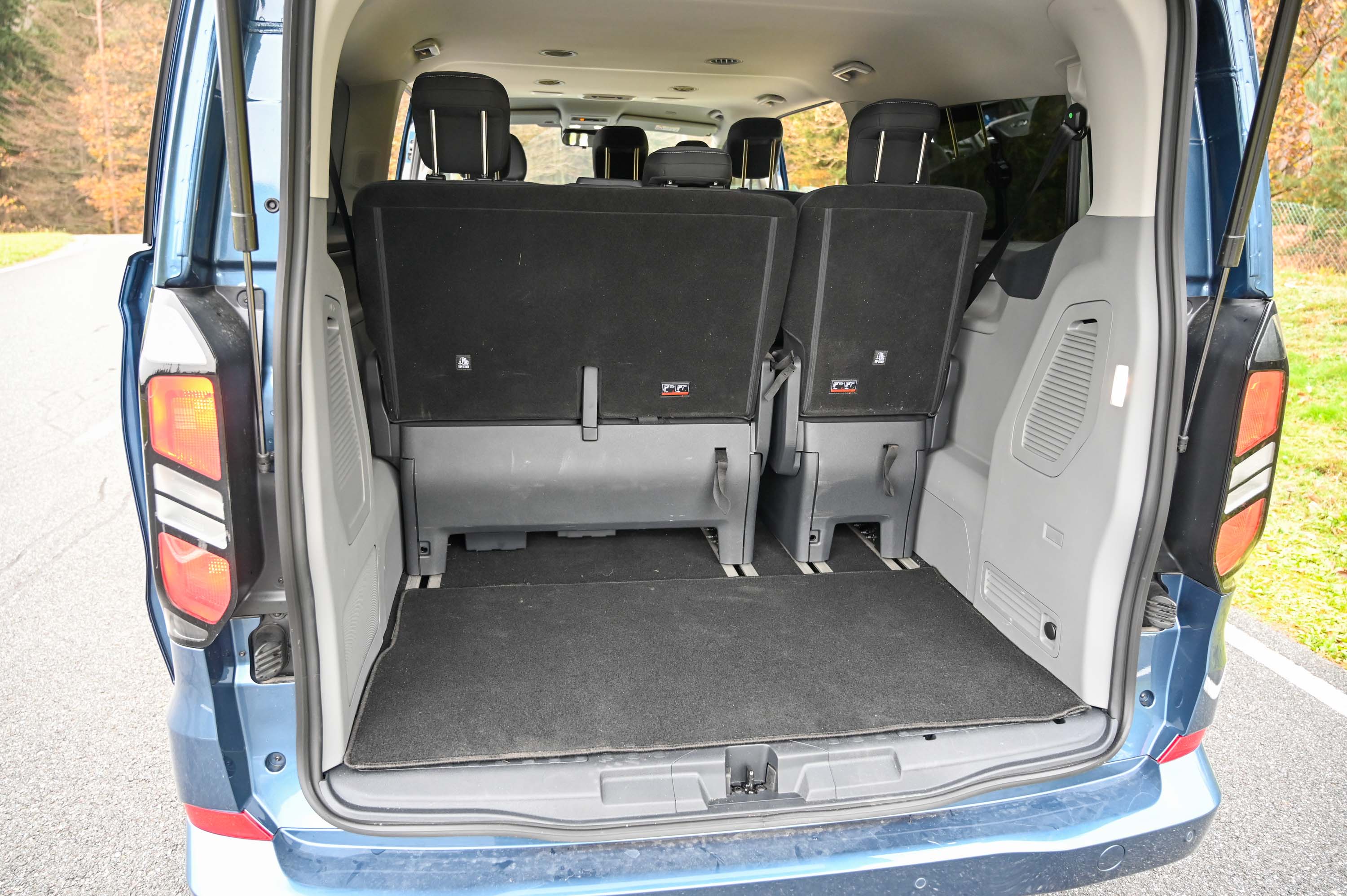 Ključni talent, ki hkrati močno izoblikuje še značaj tega vozila, je seveda velika prilagodljivost bogato odmerjenega prostora za potnike in prtljago. Medosna razdalja je dolga kar 3,5 metra. Ob vozniškem je na voljo še 7 sedežev, med katerimi so štirje opremljeni z lahko dostopnimi sidrišči isofix za pritrjevanje otroških sedežev. Sedeži srednje vrste so v talna vodila vpeti posamezno, v tretji vrsti pa je dvosedežna klop in še en posamičen sedež. Celoten sedežni tloris je na vodilih izjemno enostavno mogoče prilagajati glede na število potnikov oziroma tovorne zahteve. Vseh šest sedežev zadaj ima zložljiva naslonjala, sredinski sedeži pa na hrbtni strani še trdo plastično oblogo z držali za pijačo, ki postane priročna miza. Vseh šest sedežev je mogoče tudi razmeroma enostavno odstraniti iz avtomobila, kar pomeni, da tak potniški kombi hitro postane zastekljen furgon s petimi kubiki prostora in tovornim prostorom dolgim dobre tri metre. Zato je tak podaljšan tourneo custom s prilagodljivimi sedeži lahko z malce iznajdljivosti tudi odličen bivalni potovalnik za dva. V petsedežni postavitivi je denimo prtljažni prostor že tako velik in dolg, da je vanj mogoče zapeljati vsaj dve gorski kolesi. Tudi ob vseh treh sedežnih vrstah pa v prtljažniku ostane dovolj prostra za srednje velik pasji boks in cel kup prtljage. Zelo priročen je tudi nizek nakladalni rob, ki je od tal oddaljen dobrega pol metra.
