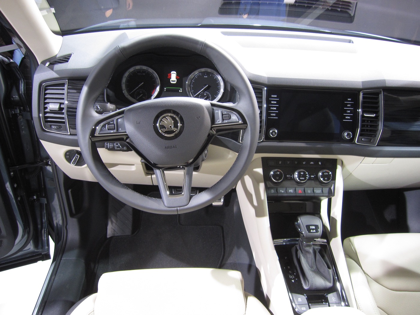 Voznikovo delovno okolje je vzorno urejeno. Klasična instrumentna plošča je pregledna, na sredini armaturne plošče je velik zaslon za dodatne informacije in prikaz navigacije, zaslonu pred sovoznikom, ki je bil v prototipu kodiaqa, pa so se v serijskem avtu pričakovano odrekli. Odprtine za prezračevanje so ozke in visoke.