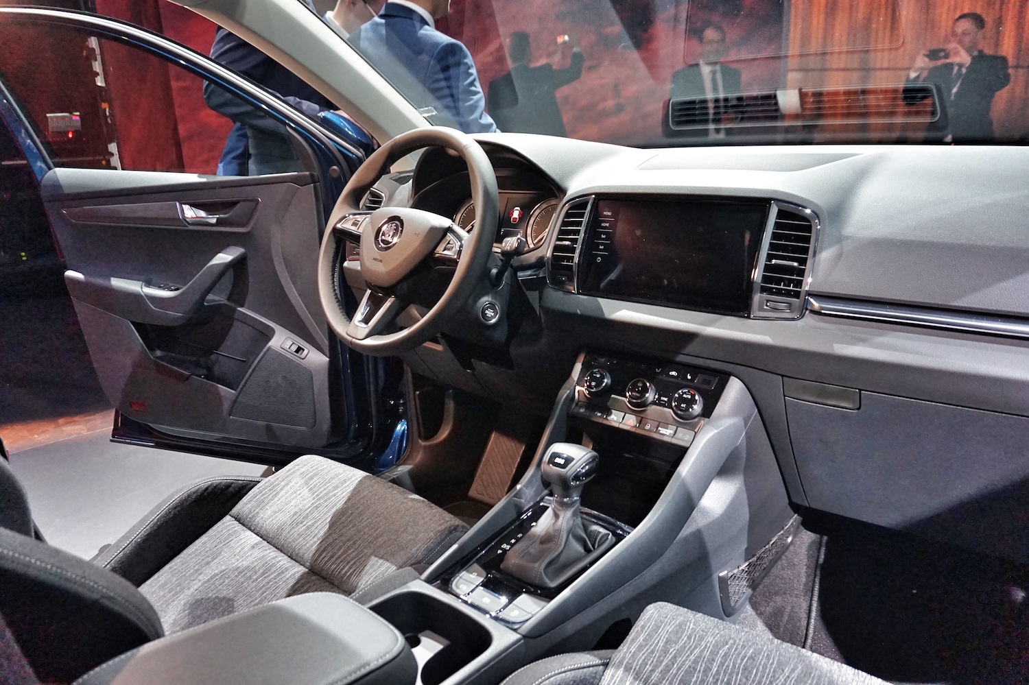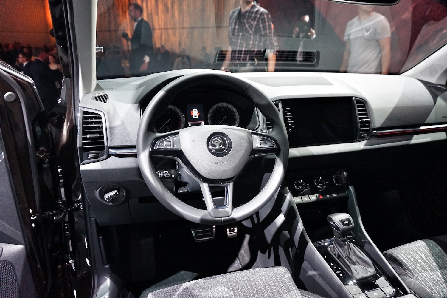 Notranjost karoqa so Škodini oblikovalci malce oddaljili od kodiaqove, a ne preveč; zaslon multimedijskega sistema je malce manjši, a nič manj uporaben, glavni sklopi stikal in gumbov pa so tam, kjer smo pri škodah (in volkswagnih) že vajeni – blizu rok. Velika novost tako za karoqa kot tudi za Škodo je digitalni sklop merilnikov, ki bo na voljo za doplačilo. Od varnostnih in voznih pripomočkov velja omeniti radarski tempomat, prepoznavanje pešcev, samodejno zaviranje v sili in sistem za ohranjanje vozne smeri, pa tudi samostojno vožnjo v zastojih, samodejno parkiranje in nekaj drugih pripomočkov, ki smo jih vajeni iz večjih avtomobilov.