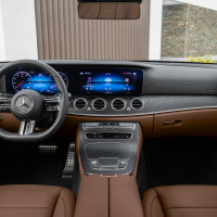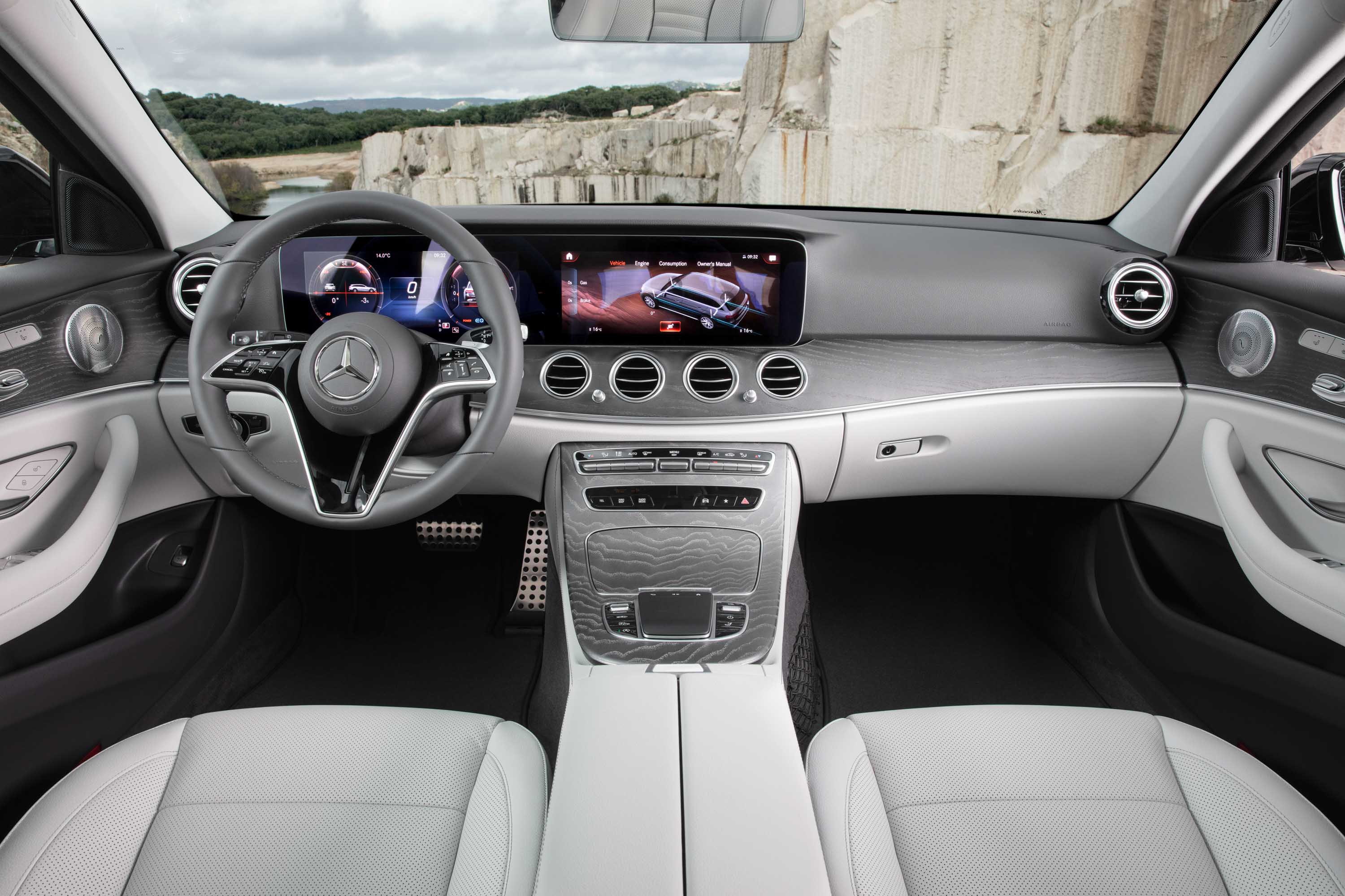 Nekaj novosti je tudi v potniški kabini, saj so na voljo novi materiali in barvne kombinacije. Najbolj vpadljiv pa je na novo oblikovan volan, ki je na voljo v usnju ali v superšportni izvedbi. A ne gre le za novo obliko, temveč celotno zasnovo volana s kapacitivno plastjo, ki prepozna, če voznikove roke držijo volan. Na volanu ni več gumbov, temveč plošča, na kateri voznik s pritiskom prsta in drsanjem izbira upravlja različne funkcije ali izbira prikaz podatkov. V razredu E so se poslovili klasični merilniki, saj sta v avtu že v osnovni opremi dva 10,25 palčna zaslona, za doplačilo pa 12,3 palčna, na katerih voznik dobi vse podatke. Posodobljen je tudi MBUX multimedijski sistem. V prenovljenem razredu E so na voljo nekateri novi asistenčni sistemi, tako da je tudi po tej plati avto v koraku s časom.