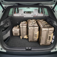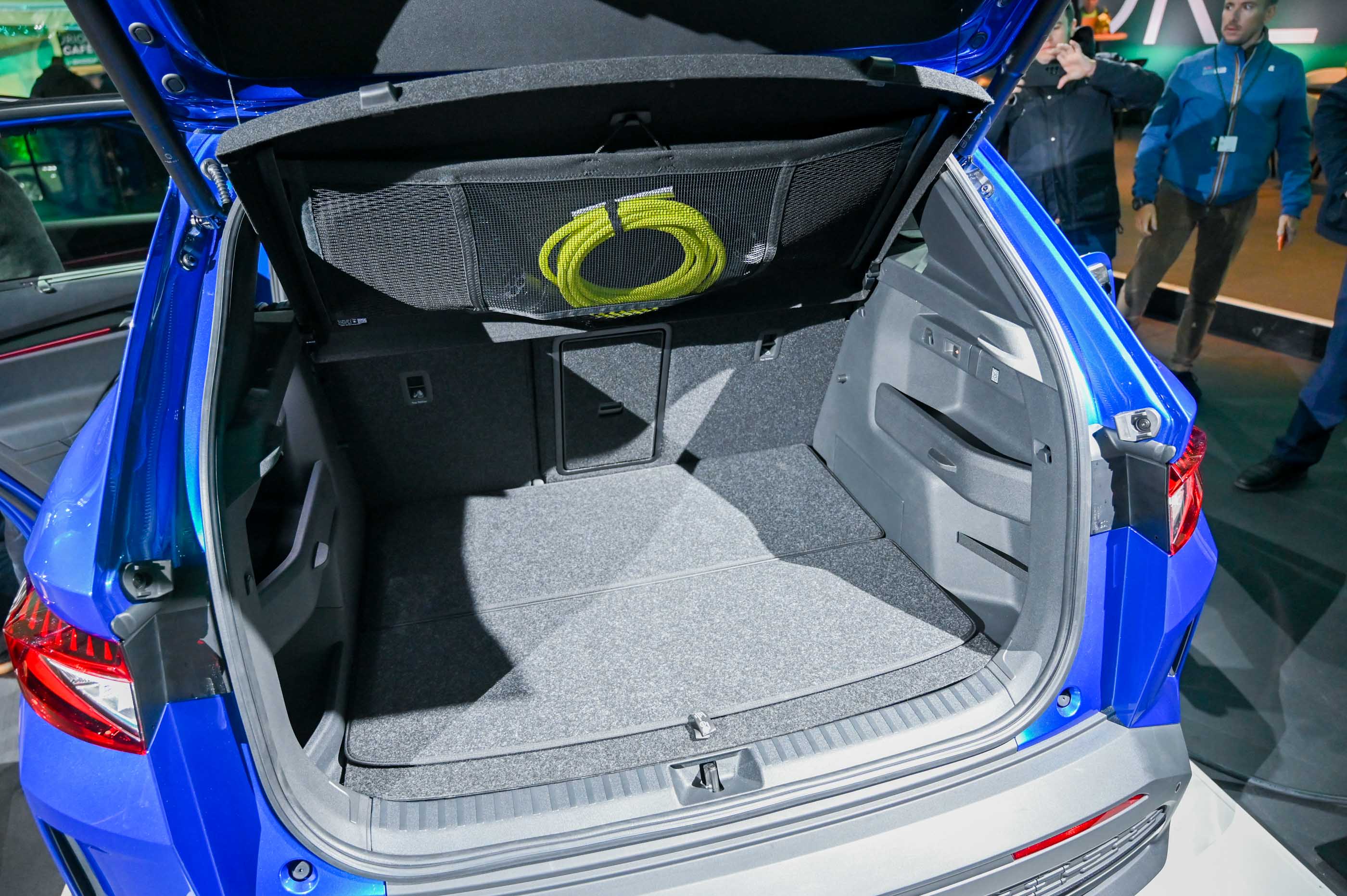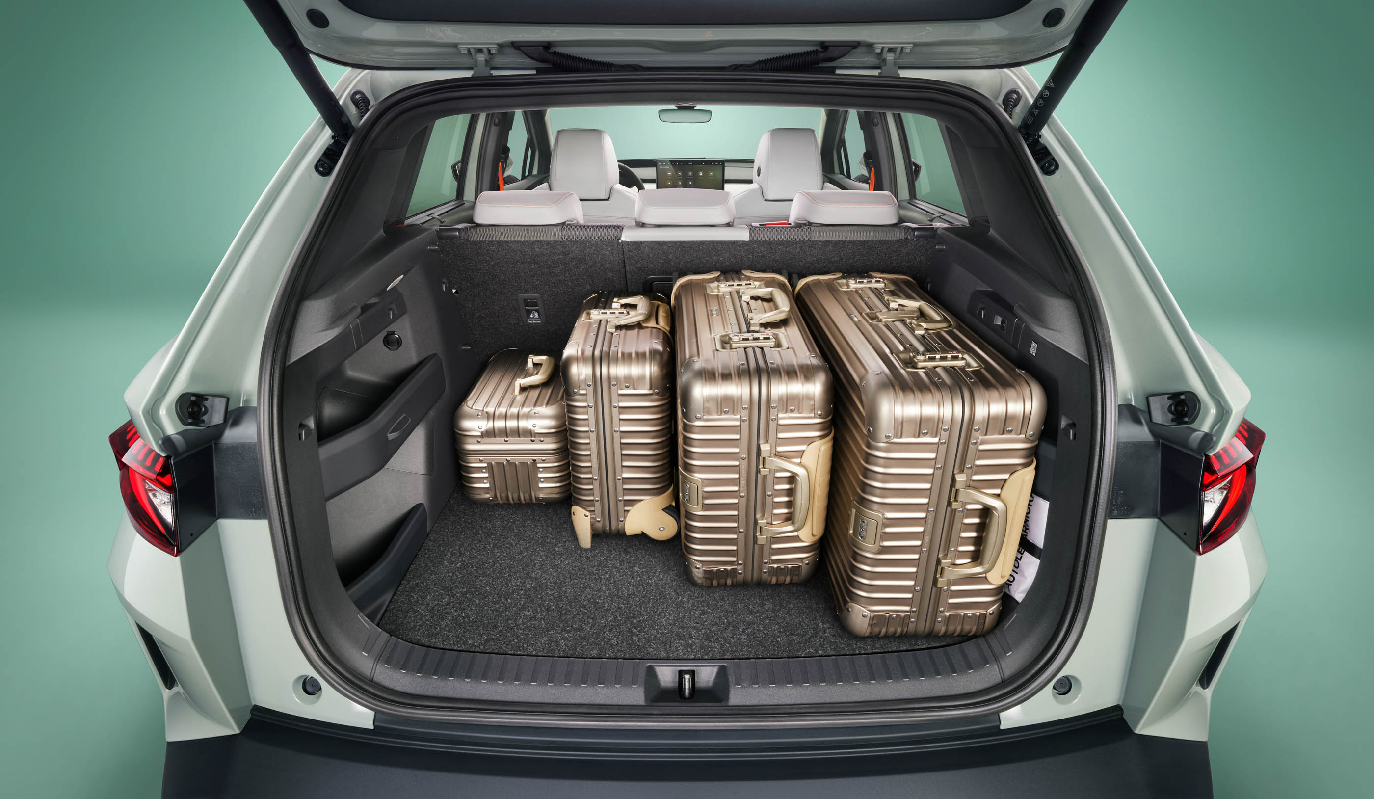 A Škodini inženirji in oblikovalci so iz te koncernske arhitekture oziroma razredne dolžine do 4,5 metra znova potegnili največ kabinskega in prtljažnega prostora. Nova oblika še vedno najprej sledi uporabnosti. 448,8 cm dolg elorq je le 9,6 cm daljši od karoqa, a ob tem ponuja 12,8 cm daljšo medosono razdaljo, ki znaša dobrega 2,7 metra (276,6 cm). Na vseh sedežih je zato dovolj prostora za glave in kolena. Sedežni položaj je zaradi dvojnega dna, v katerem je nameščen pogonski akumulator s pametnim termičnim nadzorom, ki vključuje tudi predgretje, še nekoliko višji kot pri karoqu in tako je vstopanje v avto še bolj udobno. V primerjavi s svojim bencinskim bratom je elroq v minusu le po prostornini prtljažnika. Zaradi nad osjo zadaj nameščenega električnega motorja je prtljažnik malce bolj plitev, kar pomeni 51 litrov manj kot v karoqu. Kljub temu pa osnovna prostornina prtljažnika še vedno znaša družinsko uporabnih 470 litrov. Poleg tega je odlično opremljen s praktičnimi rešitvami. Pod trdo prtljažno polico, ki jo je mogoče postaviti na dveh višinah, je nameščena mreža za shranjevanje polnilnih kablov, na voljo je še prilagodljivo dno in seveda skrito strgalo za led. Ker elroq nima vratic za točenje goriva, so strgalo za led namestili v okvir prtljažnih vrat. V voznikovih vratih pa ostaja predal z dežnikom.