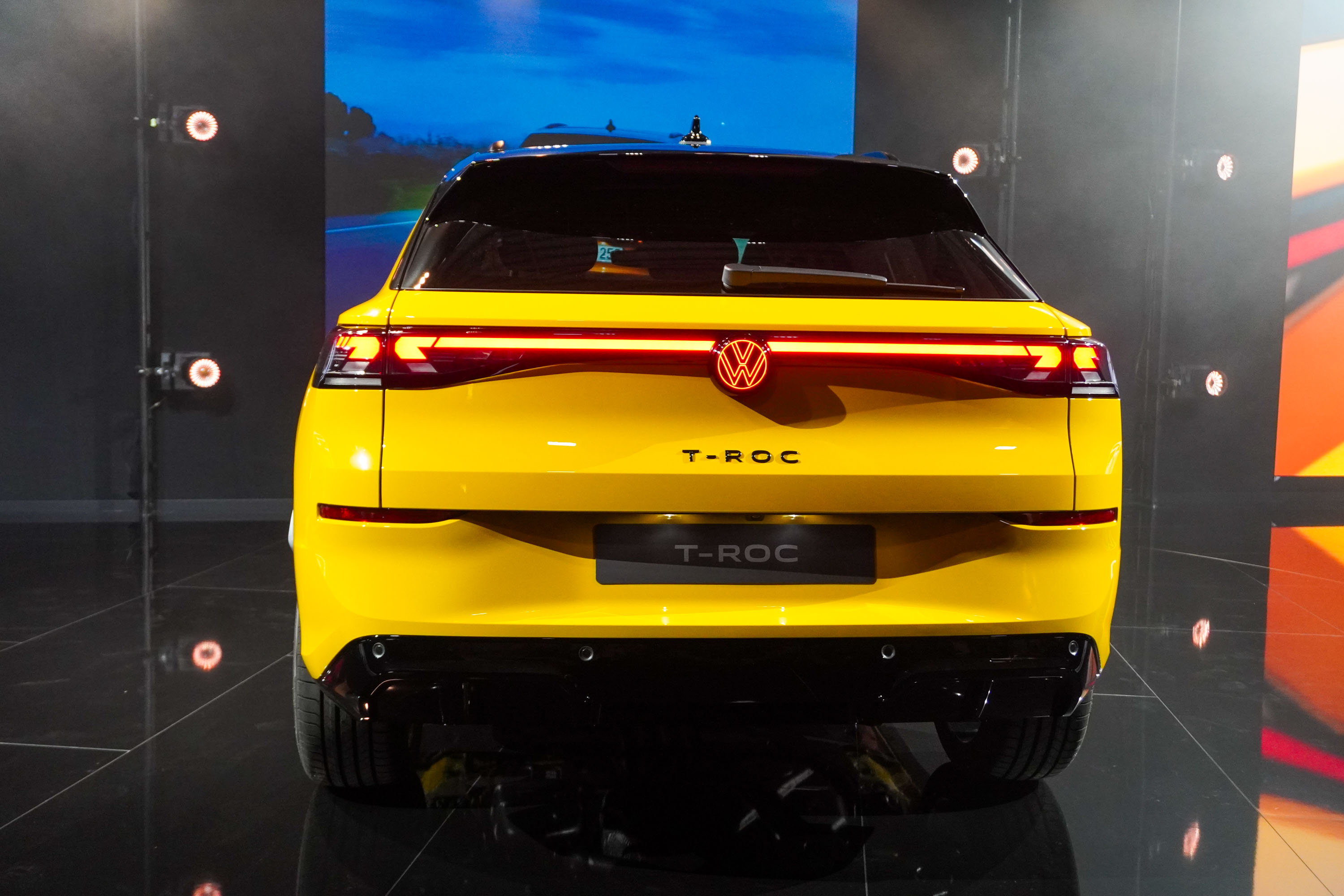 Novi T-roc je zadržal prepoznavno obliko, ki jo poudarja obroba nad vrati, ki jo pri VW imenujejo hokejska palica. Pokrov motornega prostora je postavljen precej višje, da ga voznik izza volana dobro vidi - kot pri cestnih terencih. Seveda je avto dobil novo prednjo masko, ki je lahko, tako kot tudi obrobe okrog odprtin za kolesa, v črni mat ali pa črni svetleči plastiki. Žarometa sta ozka in sta v najboljši opremi matrična z 12 diodami za dolge luči, na voljo pa so tudi običajni LED in celo klasični projektorski žarometi. Žarometa sta lahko povezana s svetlečim trakom, ki ga na sredini prekinja osvetljen VW logotip, torej z elementom, ki ga je VW sprva namenil zgolj električnim avtom.
