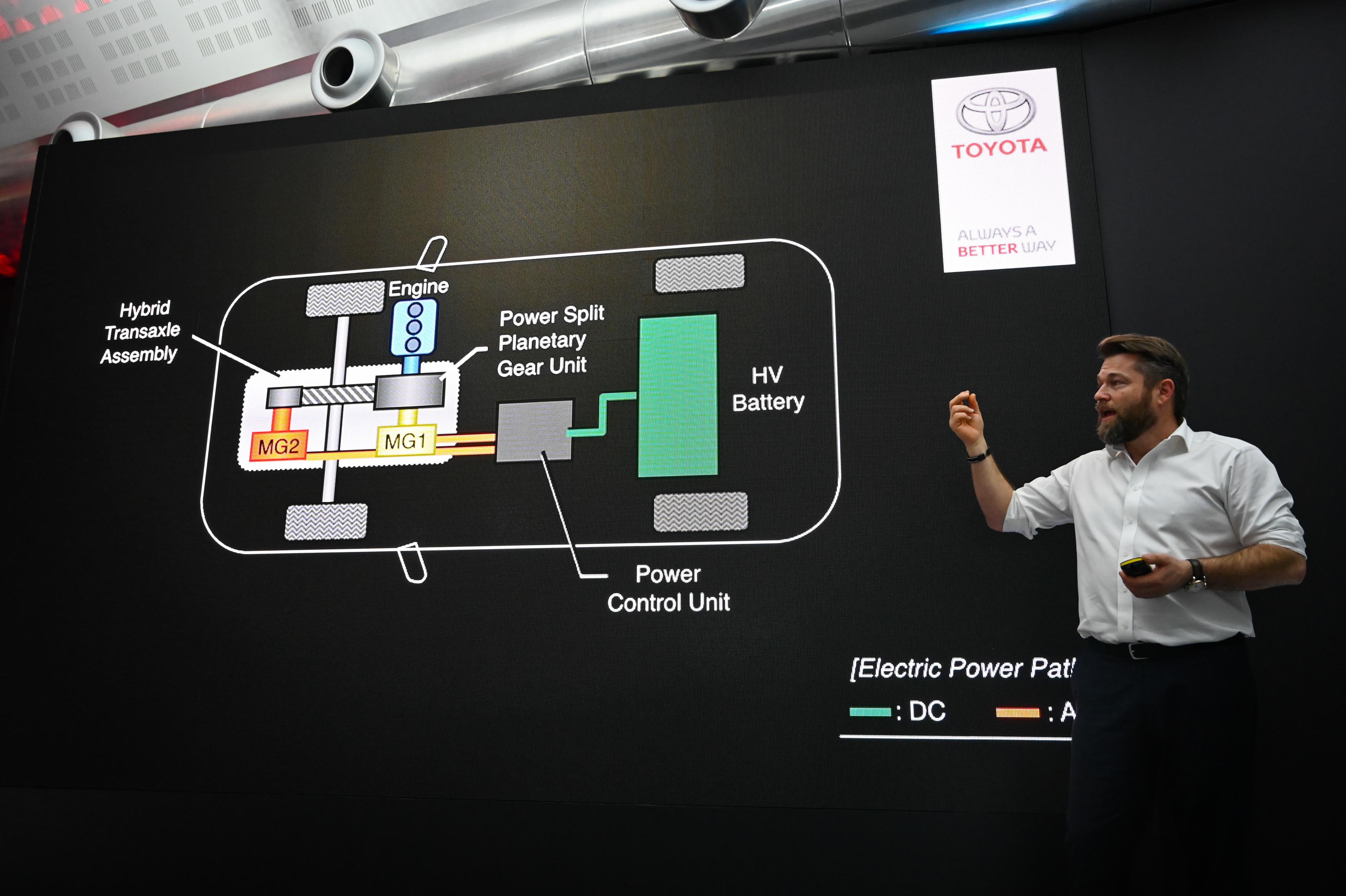 Več kot dve desetletji Toyotinega razvoja hibridov se odraža tudi v izjemno zanesljivem brezstopenjskem e-CVT menjalniku, ki je po zgradbi planetno gonilo, ki ima ob glavni gredi nameščena še elektromotor in generator. V menjalnik so dodali še eno hidravlično črpalko ter z njo poskrbeli, da je zgolj na elektriko mogoče voziti vse do hitrosti 130 km/h. Napredni krmilnik oziroma pretvornik (AC/DC) kar 10.000-krat na sekundo preverja, kdaj pognati elektromotor oziroma zajemati energijo z generatorjem od zaviranju. To pomeni še več preklopov med energetskima tokovoma in še večji delež prevoženih kilometrov na elektriko. Nov hibridni sistem na kolesa pošlje 85 kW sistemske moči oziroma 11,7 kW več kot prej, moč in navor pa podaja veliko bolj zvezno in odzivno, saj “stotico" doseže dve sekundi hitreje kot prej. Ob tem med ovinki razveseljuje voznika z odlično vodljivostjo in gospodarnostjo: sodeč po potovalnem računalniku povprečna poraba goriva brez težav ostaja pod petimi litri na 100 kilometrov.