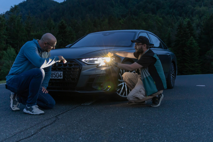 Na naš tokratni nočni preizkus smo povabili tudi slovenskega strokovnjaka, ki razvija podobno zmogljive pametne žaromete. Fizik Marko Belšak v podjetju Hella Saturnus Slovenija vodi oddelek za razvoj optike. Audijev novi matrični žaromet so sicer razvili njihovi tekmeci, so pa v Ljubljani poskrbeli za stropni modul notranje osvetlitve v prenovljenem audiju A8. Po nekaj kilometrih na poligonu in v odprtem prometu je mojster fizike svetlobnih žarkov povedal, da sta žarometa presežek tehnike: “Že na zunaj se vidi, da gre za vrhunski izdelek. Presenetila me je kompaktnost žarometa, ki v motornem prostoru ne zavzema veliko prostora. Predvsem me je prepričal zelo širok svetlobni pramen in enakomerna osvetljenost ceste, ki je brez vidnejših razlik svetlejših ali temnejših področij. In seveda neverjeten napredek žarometov v nekaj letih. Od reflektorjev z žarnico z vklopom in izklopom dolgega in kratkega pramena do malodane digitalnih projektorjev, ki na cesto projicirajo animacijo po želji, kot to počne najnovejši audi A8. 13 voltov električne napetosti ni več dovolj za vklop žarometov, potrebni so pravi grafični procesorji. Žarometi postajajo pametni in na podlagi vhodnih podatkov iz vozila (hitrost, kot zasuka volana, podatki iz kamere, radarja…) njihovo lastno krmiljenje preračuna, kateri posamezen izvor in s kakšnim tokom ga prižgati, da bo vozilo pred nami v temnem področju, vse okrog pa bo osvetljeno. Pri še zahtevnejših računskih operacijah ali grafikah to lahko počne procesor v vozilu. Vse to se je v avtomobilskem žarometu zgodilo v desetih letih ali manj. To je fascinantno. Pri audiju A8 nedvomno izstopajo tudi zadnje luči z OLED tehnologijo,” je pojasnil Marko Belšak.