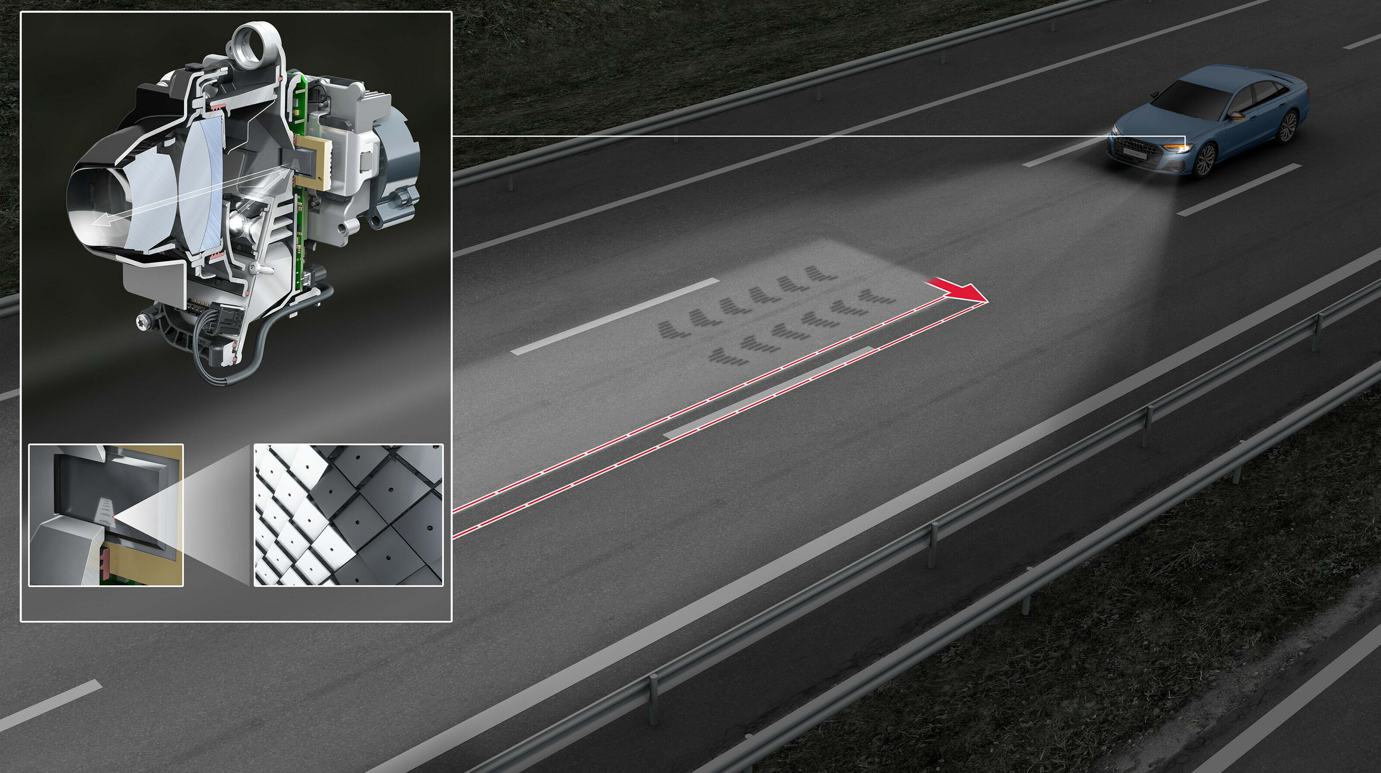 Ena od ključnih in najbolj zanimivih novosti prenovljenega audija A8 sta nova digitalna matrična LED žarometa, opremljena s tehnologijo oziroma napravo DMD (digital micromirror device), ki v žaromet postavlja zmogljivosti videoprojektorja visoke ločljivosti. Jedro te tehnologije je izredno zmogljiv čip z 1,3 milijona mikrozrcal, katerih robovi merijo le nekaj tisočink milimetra. Pametni Audijev avtomobilski vid lahko ob pomoči elektrostatičnih polj vsako posamezno zrcalce nagne oziroma spremeni kot odboja svetlobe do 5000-krat v pičli sekundi. Odvisno od položaja zrcalc svetlobni snop preko leč izdatno osvetli natančno določeno površino ali pa ob pomoči absorbcije odboja z enako natančnostjo osvetli določeno površino ceste ali bližajoče se vozilo, pešca, kolesarje … Ta tehnologija omogoča izredno natančno osvetljevanje, ki z visoko ločljivostjo svetlobnega snopa spominja na projekcijsko video-sliko; svetlobni snop Audijevega digitalnega matričnega LED žarometa ni nikoli statičen, saj projekcijska enota snop nenehno prilagaja cesti, vremenu, prometu in hitrosti vožnje.