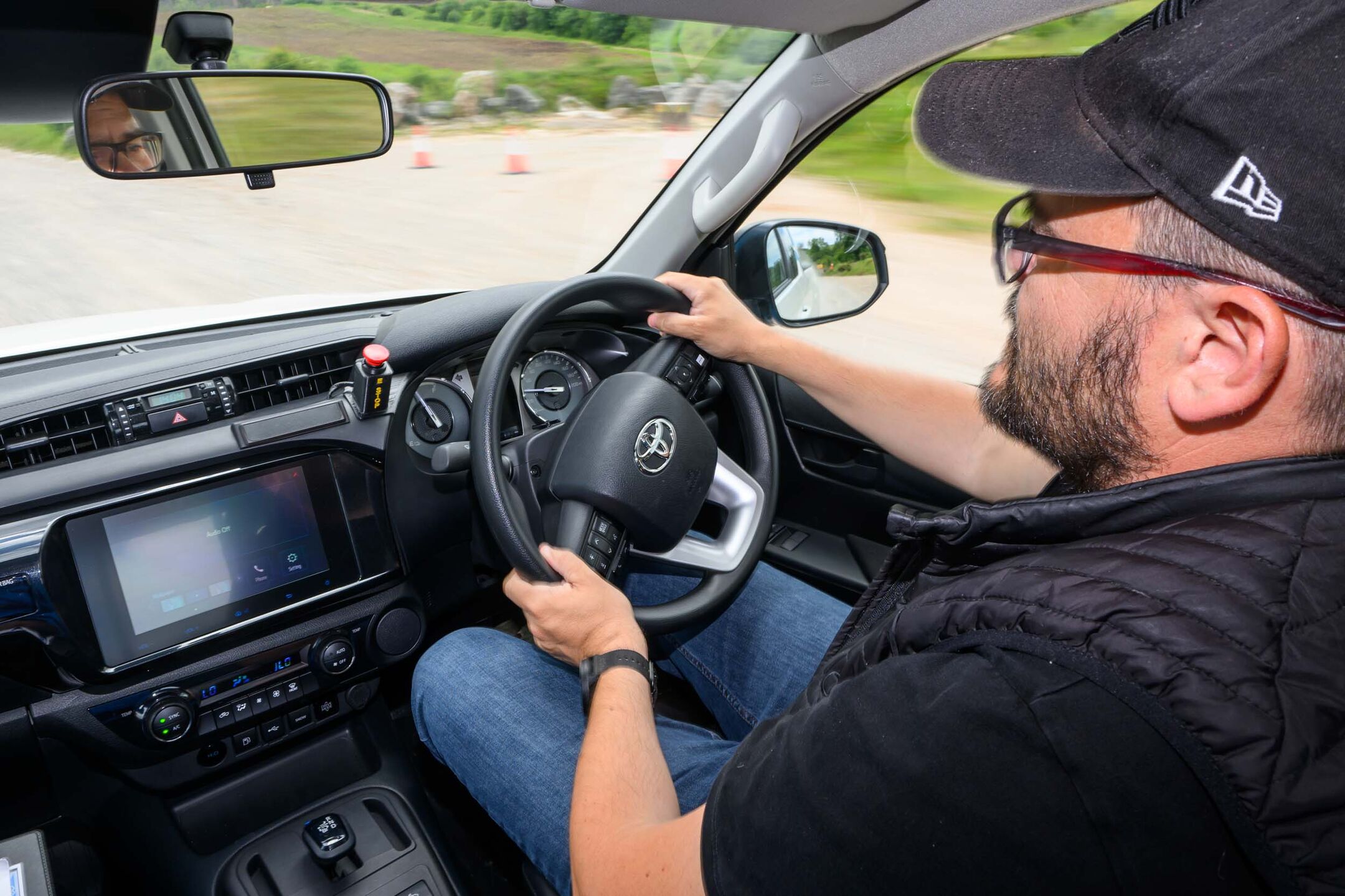 Nikoli si ne bi mislili, da se bomo s hiluxom kdaj po terenu vozili v tišini, brez zvočnih in mehanskih dražljajev in ob tem neizmerno uživali. Na široki sredinski konzoli nas je namesto zajetne ročice samodejnega menjalnika pričakala drobna ročica planetnega gonila iz toyote mirai, vpeta v surov industrijski pokrov iz umetne mase. Na vrhu armaturne plošče je bilo še veliko rdeče varnostno stikalo pogonskega sistema za izklop v sili. Po pritisku stikala za zagon se je v tišini na zaslonu merilnikov pojavil napis “ready.” Nobenega zvoka, nič tresljajev; avto je čvrst, izpod koles se sliši le kamenje. Malce odločneje pohodimo stopalko in se takoj nasmejimo; ker zadnji kolesi poganja elektrika, je dostava navora hipna in zato je tudi odzivnost odlična. Hilux je na grobem kolovozu kamnoloma presenetljivo lahkoten in lepo prestreže udarce s podlage.