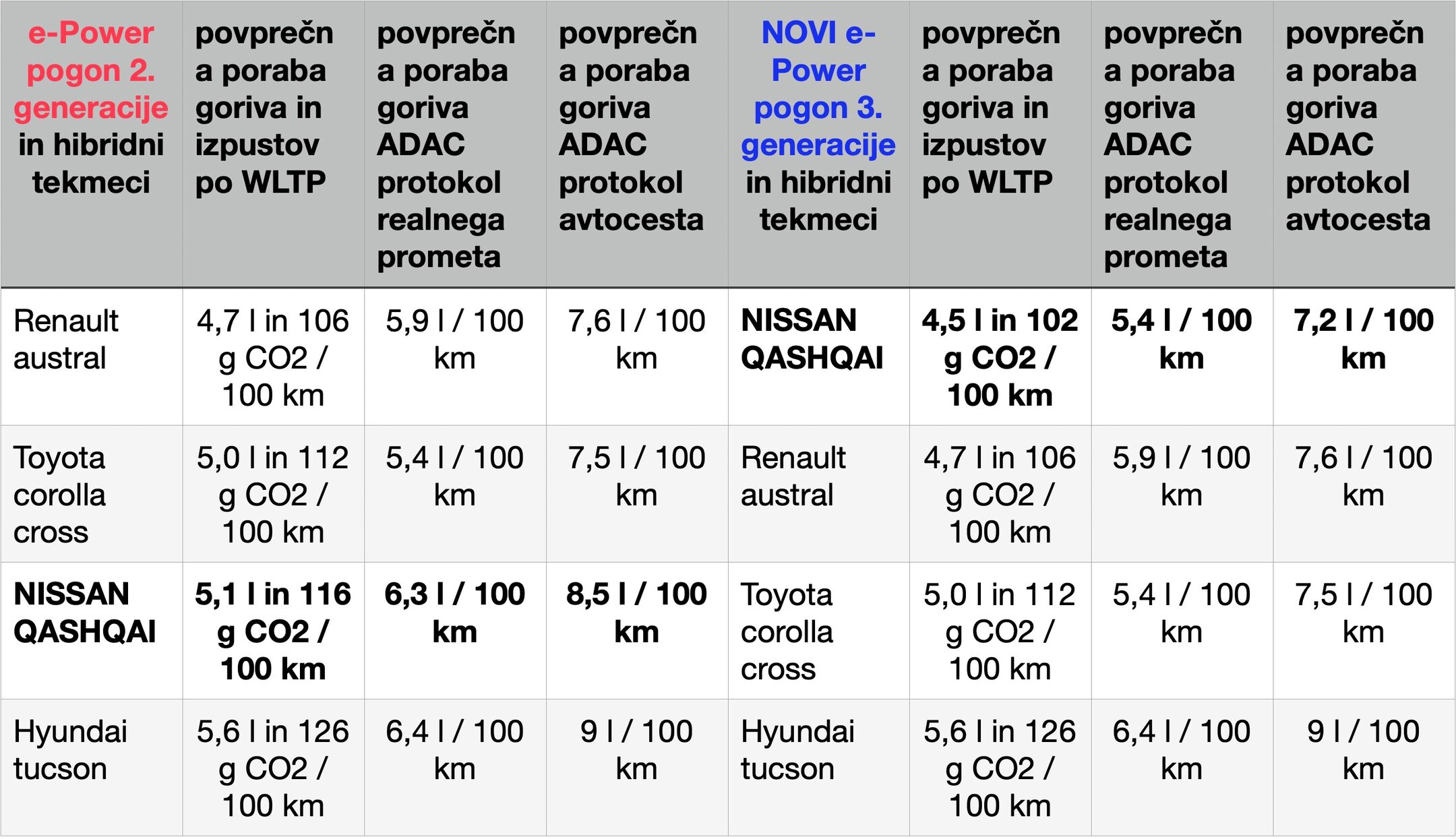 Tabela povprečne porabe goriva aktualnega in novega e-power pogona v primerjavi s hibridnimi tekmeci (vir: Nissan tehnični center Barcelona)