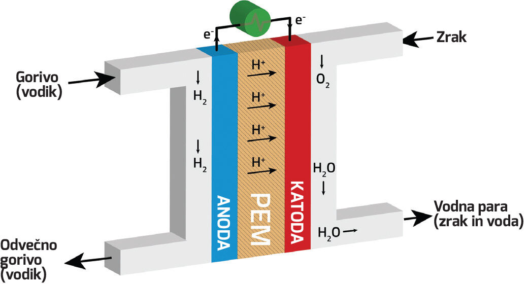 | PEM (polimerno-elektrolitska membrana) gorivne celice (na sliki v sredini) ločuje anodo (levo), obdano z vodikom (H₂), od katode (desno), obdane s kisikom (O₂). Na anodi se vodikove molekule razdelijo na ione in elektrone; ioni potujejo skozi membrano PEM do katode, kjer se povežejo z zrakom in tvorijo vodo. Ker pa je membrana neprepustna za elektrone, morajo ti na poti do katode narediti ovinek prek vodnika, pri čemer nastane električni tok, ki ga lahko neposredno napaja akumulatorski sklop oziroma poganja električni motor. |