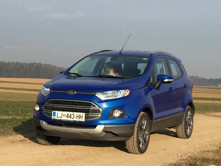 A če odmislimo zadnji del avta, je ecosport oglato oblikovan terenski avto z zelo visoko prednjo masko in 18 cm oddaljenostjo dna avta od tal. Na kratkih prednjih sedežih je prostora dovolj, bistveno manj, še zlasti za kolena, ga je na zadnji klopi. V avtu se sedi visoko, kar pripomore k enostavnemu vstopanju v avto in izstopanju iz njega, pa tudi voznikova ergonomija je dobra. Voznikovo delovno okolje je malce staromodno: instrumentna plošča je pregledna, toda sredinski zaslon je majhen. Za uporabniški vmesnik je treba doplačati, pa še tedaj za 500 evrov dobite zastareli sync 1 s številnimi gumbi in zelo povprečno kakovostjo bluetooth povezave – v drugih fordih je na voljo že sync 2.