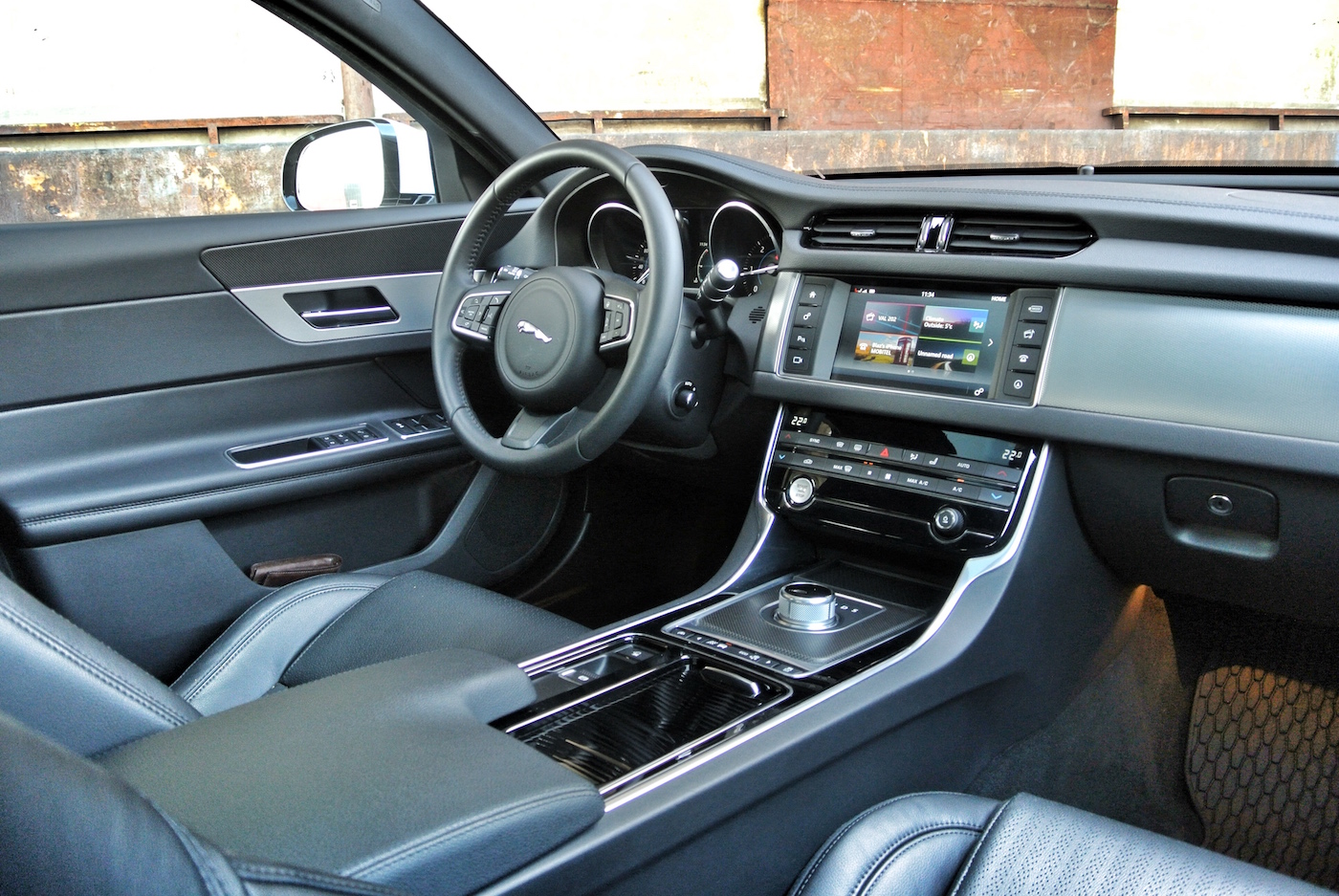 Manj športnosti – in več elegance – ponuja XF v notranjosti, kjer prevladujejo ravne površine in prečiščene oblike. Voznik sedi dokaj nizko, a tudi ergonomsko pravilno, navdušijo dosledno dobra izdelava in kakovostni materiali, pa tudi preglednost armaturne plošče in upravljalskih sklopov. Posebnost jaguarjev (in land roverjev oziroma range roverjev) je okrogel gumb menjalnika, ki se samodejno dvigne iz osnovnega položaja ob vsakokratnem zagonu motorja.