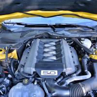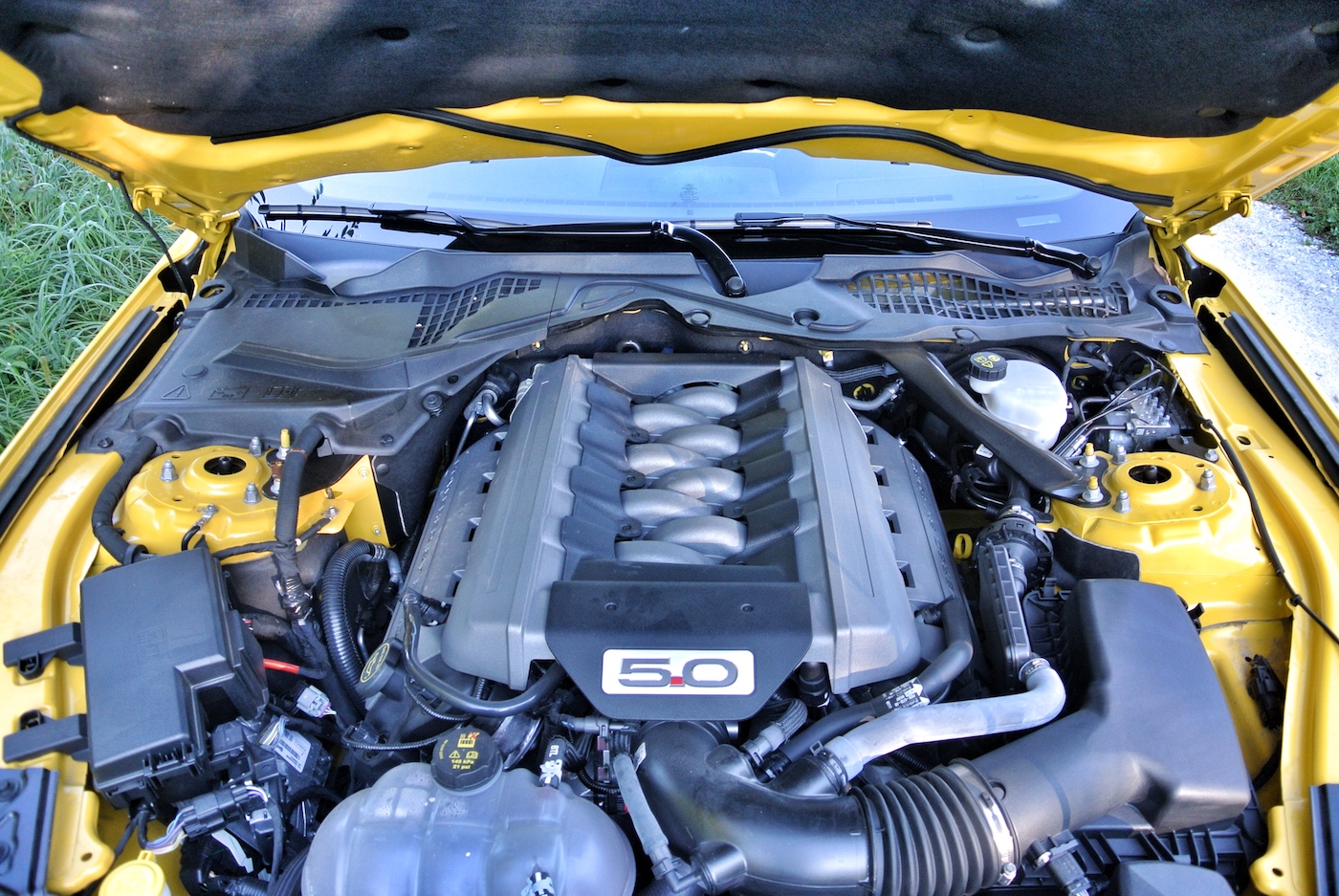 Pri mustangu se pravi razlog za veselje skriva pod dolgim motornim pokrovom, kjer je vzdolžno vstavljen bencinski “small block” osemvaljnik z valji na V, prostornino 5 litrov, močjo 310 kW (421 KM) in navorom 524 Nm. Motor prek ročnega šeststopenjskega menjalnika poganja zadnji kolesi, med katerima je diferencial z delno zaporo. Klasična športna pogonska zasnova torej, pri kateri še največ začudenja vzbuja dejstvo, da je ročni menjalnik (izberete lahko tudi samodejnega) sploh na voljo.