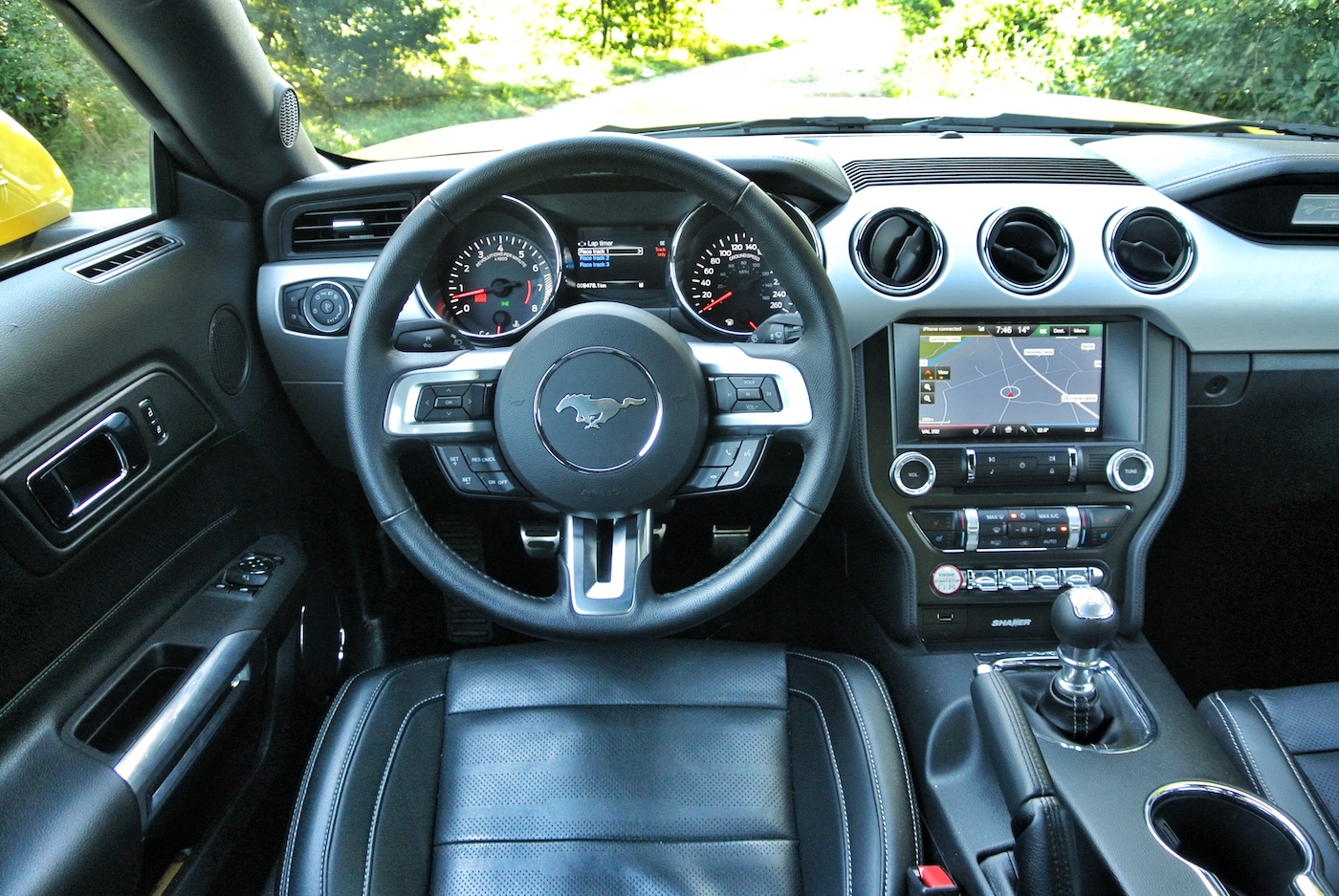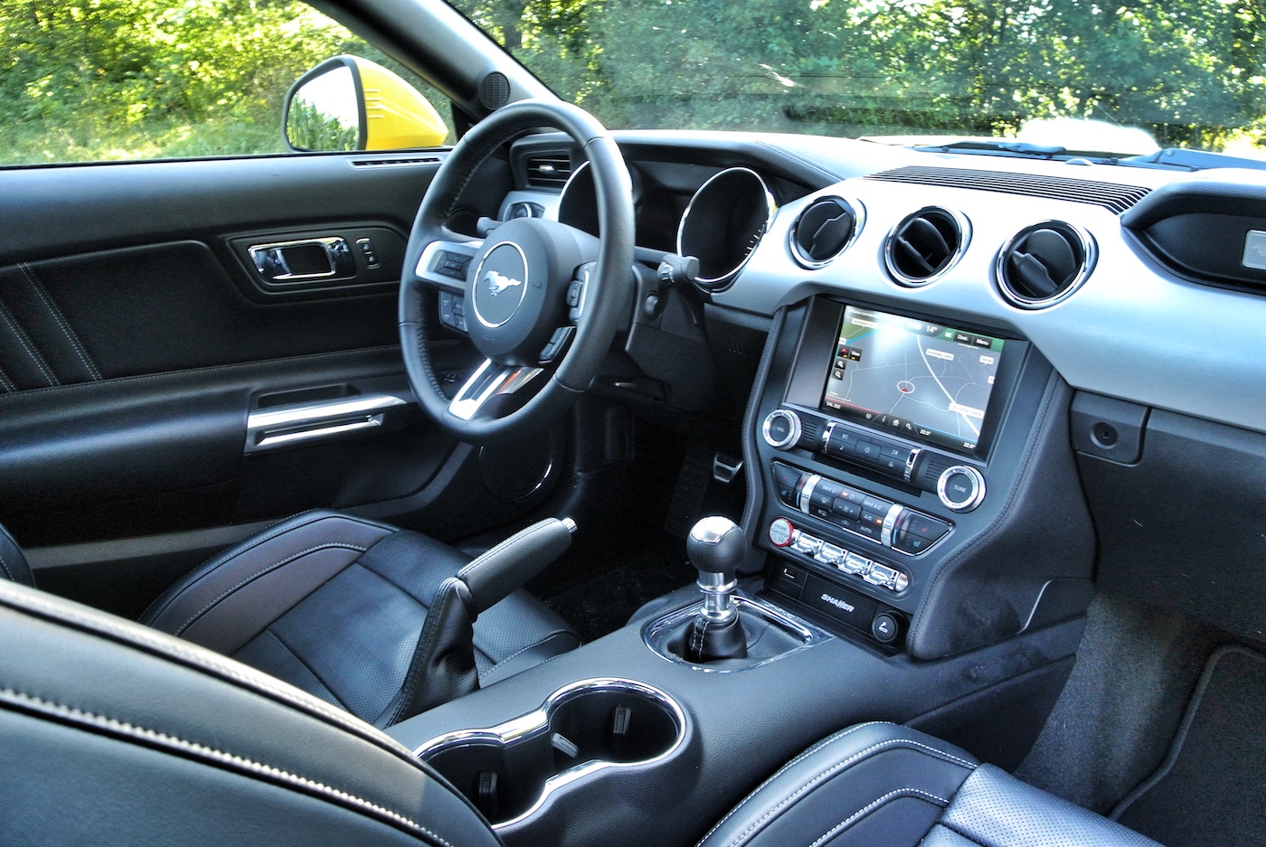 4,8-metra dolg štirisedežni športni kupe ima prepoznavno obliko z zelo ameriškim naglasom; dolgim pokrovom motornega prostora, široko stojo in nič kaj napredno aerodinamiko. Avto je velik, v notranjosti pa dovolj tesen s prostorom, da ne ponuja nič več prostora od manjših športnih kupejev evropskih in japonskih avtomobilskih znamk; spredaj je prostora dovolj za vsakogar, na zadnjih dveh sedežih zaradi nizke strehe le za otroke. Se pa voznik v mustangu počuti domače; njegova armaturna plošča je sicer značilno ameriške oblike, a dovolj pregledna – sodobnim zahtevam služi dobro poznan Fordov mulitmedijski sistem sync 2.