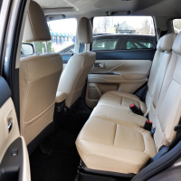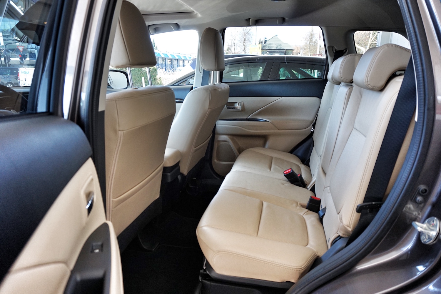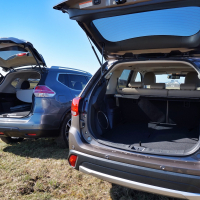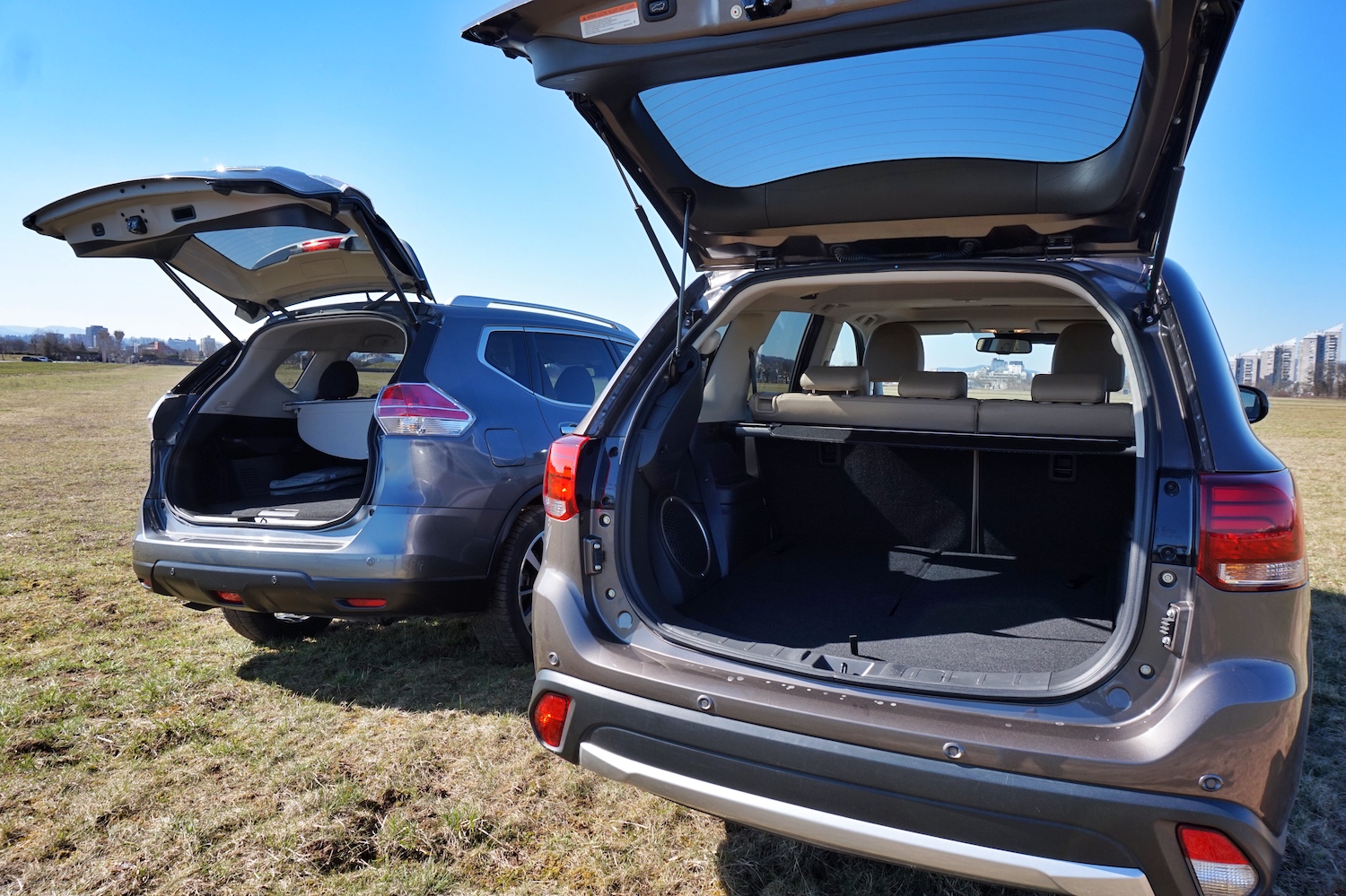 Precej bolj prostorno in udobno je na ostalih sedalnih mestih v obeh avtih; zadaj oba razvajata z vzdolžno pomično zadnjo klopjo (in nastavljivim naslonjalom), ki v povsem odmaknjenem položaju ponuja limuzinsko odmerjen prostor za kolena. A sedenje je malce udobneje in prijetneje v x-trailu; tam je zadnja klop nasajena nekaj višje, zato imajo potniki zadaj lepši pogled naprej, s tem pa je boljše tudi počutje. X-trailovi sedeži so tudi precej mehkeje oblazinjeni, v outlanderju pa razvaja usnje. Malce drugačna arhitektura notranjosti daje torej prostorsko prednost x-trailu, ki ima ob tem še – zaradi večje širine – malce uporabnejši prtljažnik, čeprav je na papirju za oba zapisan enak podatek – 550 litrov.