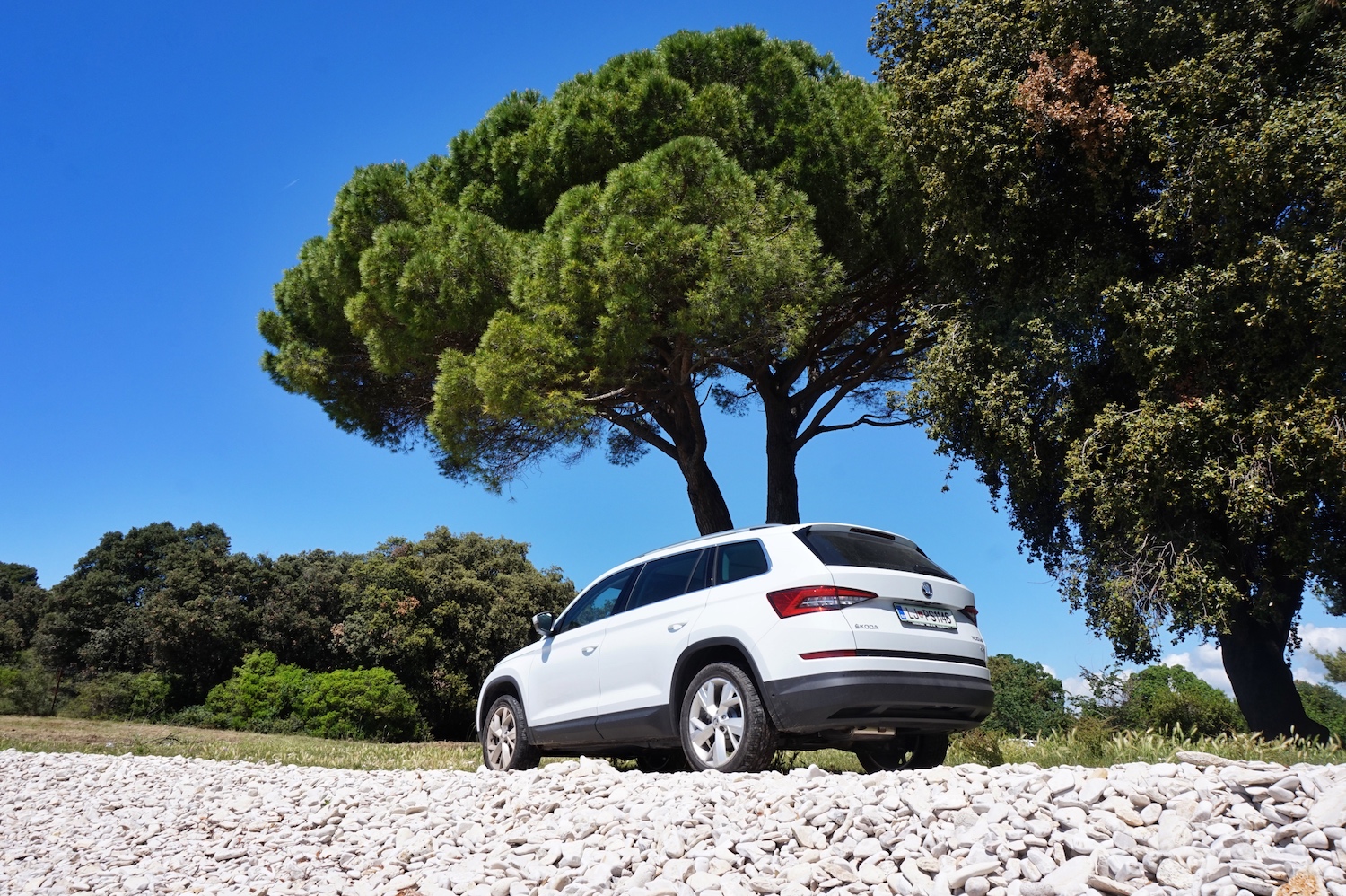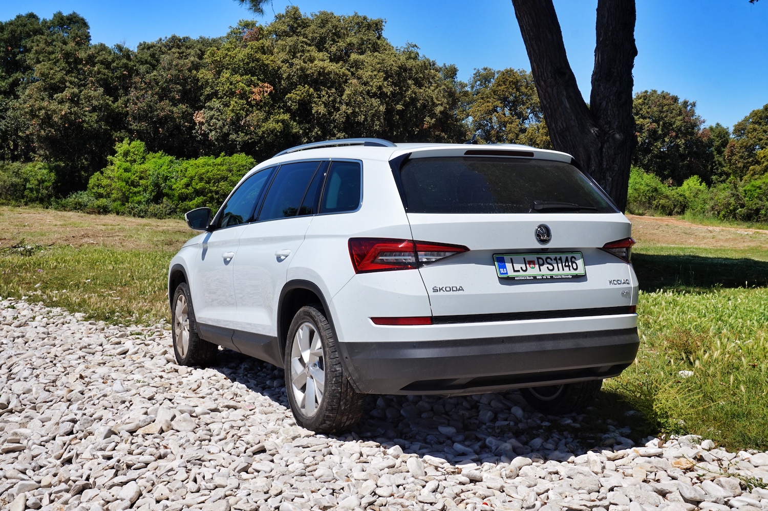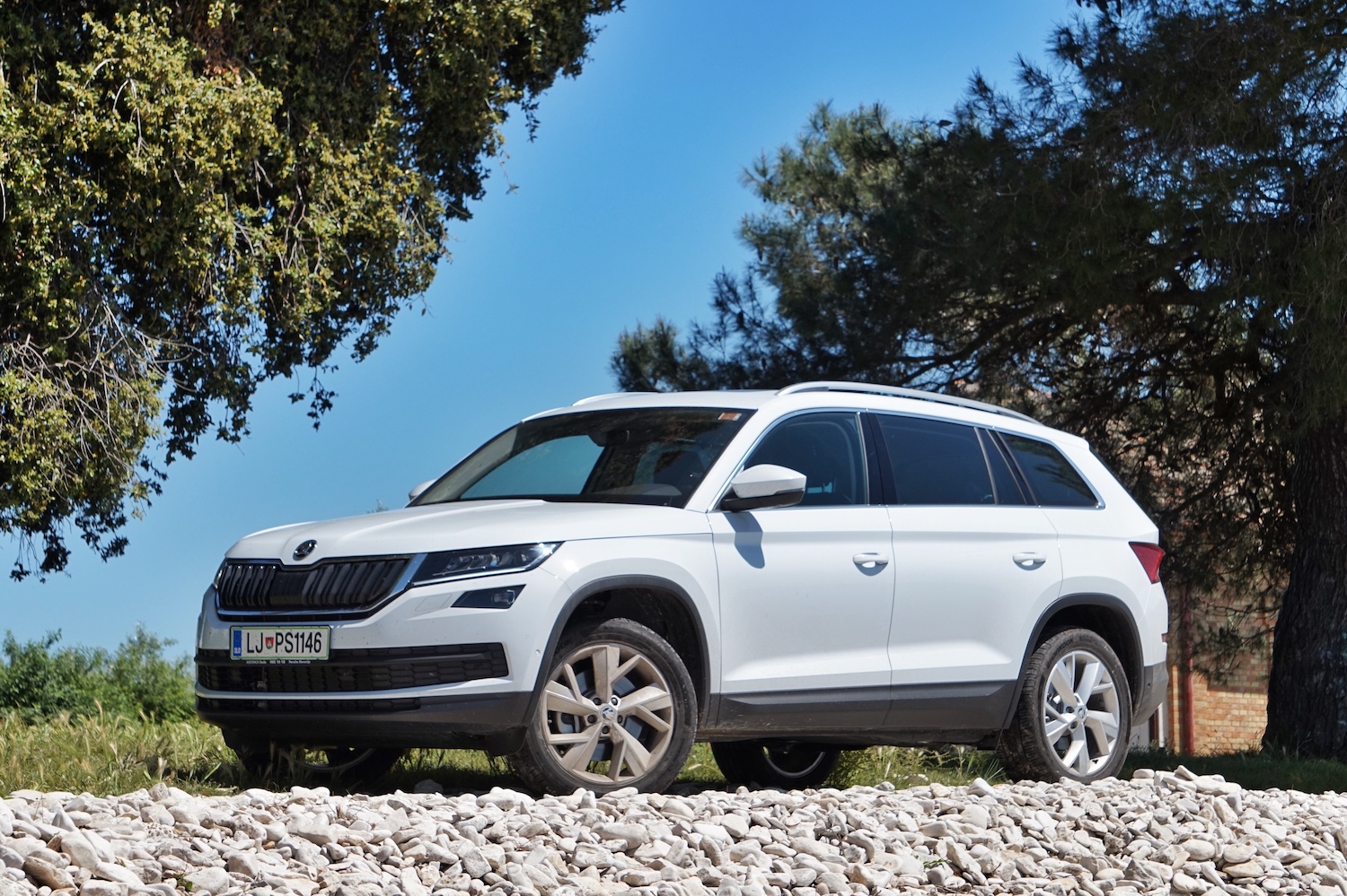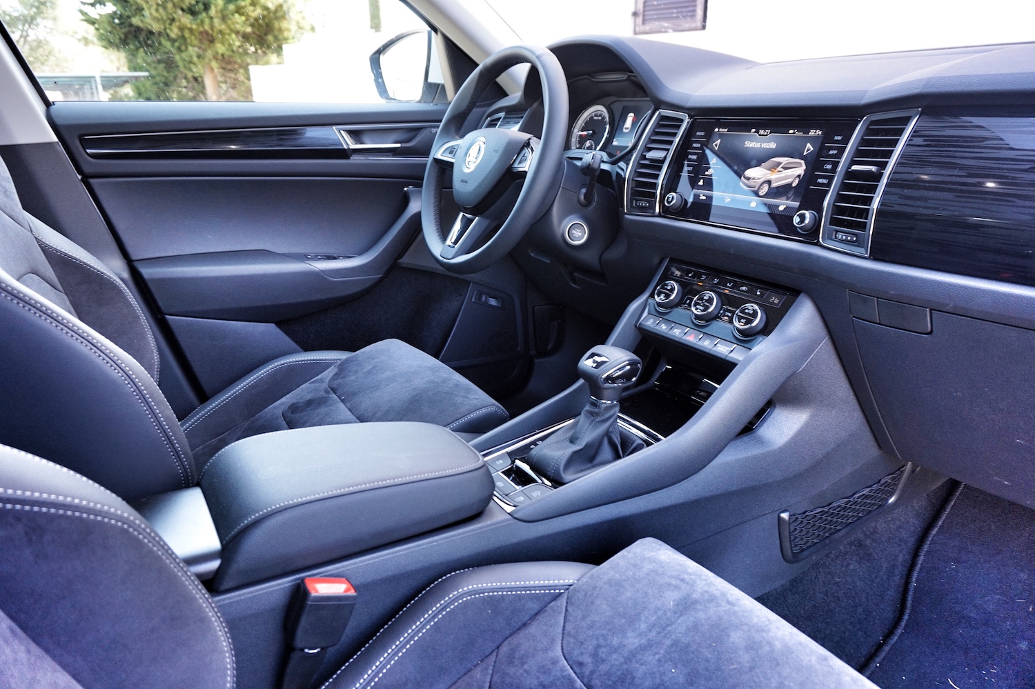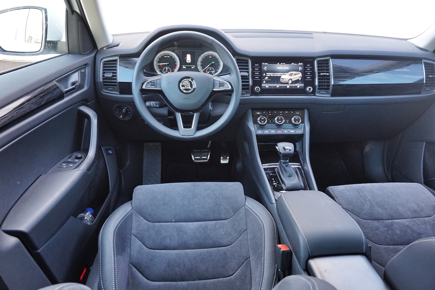 Armaturna plošča sledi Škodini oblikovalski filozofiji in ponuja preglednost, velik zaslon multimedijske naprave in dobro ergonomijo. Pripomb na obliko, materiale ali kakovost izdelave nimamo; z izdatno in za doplačilo električno nastavljivimi sedeži si hitro najdemo pravi položaj za volanom, precejšnja višina sedenja in veliko steklenih površin pa zagotavljajo dobro preglednost. Preskusni kodiaq je bil opremljen z najmočnejšim dizelskim motorjem – 2-litrski TDI s 140 kW in 400 Nm ponuja veliko prožnosti in v povezavi s sedemstopenjskim DSG menjalnikom tudi veliko udobja. A tako opremljen in motoriziran kodiaq tehta 1,8 tone, zato ima motor pri pospeševanju kar nekaj dela, kodiaq pa se ne zdi tako poskočen, kot kažejo motorne zmogljivosti. Masa in aerodinamično velika površina poskrbijo tudi za nič kaj nizko porabo goriva – z manj kot 7 l/100 km se boste težko peljali, 9 l/100 km pa ni težko preseči.