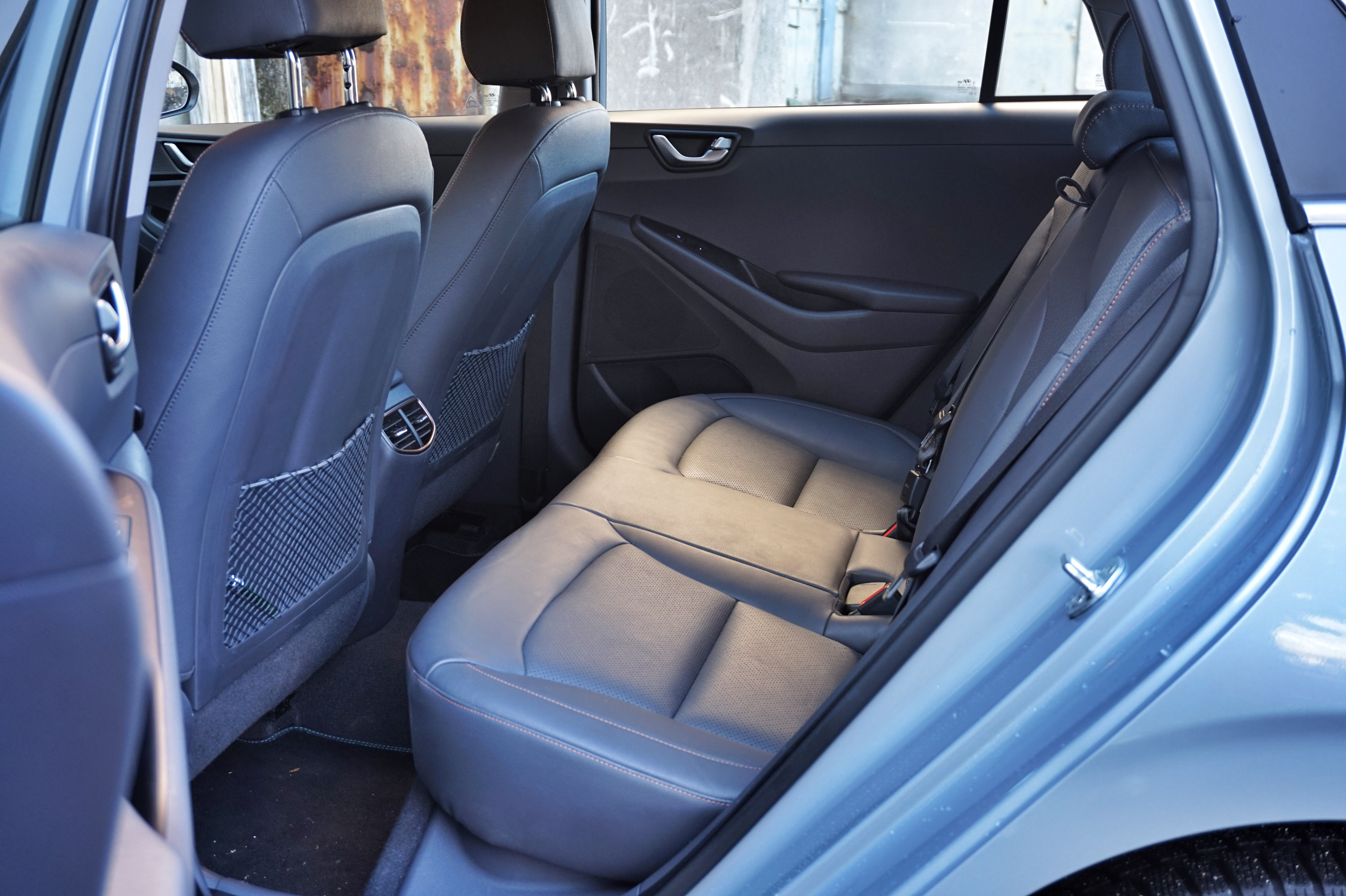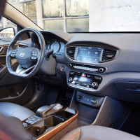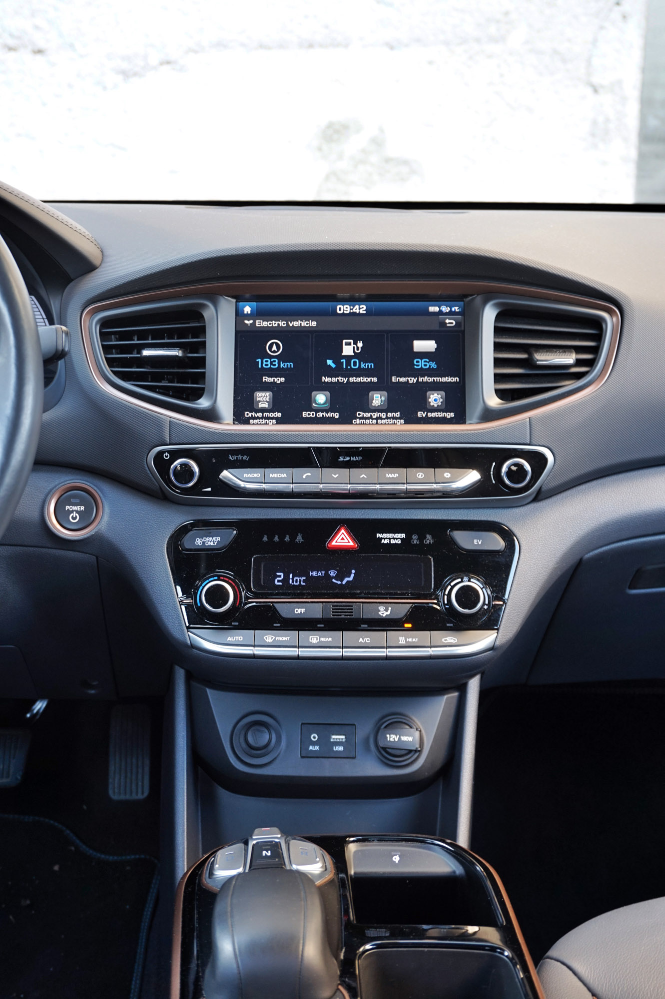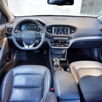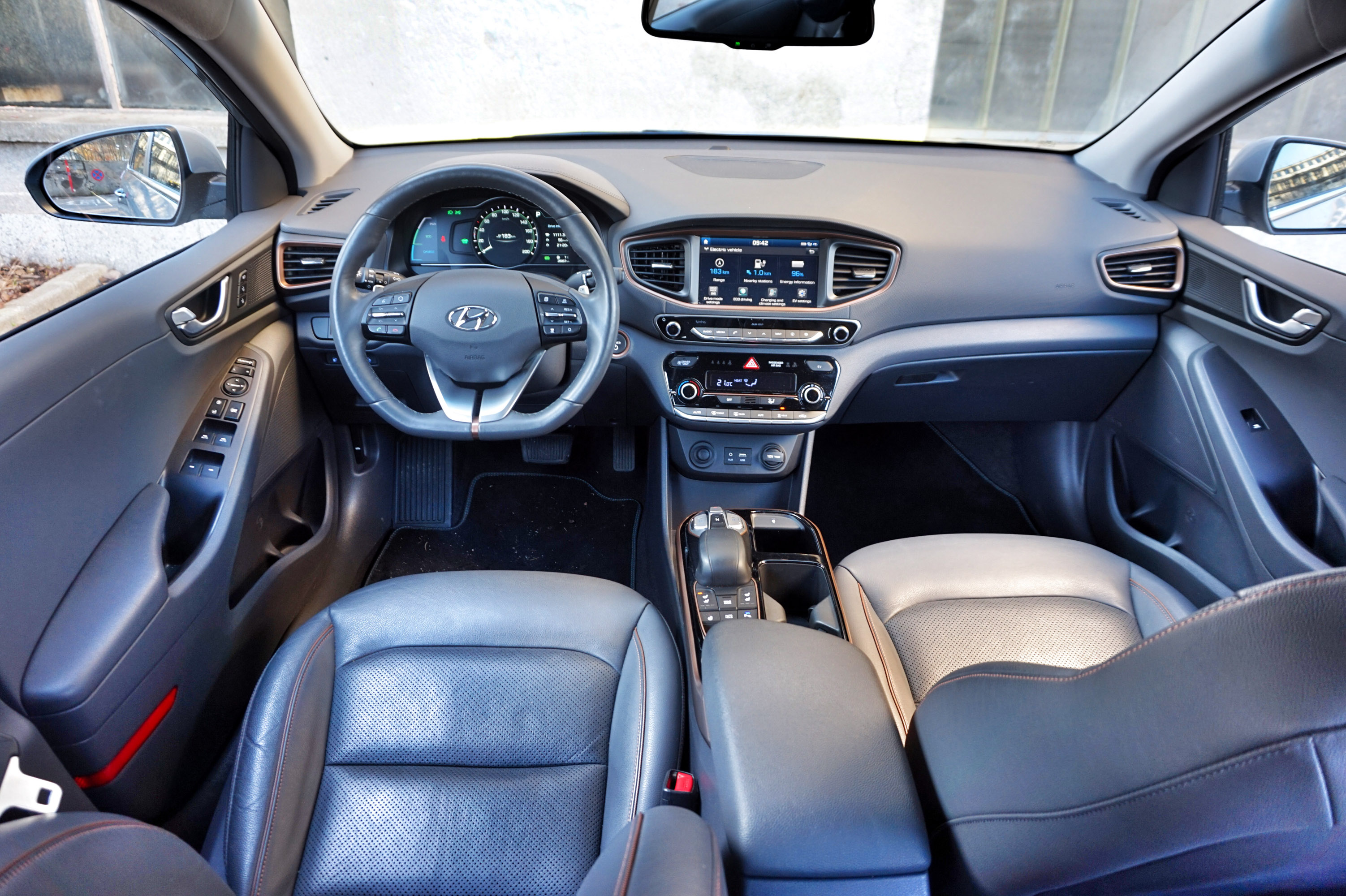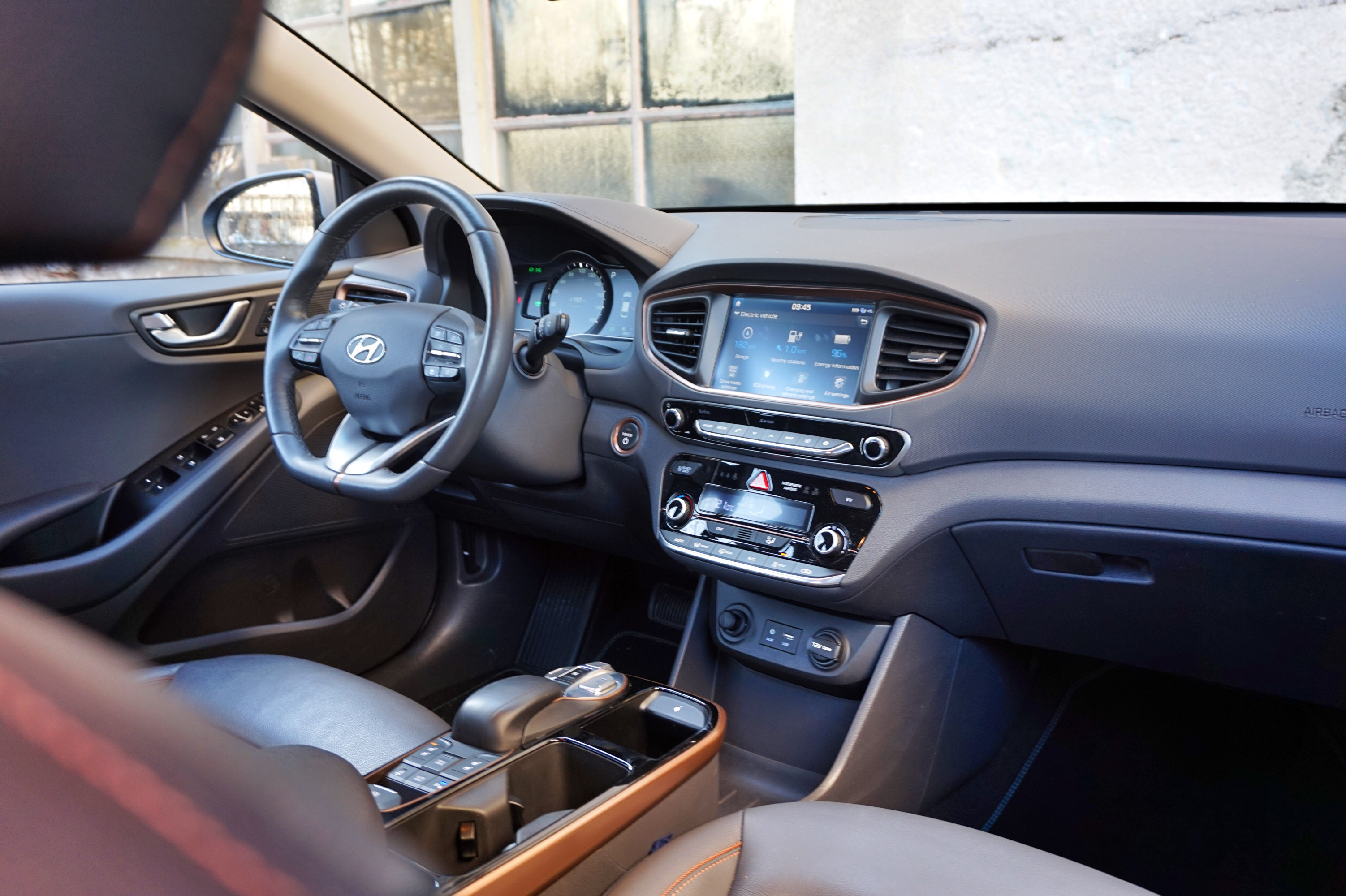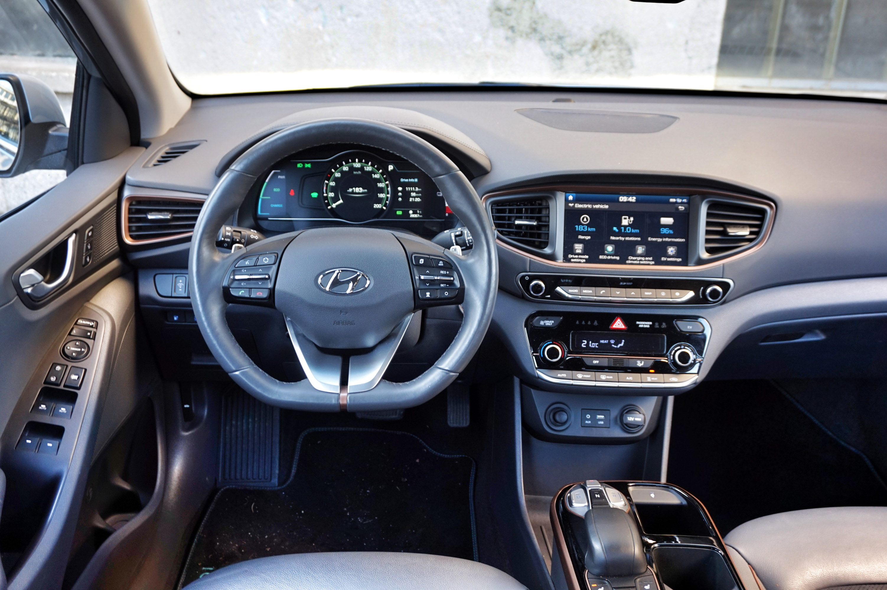 O (hibridnem) ioniqu smo že pisali, električni ioniq pa se od hibridnega na pogled loči le po nekaterih karoserijskih značilnostih. Drugače je pri tehniki: med prednjima kolesoma je električni motor, sploščen akumulatorski sklop pa je v zadnjem delu avtomobila. Zaradi akumulatorskega sklopa je prostornina prtljažnika sicer za 100 litrov manjša kot pri hibridni različici. Izza volana ioniq ni prav nič električno čudaški; armaturna plošča je pregledna, sedenje je udobno, oprema sodobna, zadnja klop družinsko prostorna. Le namesto ročice menjalnika ima gumbe (PRND), obvolanski ročici, s katerima pri običajnih avtih izbiramo prestave, pa v električnem ioniqu uravnavata moč sistema za rekuperacijo zavorne energije.