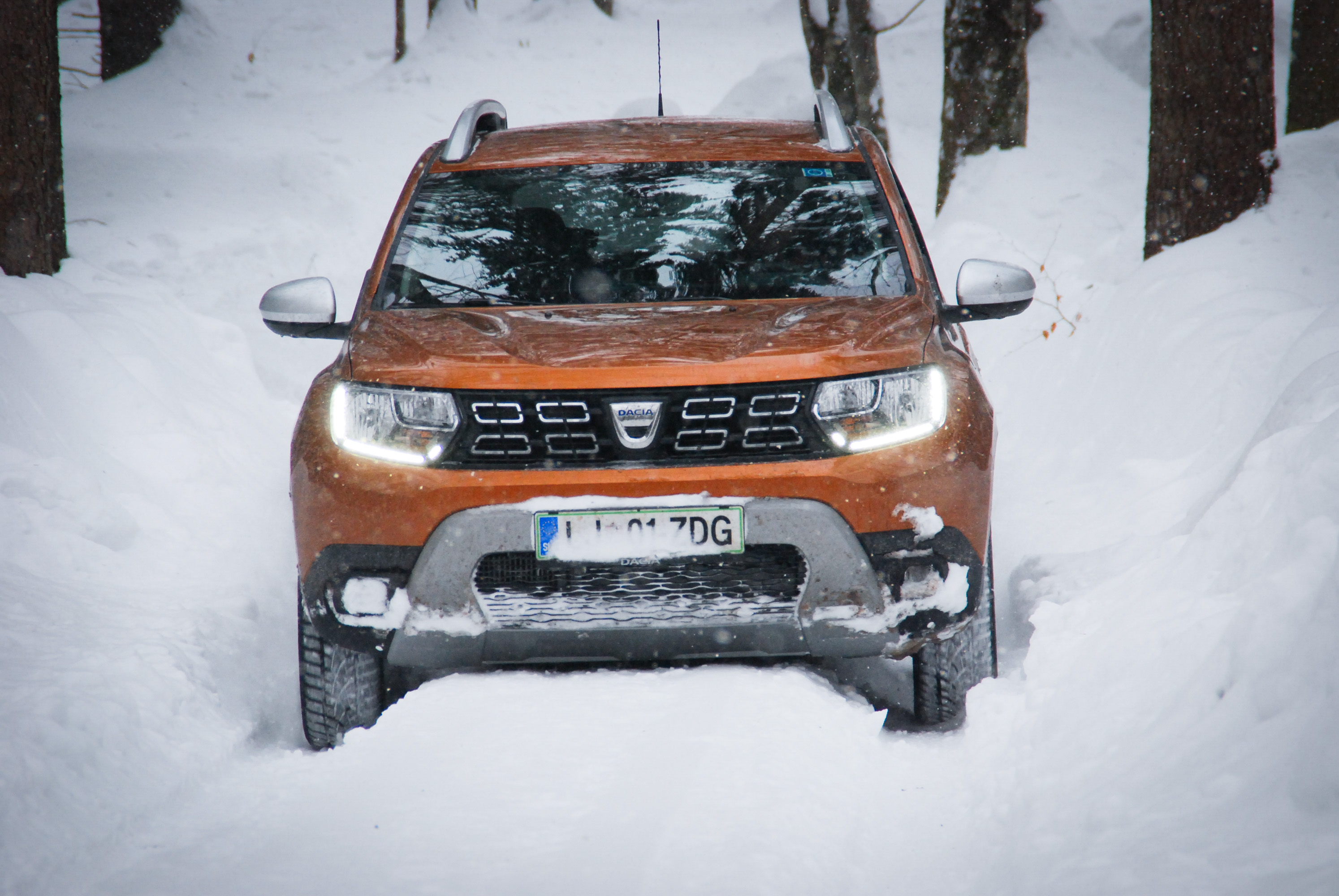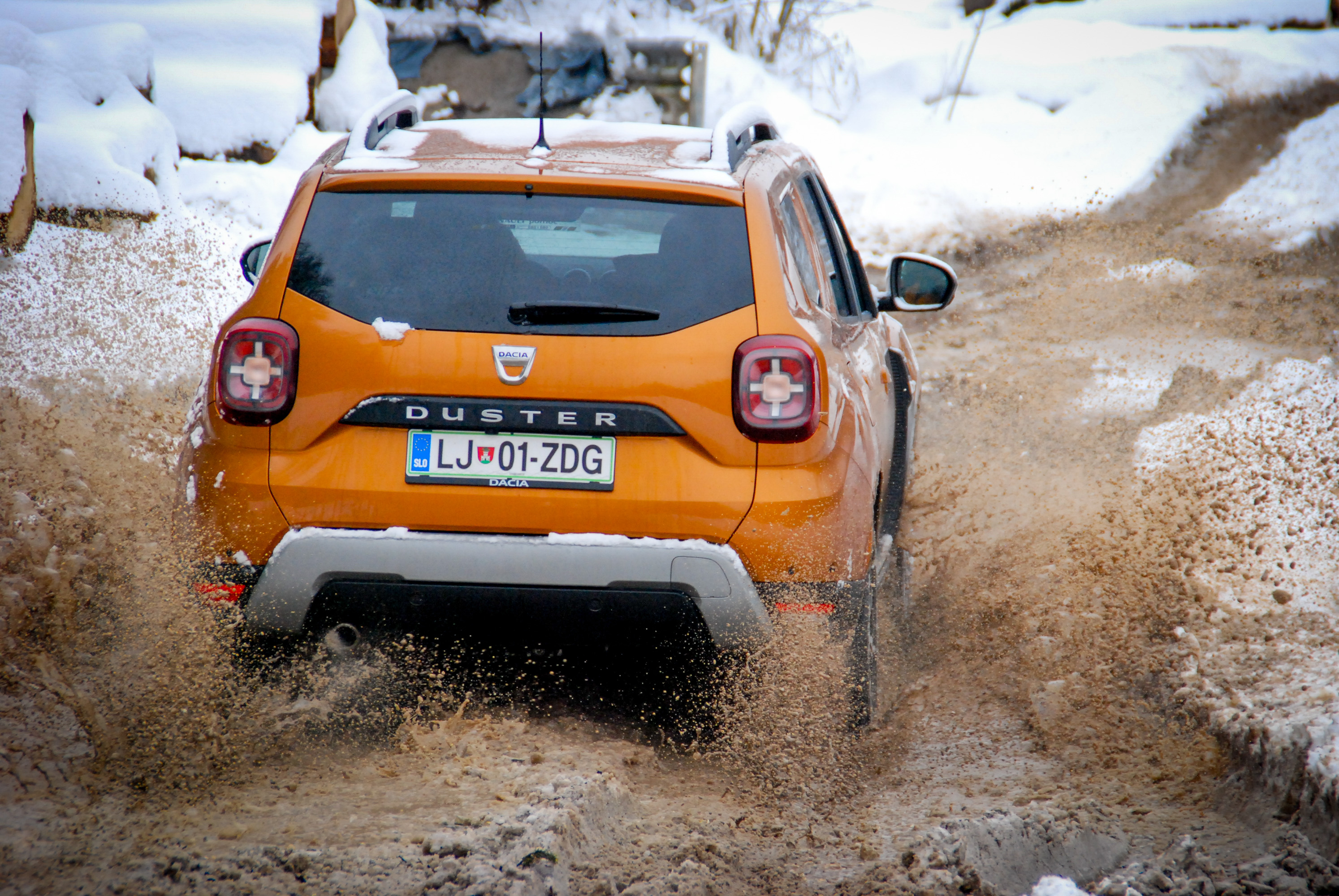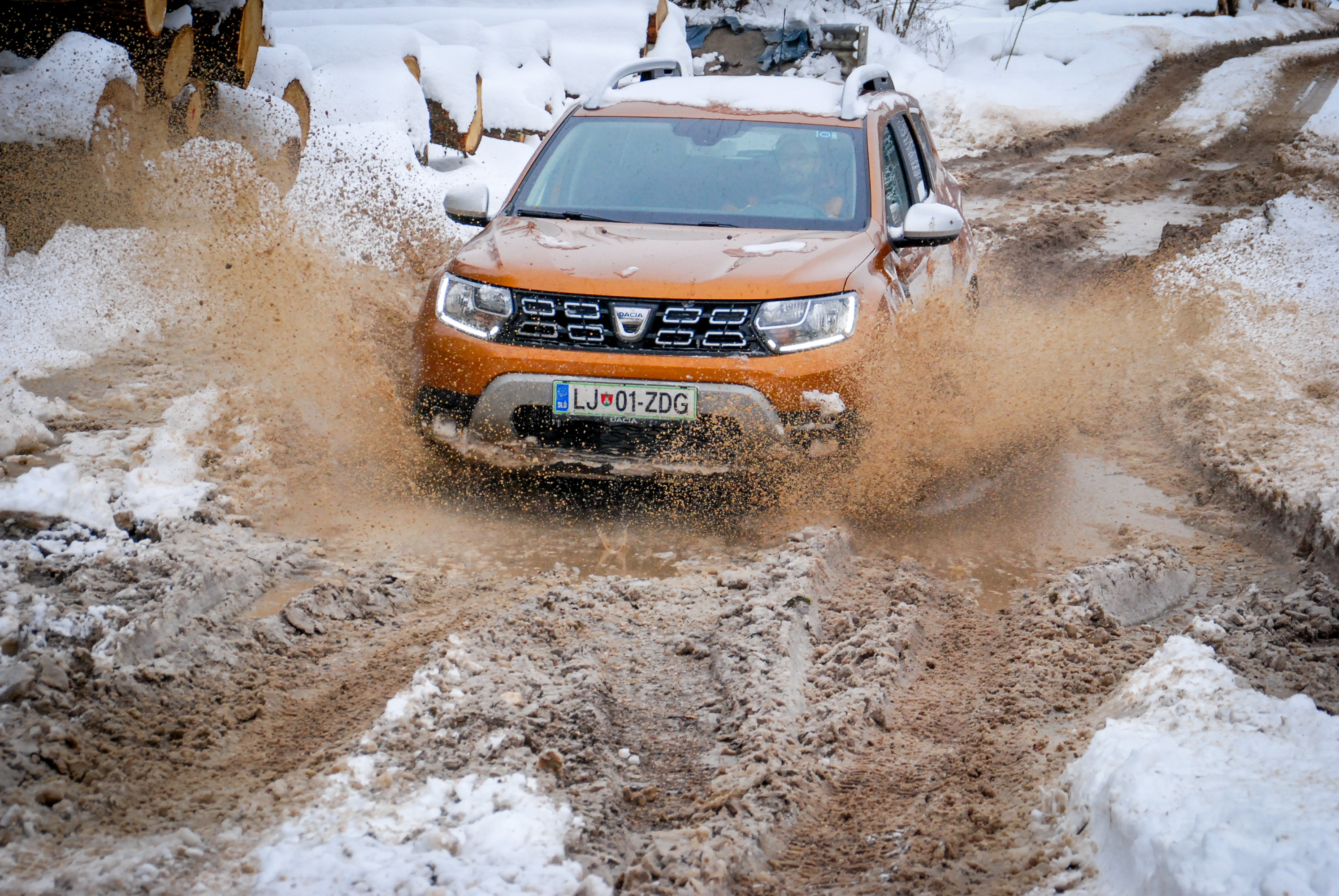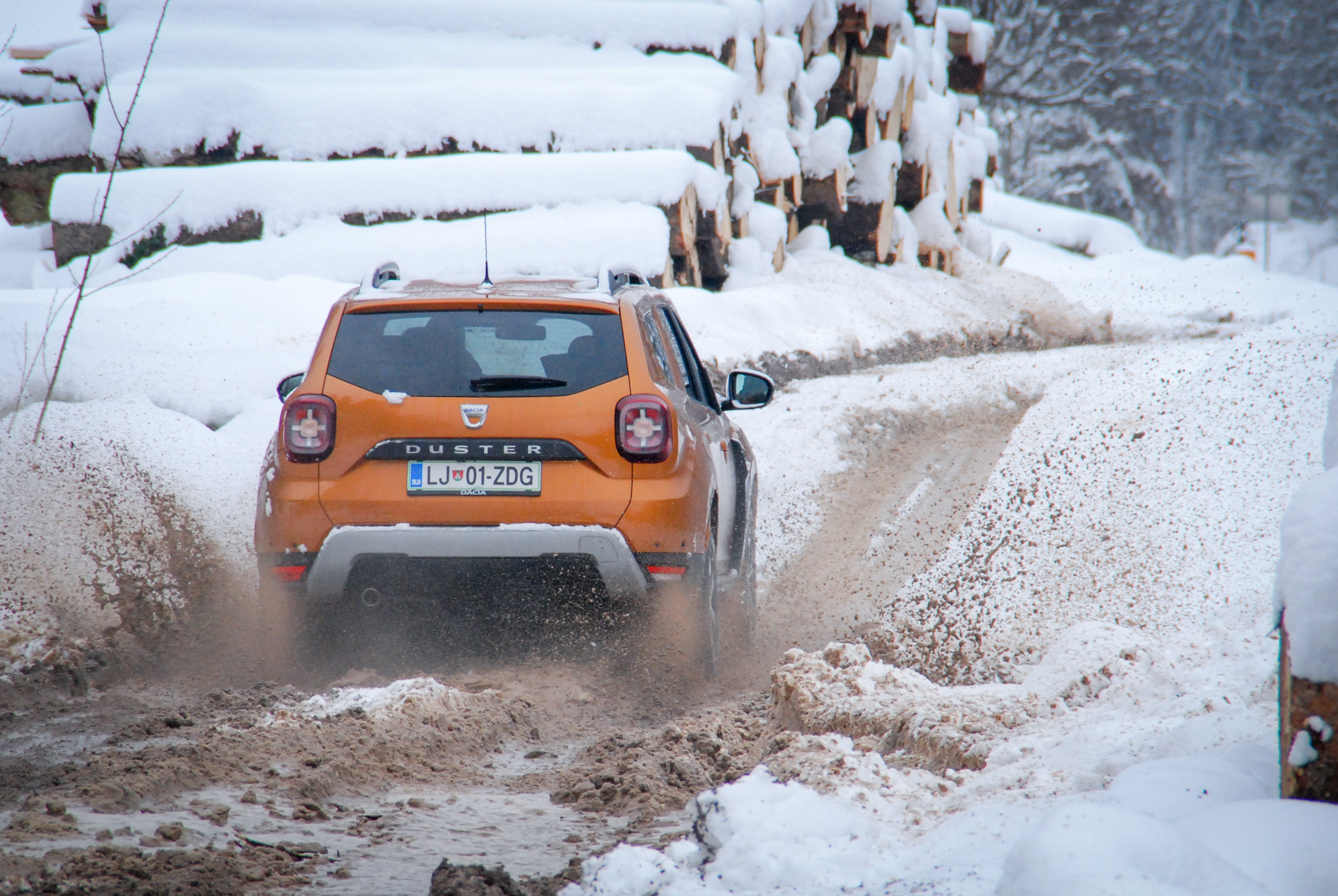 Z 21-centimetrsko oddaljenostjo od tal in zanesljivim štirikolesnim pogonom se zna duster zapeljati na vozno podlago z malo oprijema. Z njim smo brez težav rili po nespluženi gozdni cesti, na kateri je bilo 35 cm svežega snega. Za najtežje razmere kot so blato, sneg in pesek pa je mogoče vklopiti še sredinsko zaporo, ki navor med prednja in zadnja kolesa razdeli v razmerju 50:50. Ob vklopljeni funkcij lock in skrajšani 1. in 2. prestavi, ki malce nadomeščata reduktor, se duster še vedno zelo pogumno loti brezpotja. Pri tem je vozniku med koreninami in kamenjem precej v pomoč 400 evrov vreden sistem kamer, ki omogoča pogled na vse štiri strani vozila.