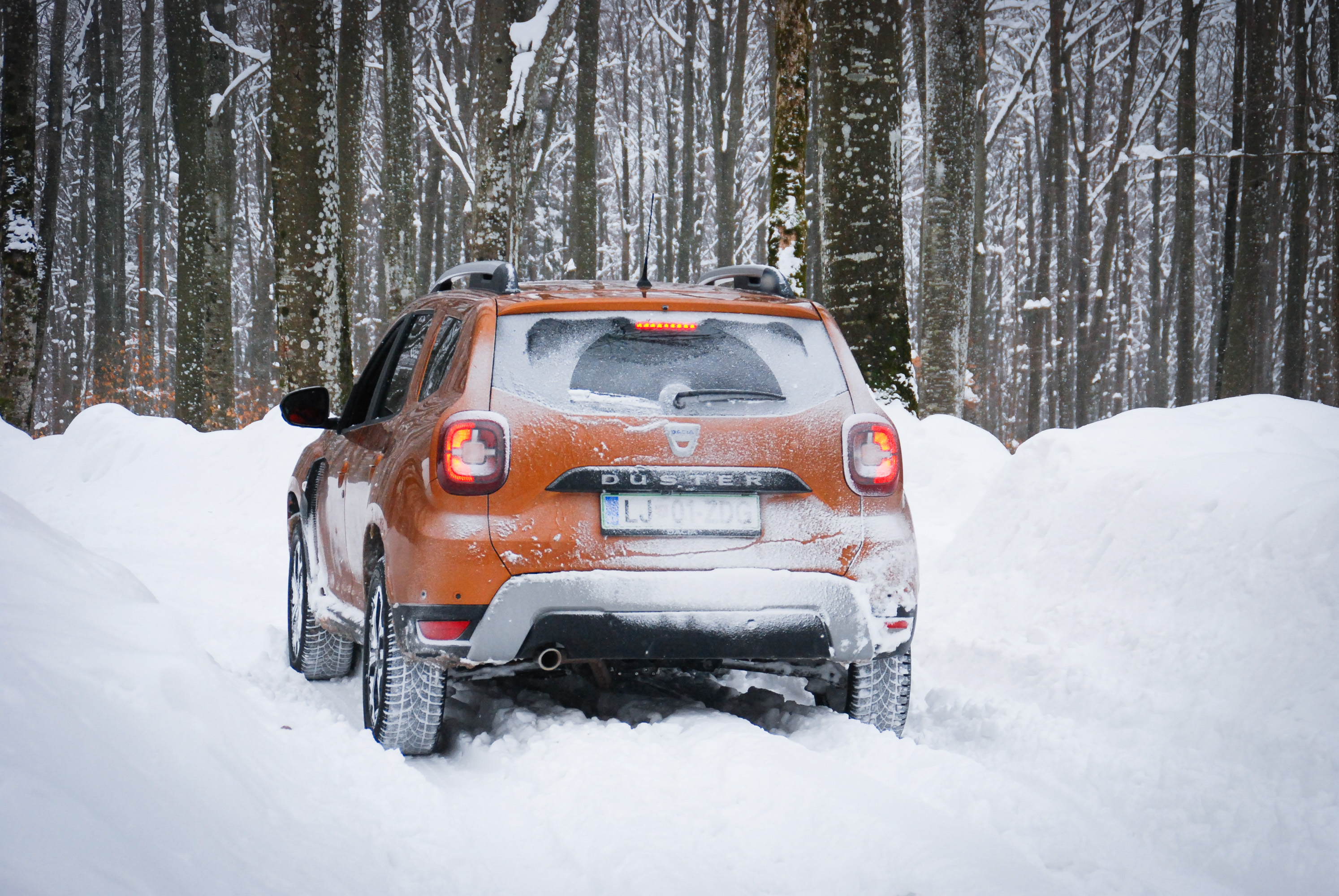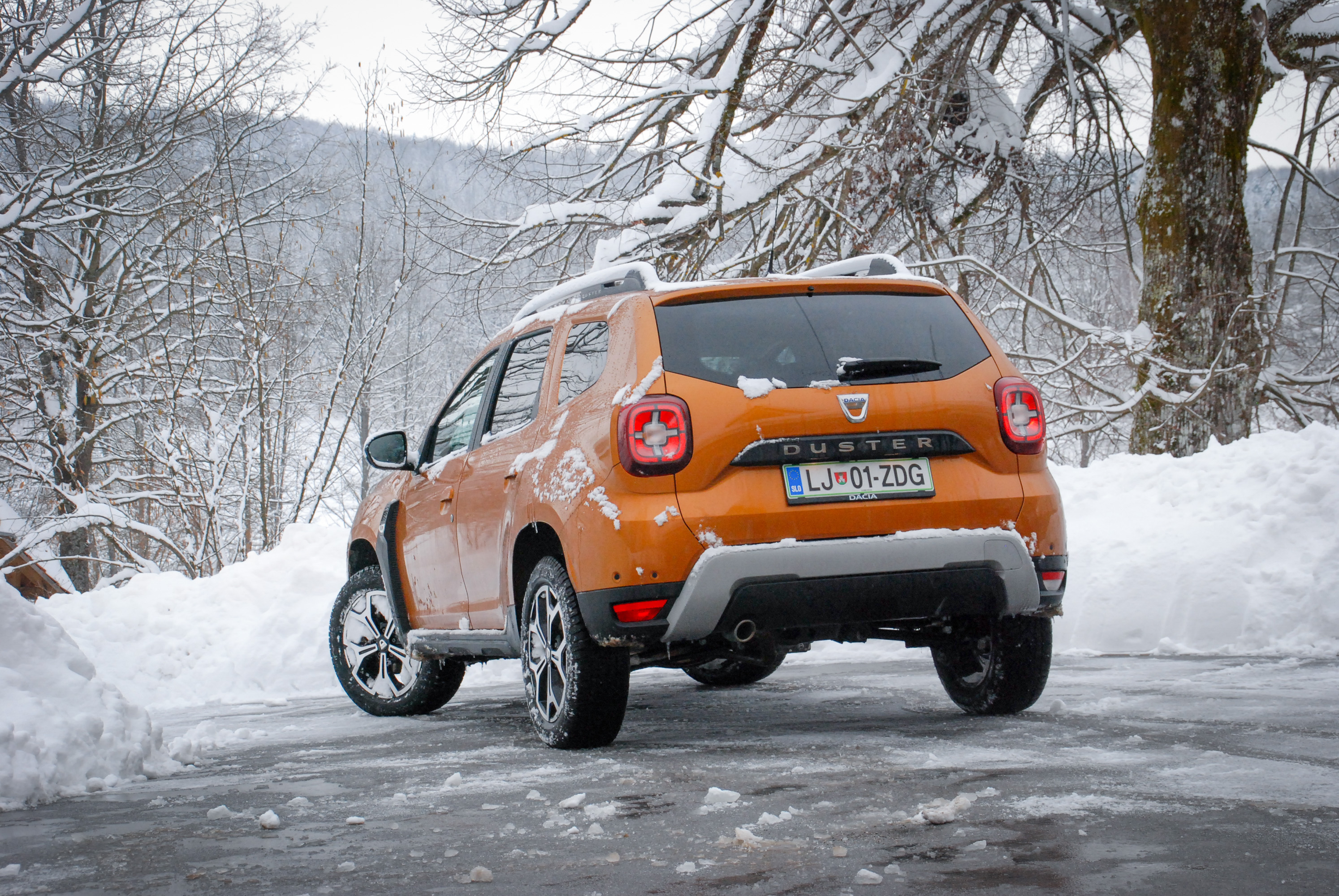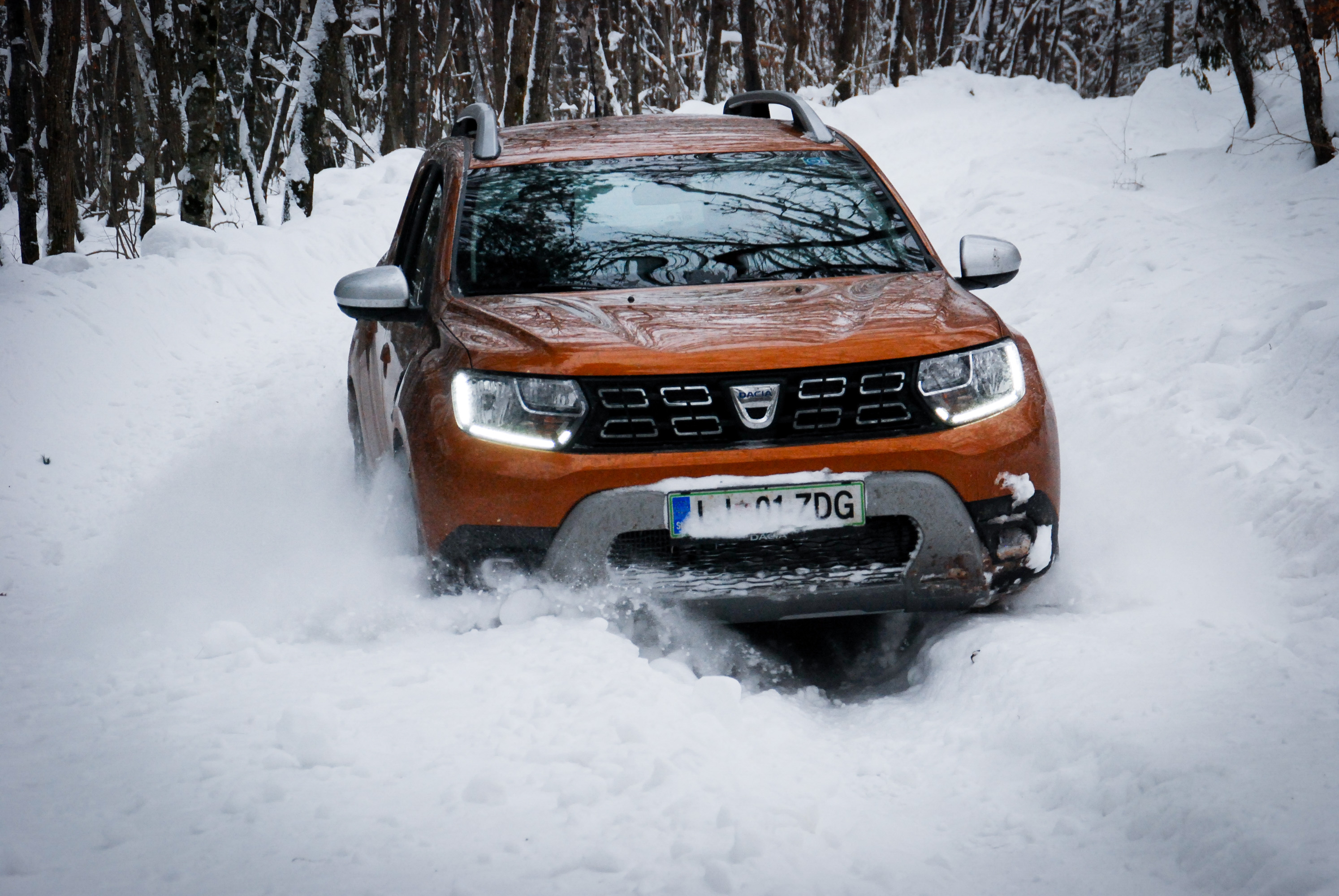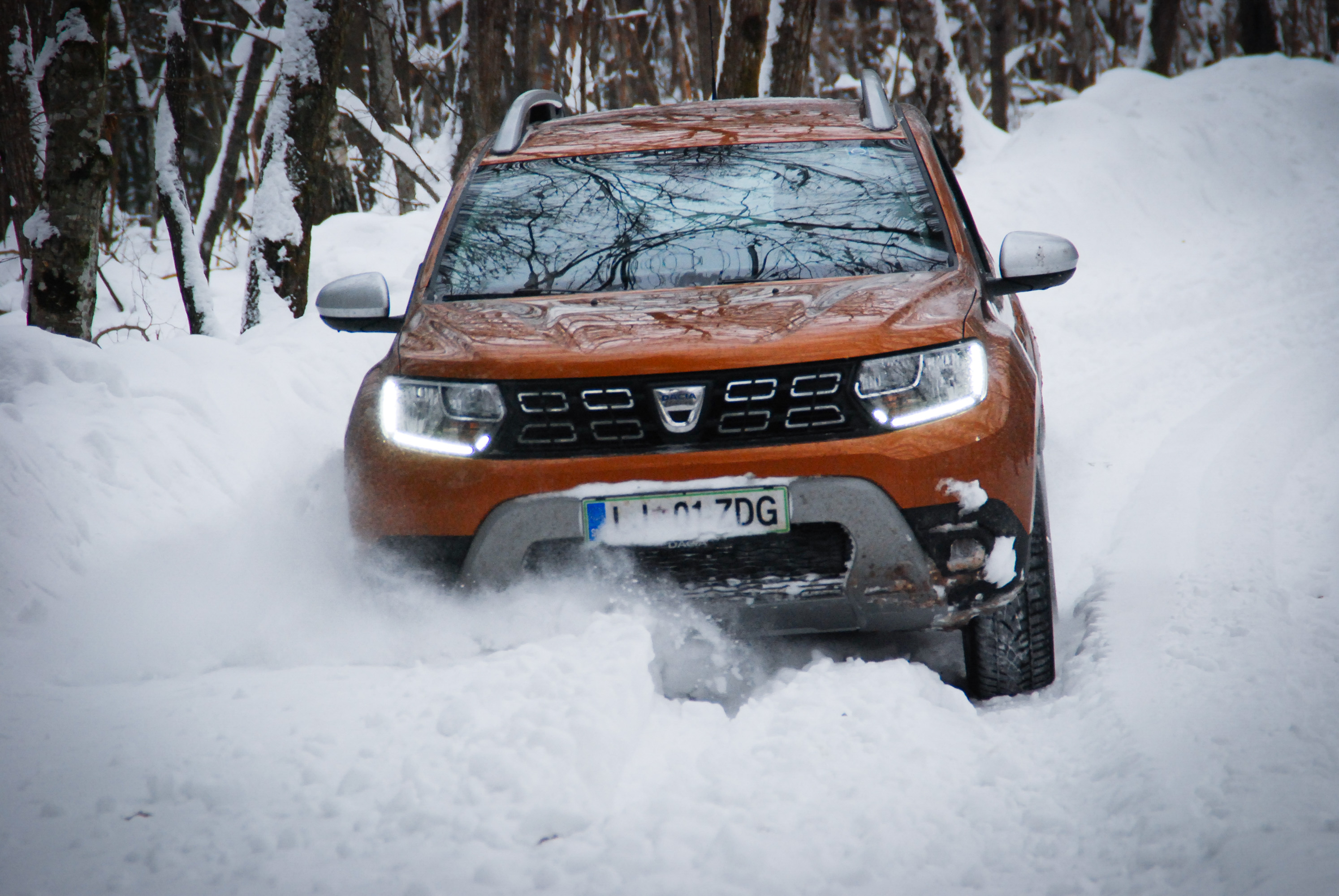 Z 21-centimetrsko oddaljenostjo od tal in zanesljivim štirikolesnim pogonom se zna duster zapeljati na vozno podlago z malo oprijema. Z njim smo brez težav rili po nespluženi gozdni cesti, na kateri je bilo 35 cm svežega snega. Za najtežje razmere kot so blato, sneg in pesek pa je mogoče vklopiti še sredinsko zaporo, ki navor med prednja in zadnja kolesa razdeli v razmerju 50:50. Ob vklopljeni funkcij lock in skrajšani 1. in 2. prestavi, ki malce nadomeščata reduktor, se duster še vedno zelo pogumno loti brezpotja. Pri tem je vozniku med koreninami in kamenjem precej v pomoč 400 evrov vreden sistem kamer, ki omogoča pogled na vse štiri strani vozila.