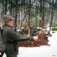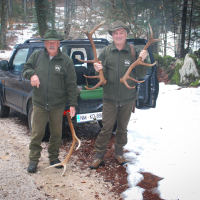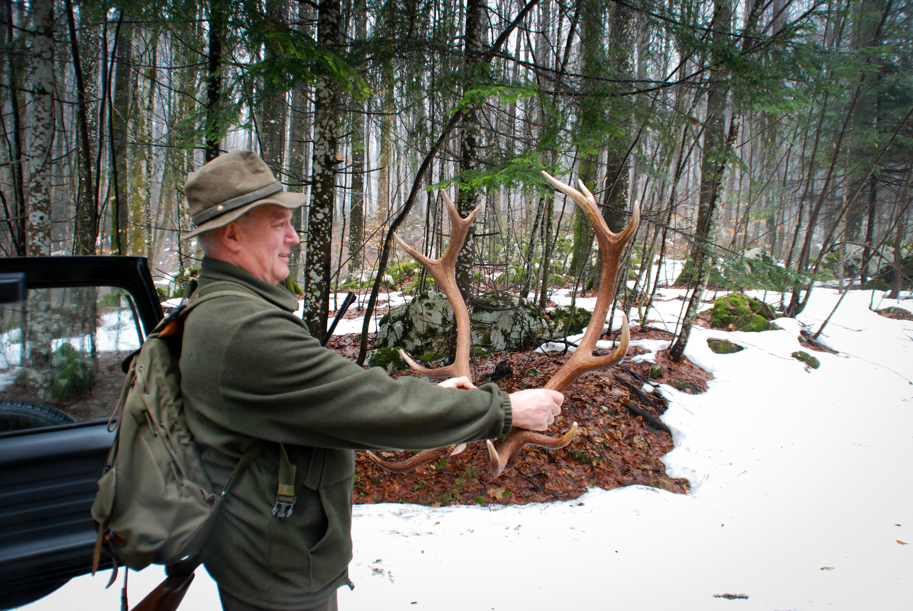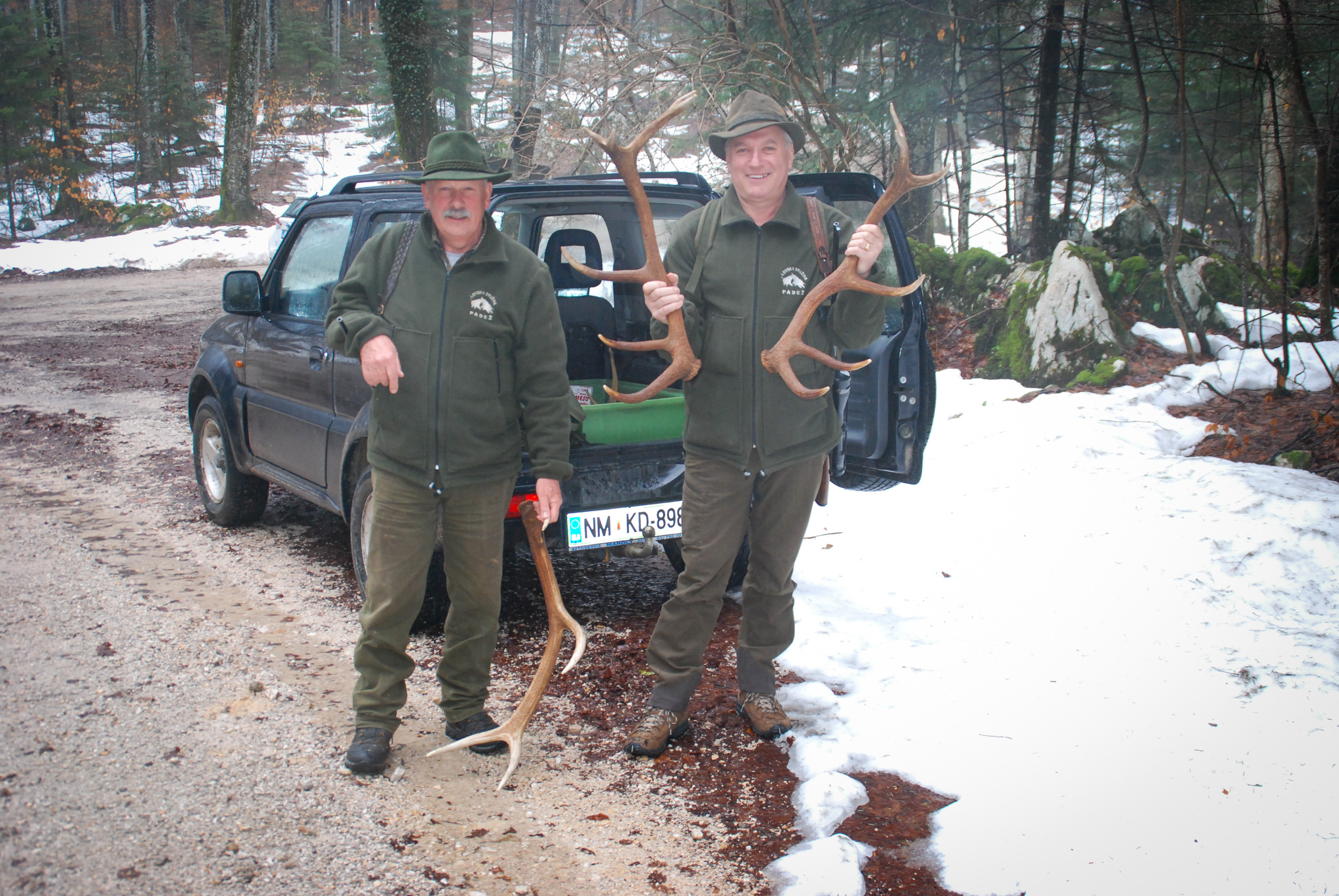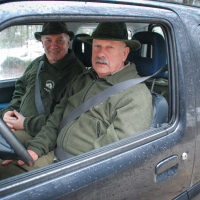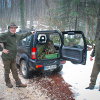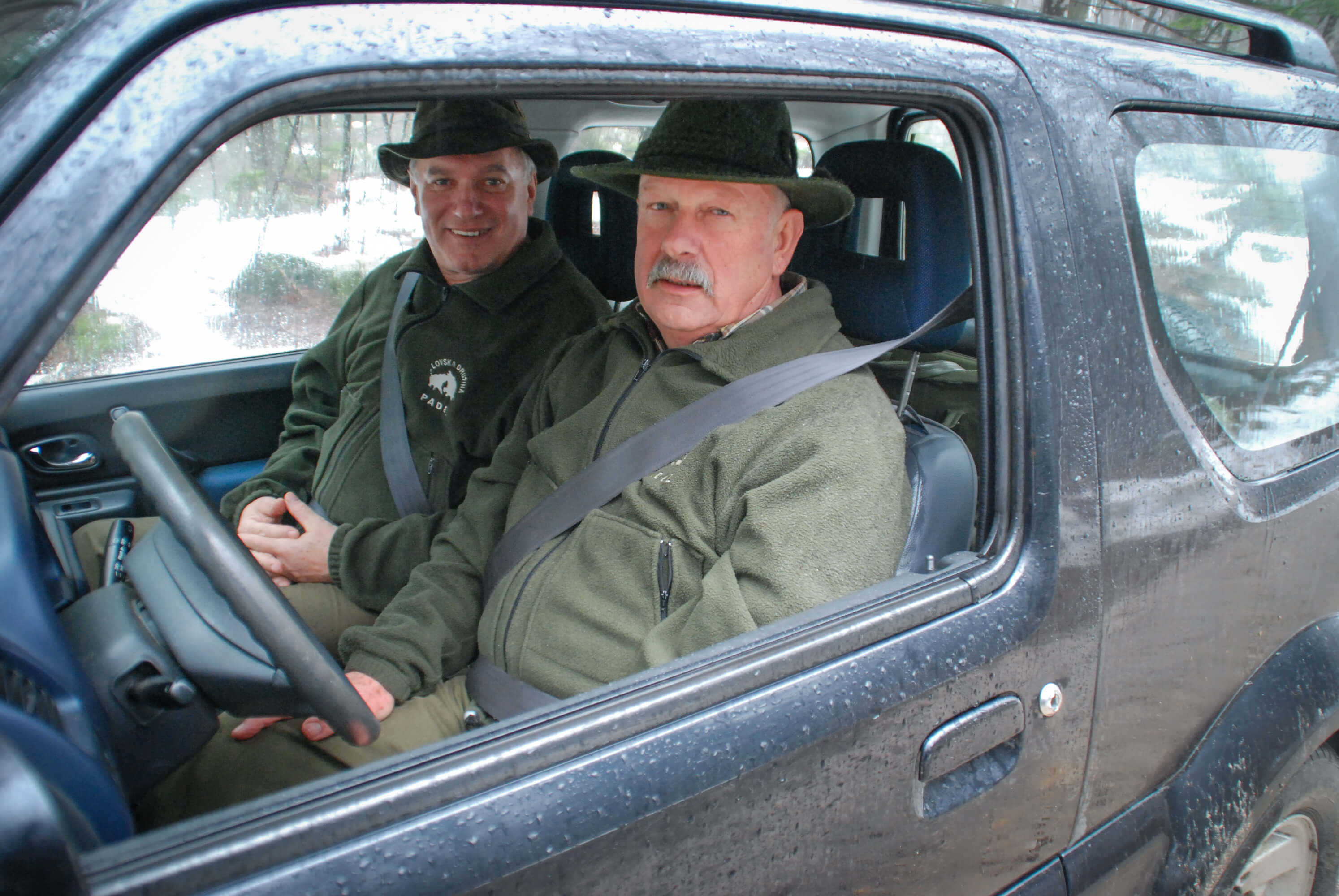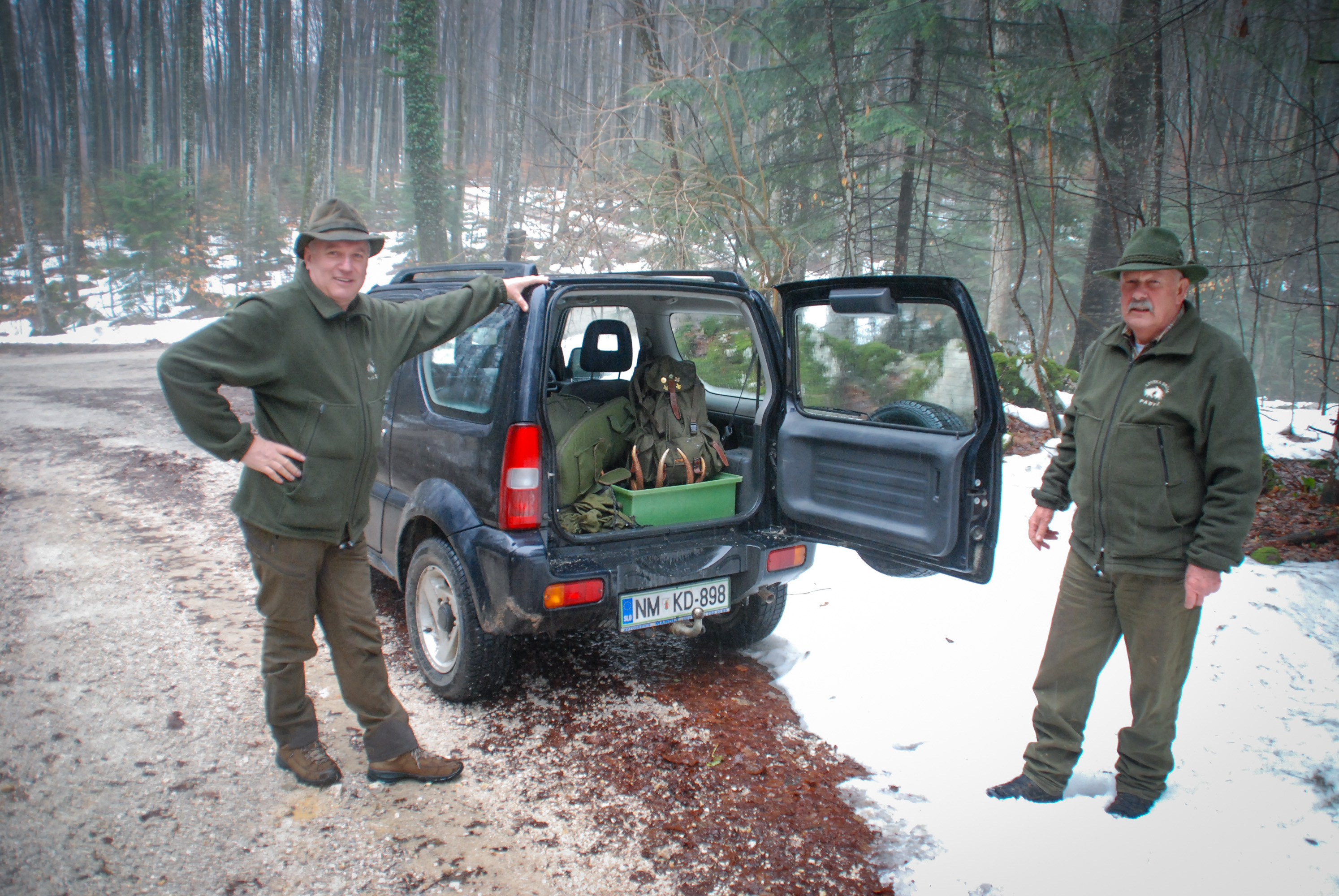 V gozd smo se tokrat podali z dvema izkušenima lovcema. Jože Kastelic in Tone Repovž iz lovske družine Padež malega jimnya, okretnega suzukija, ki ju že vrsto let zanesljivo vozi po prašnih, blatnih in zasneženih cestah, parkirata ob robu razmočene makadamske ceste. Smo globoko v gozdu, a parkiramo precej stran od križišča stečin divjadi. Podučita nas, da se pravi lovec po lovišču v nedrju gozda še vedno giblje peš, tiho in neopazno, da ne vznemirja divjih živali. Pravita, da gibanje, zadrževanje ali bivanje lovca v naravi ne sme škoditi naravi, kar precej strogo zapovedujejo tudi pravila in lovski kodeks.