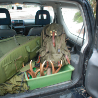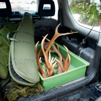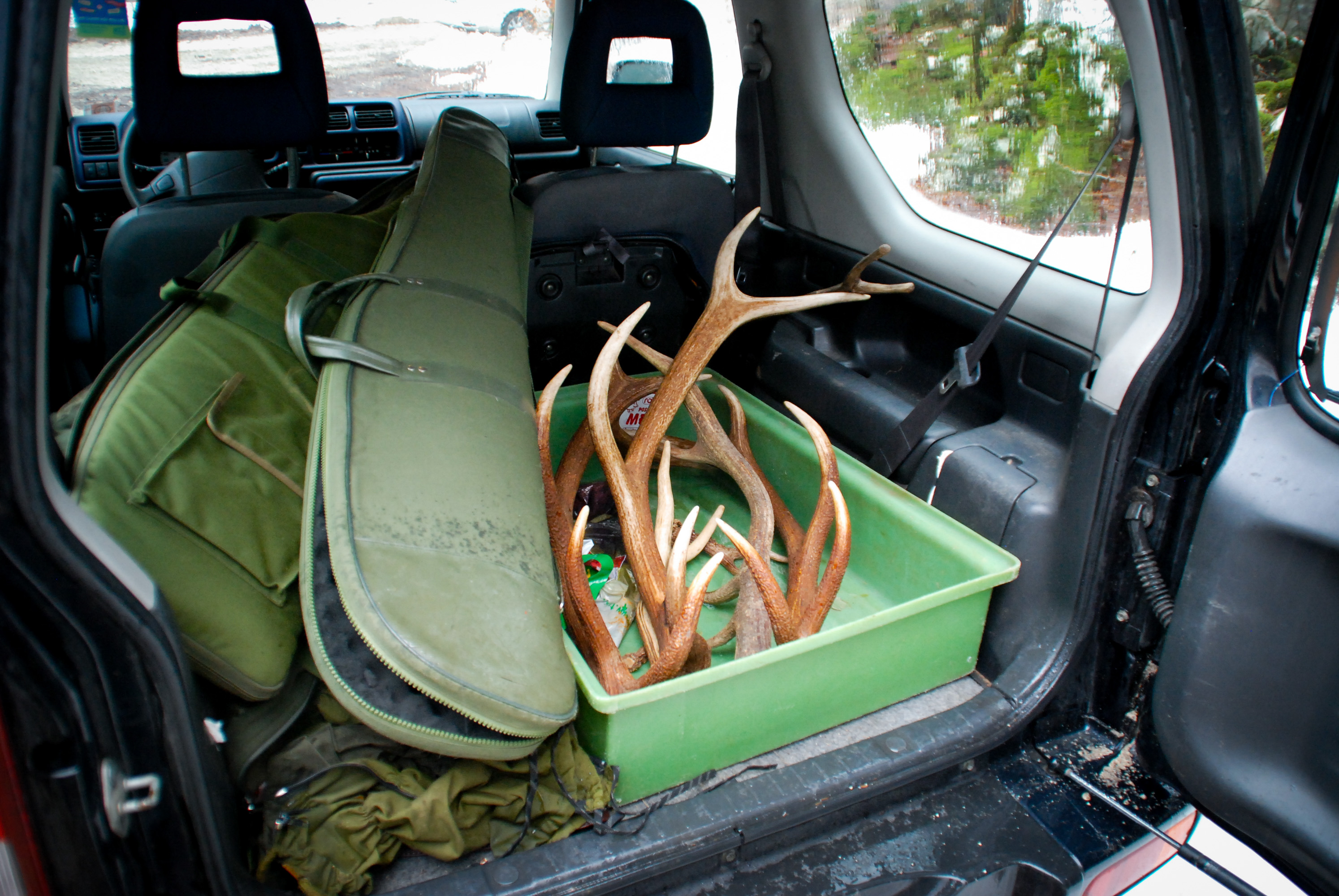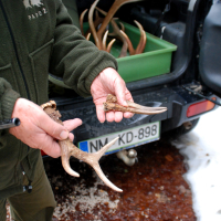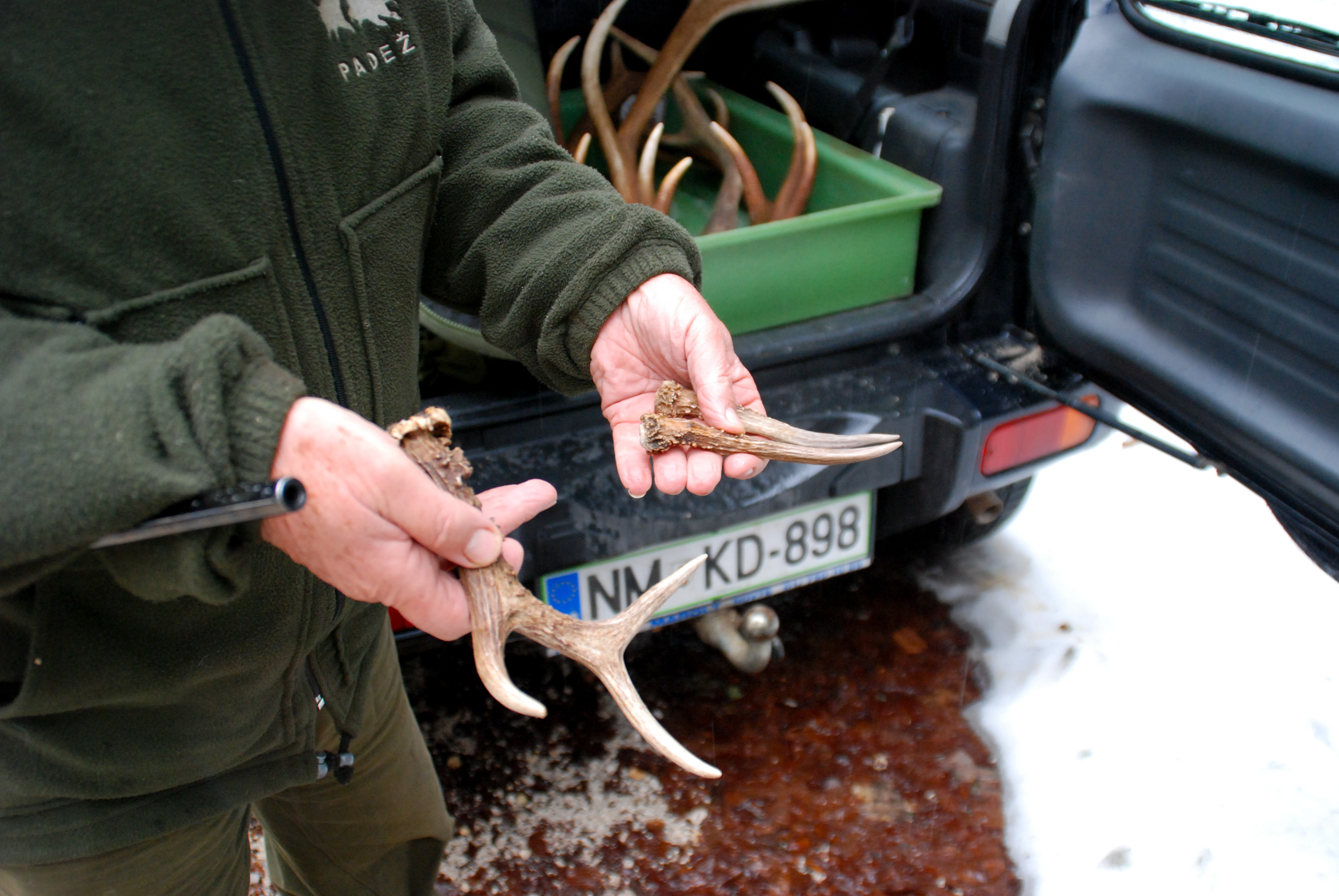 Povesta, da terenski avto le redko zapelje z gozdne ceste na vlako ali stezo - samo ob posebnih nalogah: pri dostavi jabolk, koruze in sena na krmišče, pa pri popravilu opazovalnic. Lovci veliko prehodijo peš z nahrbtniki na ramenih. Najprej skrbno pospravita puški, nato pokažeta čudovito rogovje, ki sta ga našla na obhodu v gozdu.“To je veličastno darilo narave, saj srnjad in jelenjad ravno v tem času menja rogove. Staro odpade, narava pa poskrbi za še večje in močnejše okrasje na glavah samcev. Tako trofejo lahko najde vsak, brez puške, le dobro je treba opazovati naravo,” razloži Tone.