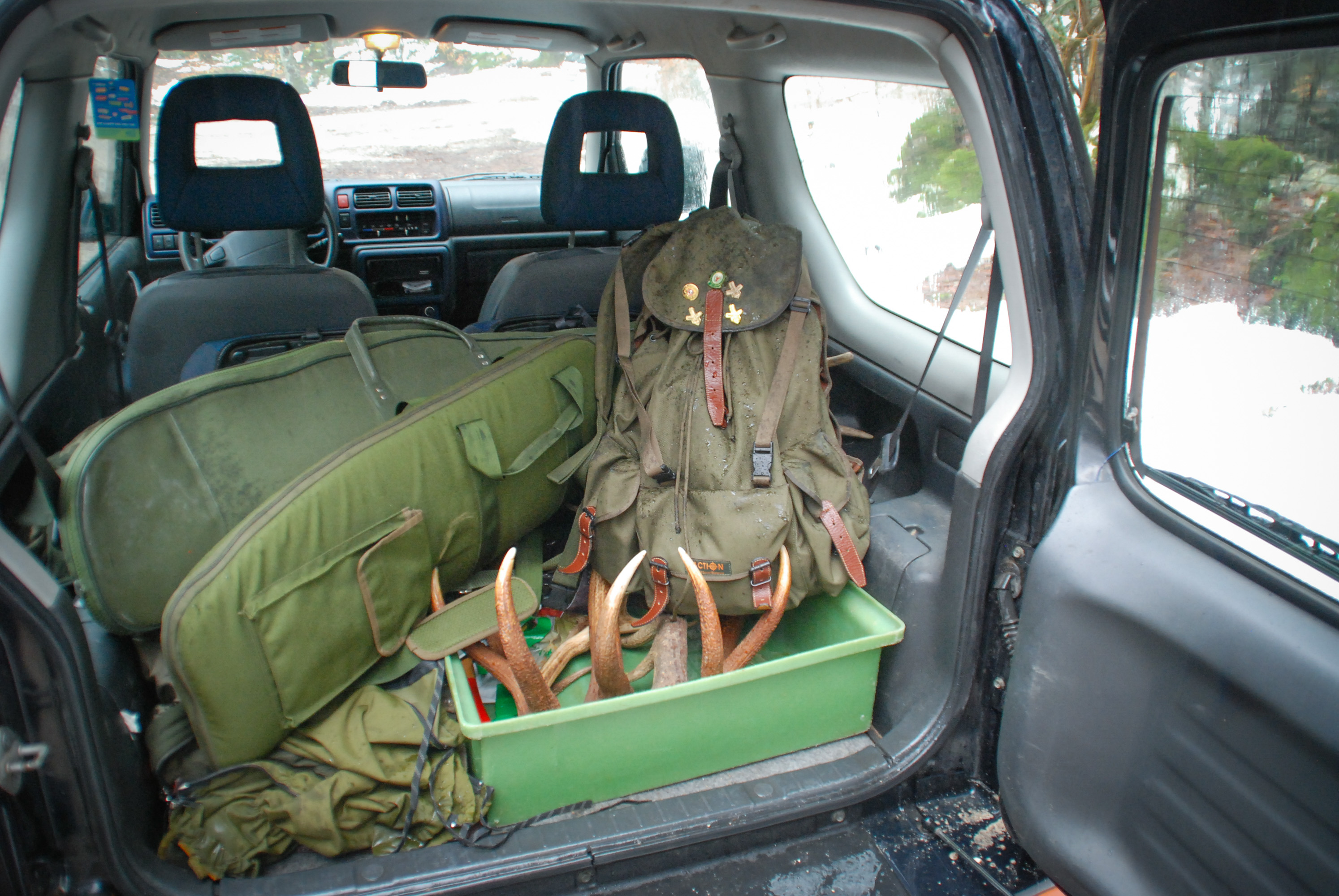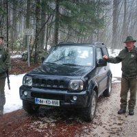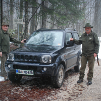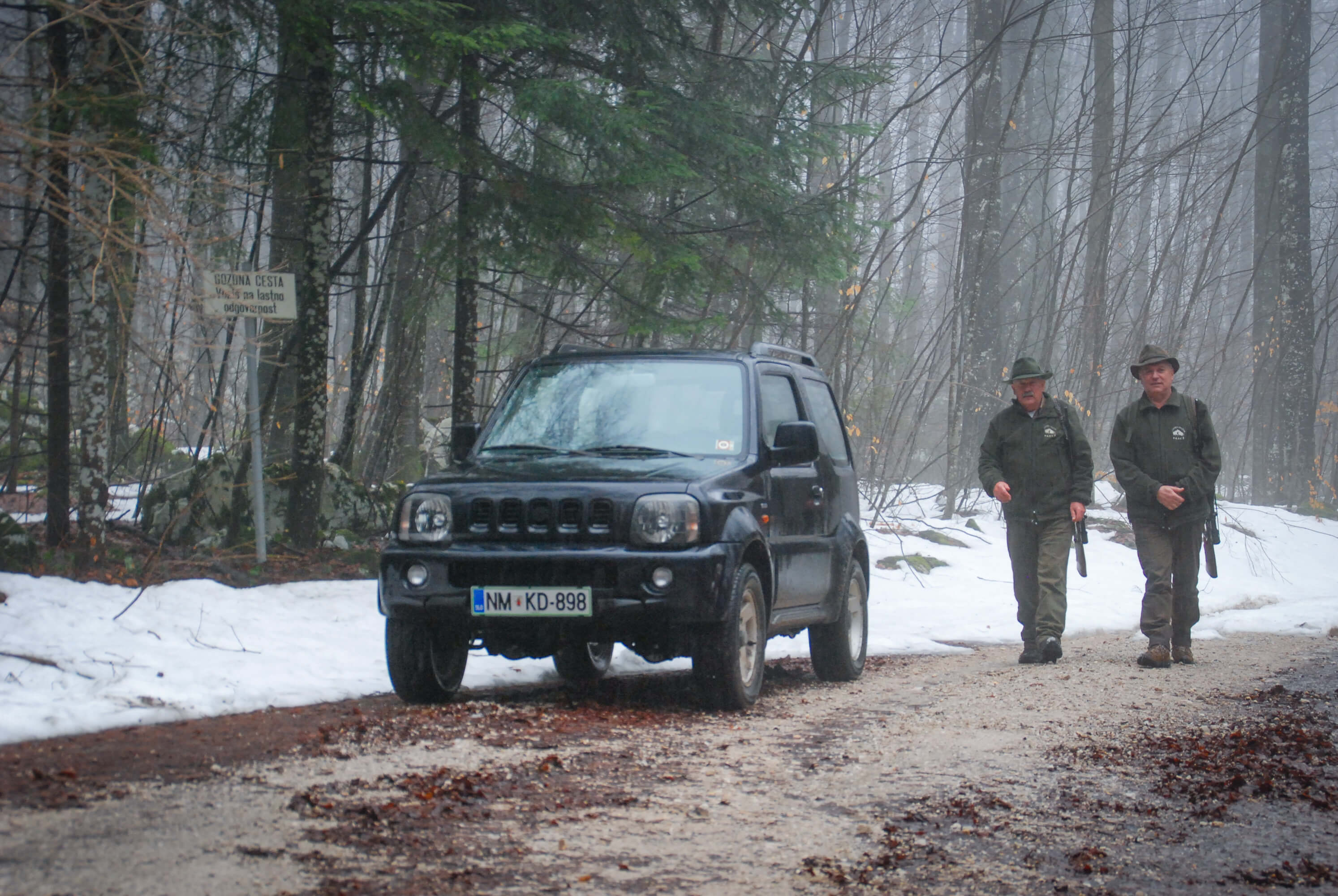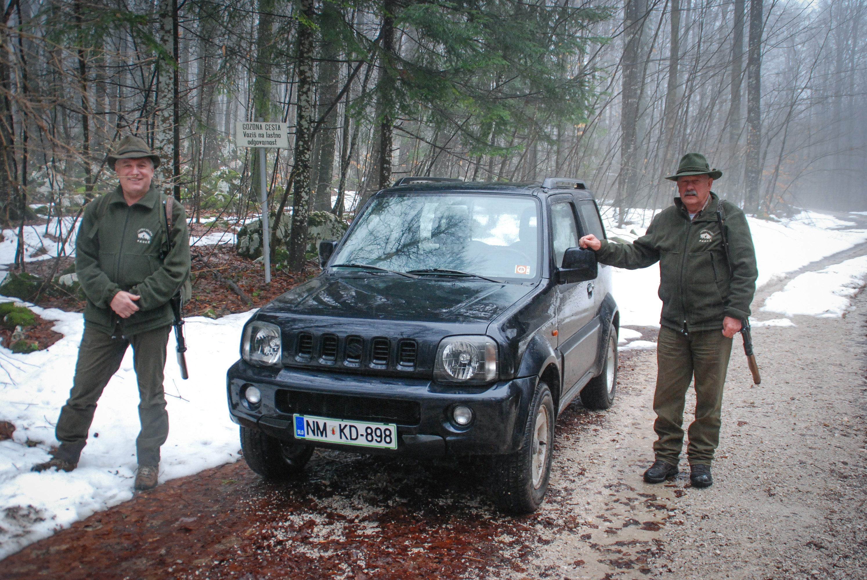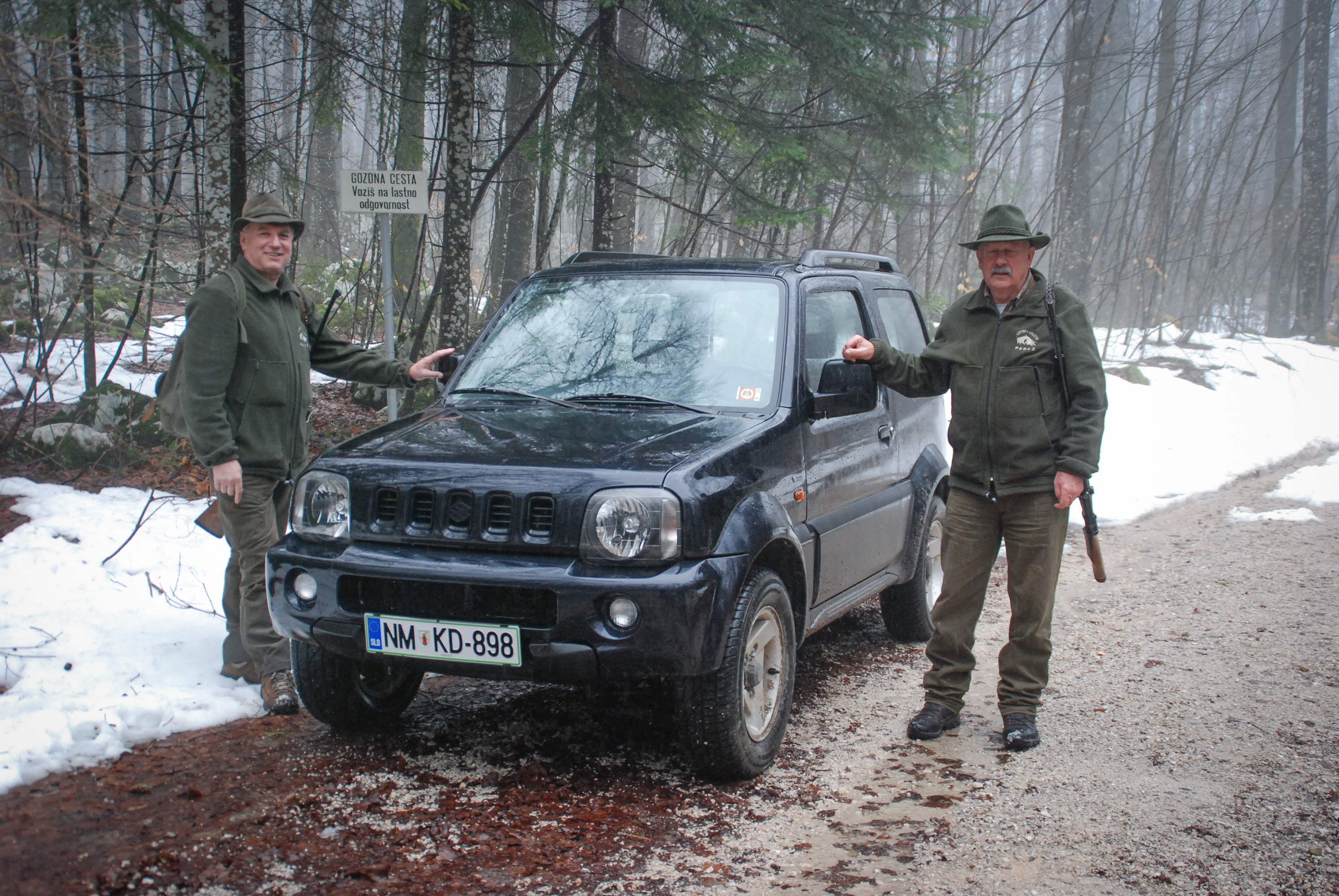 Suzuki jimny že štiri desetletja spremlja lovce. Jože pove, da je to idealen terenski avto za lovsko mobilnost. Pravi, da ima vsaka lovska družina vsaj enega, v njihovi so trije. Pogosto ga uporabljajo tudi gozdarji. Je eden redkih avtomobilov, ki zmore peljati po tako ozkih poteh, kot so jih nekoč rabili za kmečke vozove, lojtrnike. Prav njegova kompaktnost je velika prednost. “Kolesa ima postavljena povsem na rob karoserije, spleza praktično kamorkoli, je čvrst in ima zelo dober štirikolesni pogon z reduktorjem,” prednosti tega najmanjšega, a čvrstega terenca stare šole opiše Tone. Jože pravi, da ima mobilnost v gozdu svoja pravila in zahteve glede tehnike. “Že ena sama nevihta z obilico dežja in močnim vetrom ali pa snežni vihar cesto v gozdu v nekaj minutah lahko naredi neprevozno ali izjemno nevarno. Huda zima hitro pokaže zobe. V tem času mora biti del opreme tudi lopata in motorna žaga. Sicer lahko hitro obstaneš tudi z resnim terencem. Ko pred avto pade veliko drevo, ga ne moreš preskočiti,” resnost zimskih razmer na odročnih gozdnih cestah slikovito opišeta izkušena lovca in dodata, da v globokem snegu živali rade uporabljajo ceste, če so vsaj malce splužene. Hitrost vožnje je treba še bolj prilagoditi snegu in pešcem na štirih nogah. Spomladi gozdno mobilnost začinijo še težki tovornjaki s hlodovino, ki na gozdnih cestah naredijo globoke blatne kolesnice, zato se brez štirikolesnega pogona res ne pride prav daleč.