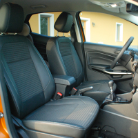 Dostop v kabino je zaradi 19-centimetrske oddaljenosti od v tal udoben. Sedežni položaj je visok. Pričakovali bi odlično preglednost, a zajetna A stebrička opazno posežeta v vidno polje in s svojo obliko celo zmanjšujeta površino vetrobranskega stekla. Prednja sedeža sta prostorna, a bočno slabo primeta telo. Na zadnji klopi je malo prostora za kolena - celo manj kot v fiesti, čeprav ima med osema ecosport dobra 2 cm več. Čisto povprečen, kratek in visok je tudi prtljažnik, katerega vrata se odpirajo vstran in ne navzgor. Čvrsta polica dvojnega dna v najvišjem položaju ne ponudi več ravne površine. Prtljaga prav nepraktično visi proti vratom.