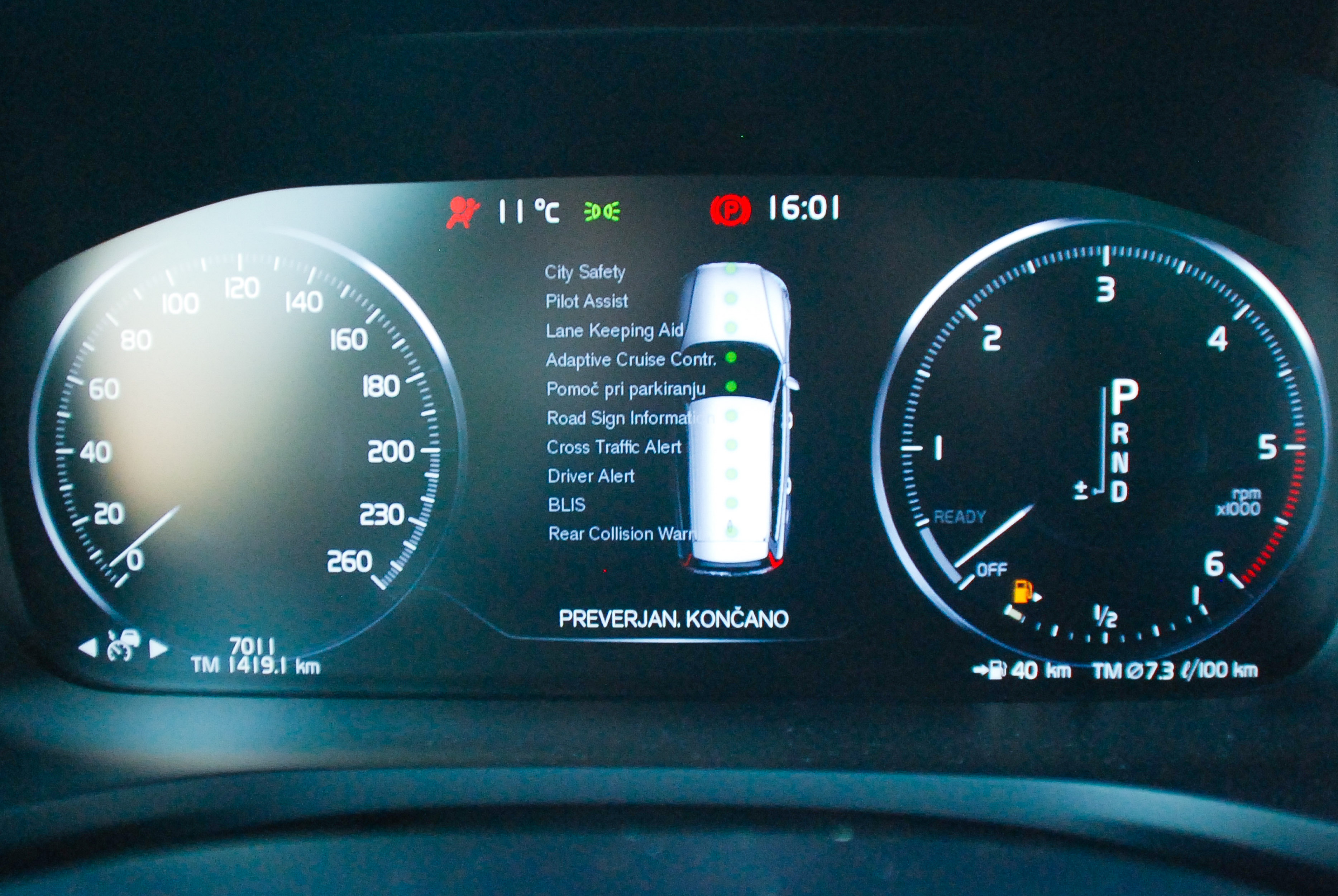 | Seznam aktivnih varnostnih vozniških pripomočkov, ki vozniku izdatno pomagajo voziti varneje je v tem avtu zelo dolg. Še bolj pa veseli dejstvo, da vsi sistemi nudijo uporabno izkušnjo, so zelo natančni in s svojimi samodejnimi posegi v vožnjo ne motijo voznikovih občutkov. Zanimivo je tudi dejstvo, da Volvo pri hitrostih nad 130 km/h svojemu asistentu (pilot assist) za polsamodejno vožnjo več ne dovoli nadzora smeri in na tak način od voznika zahteva osredotočen pristop in popolno kontrolo volana. Zanimiv pristop. |