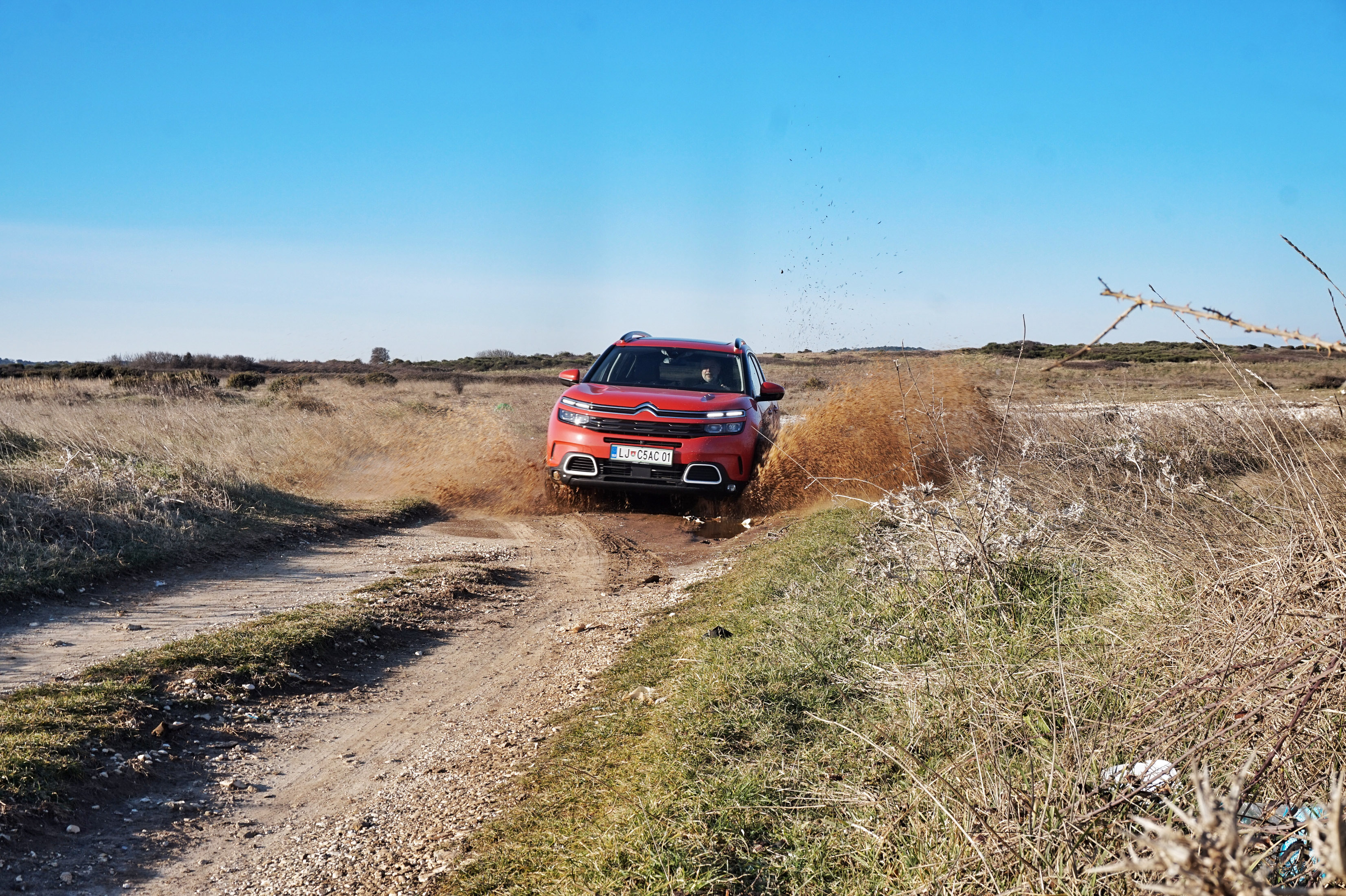 Kljub pustolovskemu videzu C5 ni terenec - štirikolesnega pogona (žal) ni v ponudbi, na doplačljiv sistem gripcontrol pa se na brezpotju ne gre zanašati. Precej bolj suveren je C5 na asfaltu: najmočnejši 2-litrski dizelski štirivaljnik z bogato zalogo navora (400 Nm) in uglašenim ter uglajenim 8-stopenjskim menjalnikom poskrbi za veliko voznega udobja in dobre zmogljivosti. Svoje dodajo še hidravlični dročniki vzmetenja, ki učinkovito gladijo tudi najostrejše sunke s ceste: udobneje se v tem razredu cestnih terencev ne pelje noben drug avto. Se pa zato C5 v ostreje odpeljanih ovinkih precej nagiba, njegov volanski mehanizem pa ni prav odziven.
