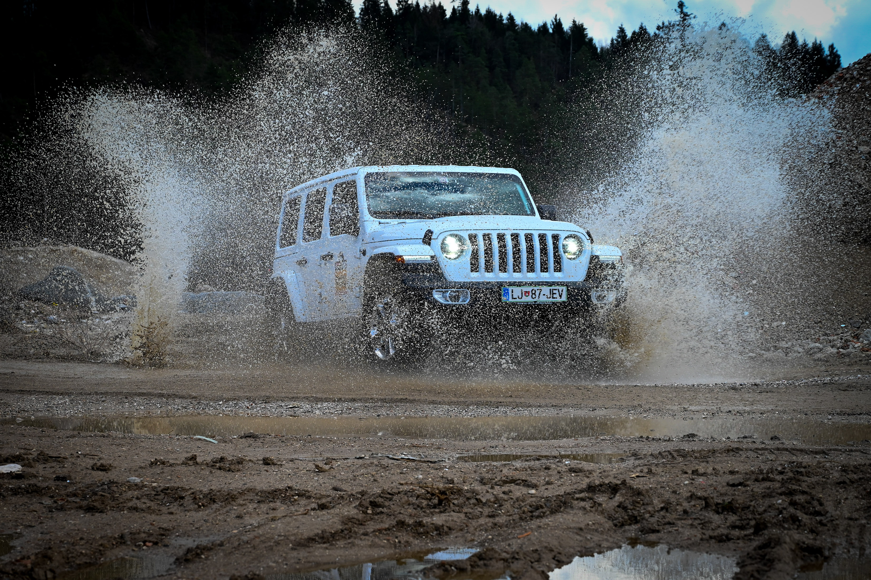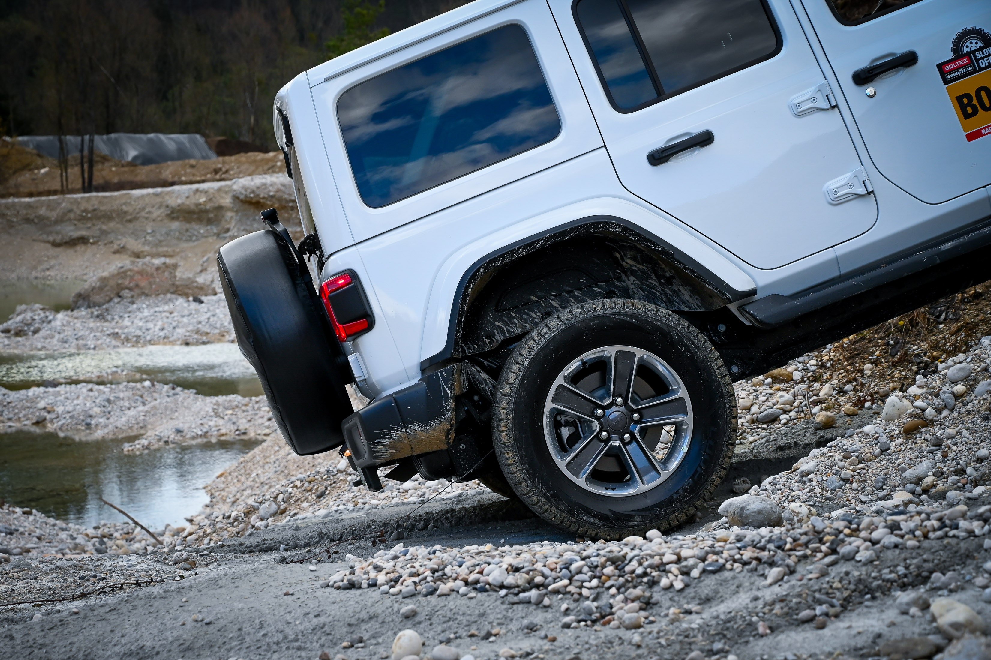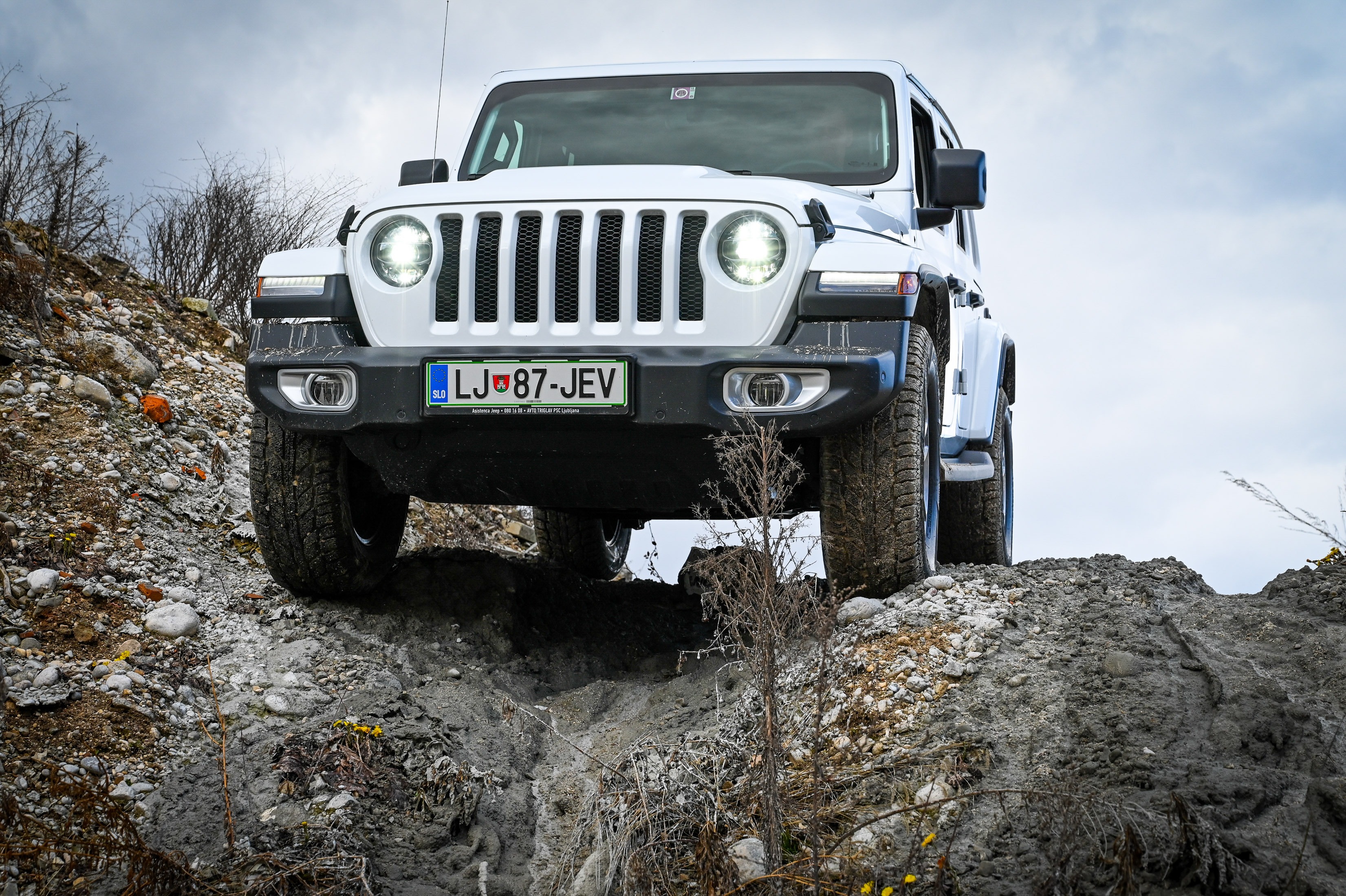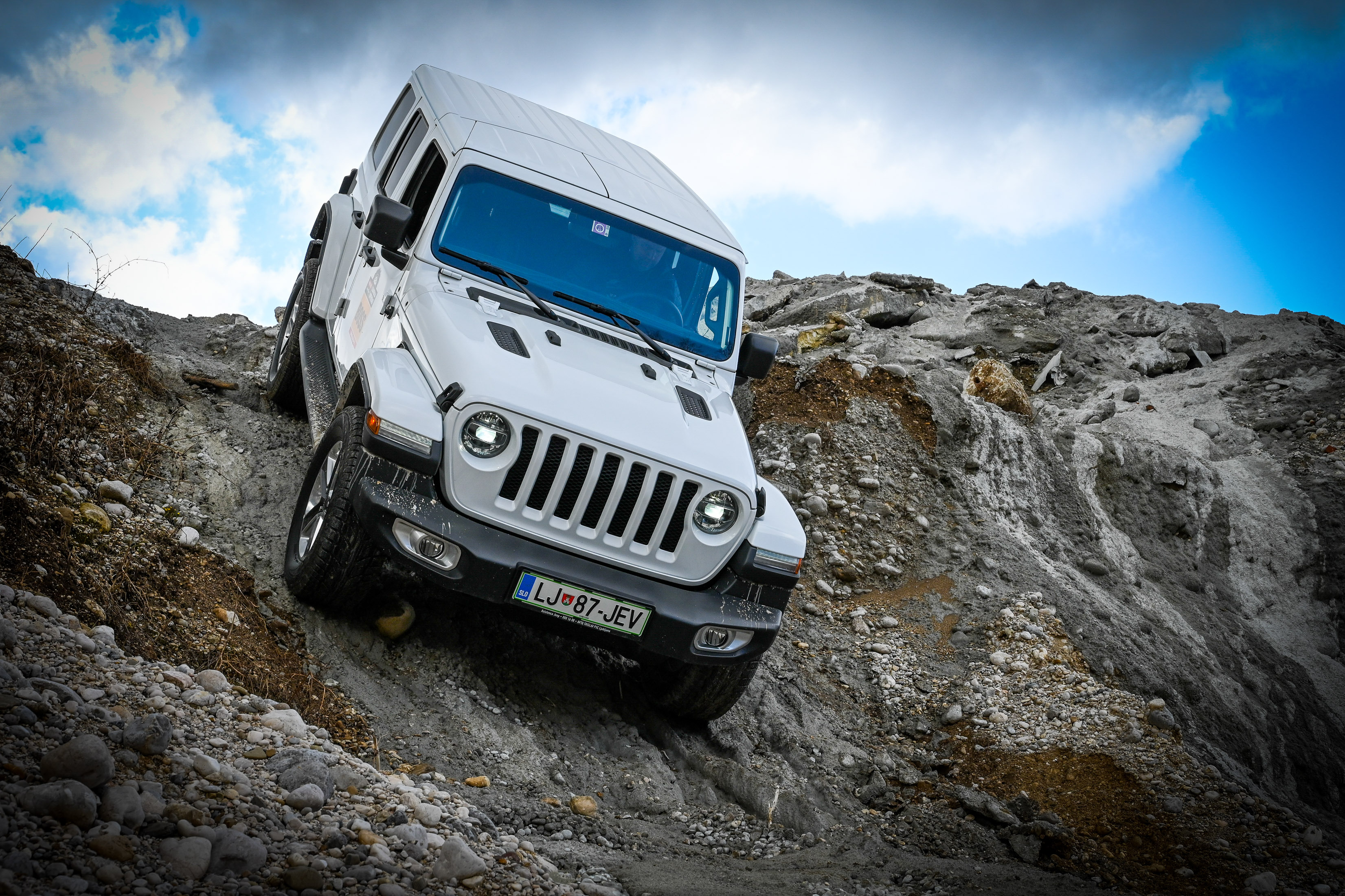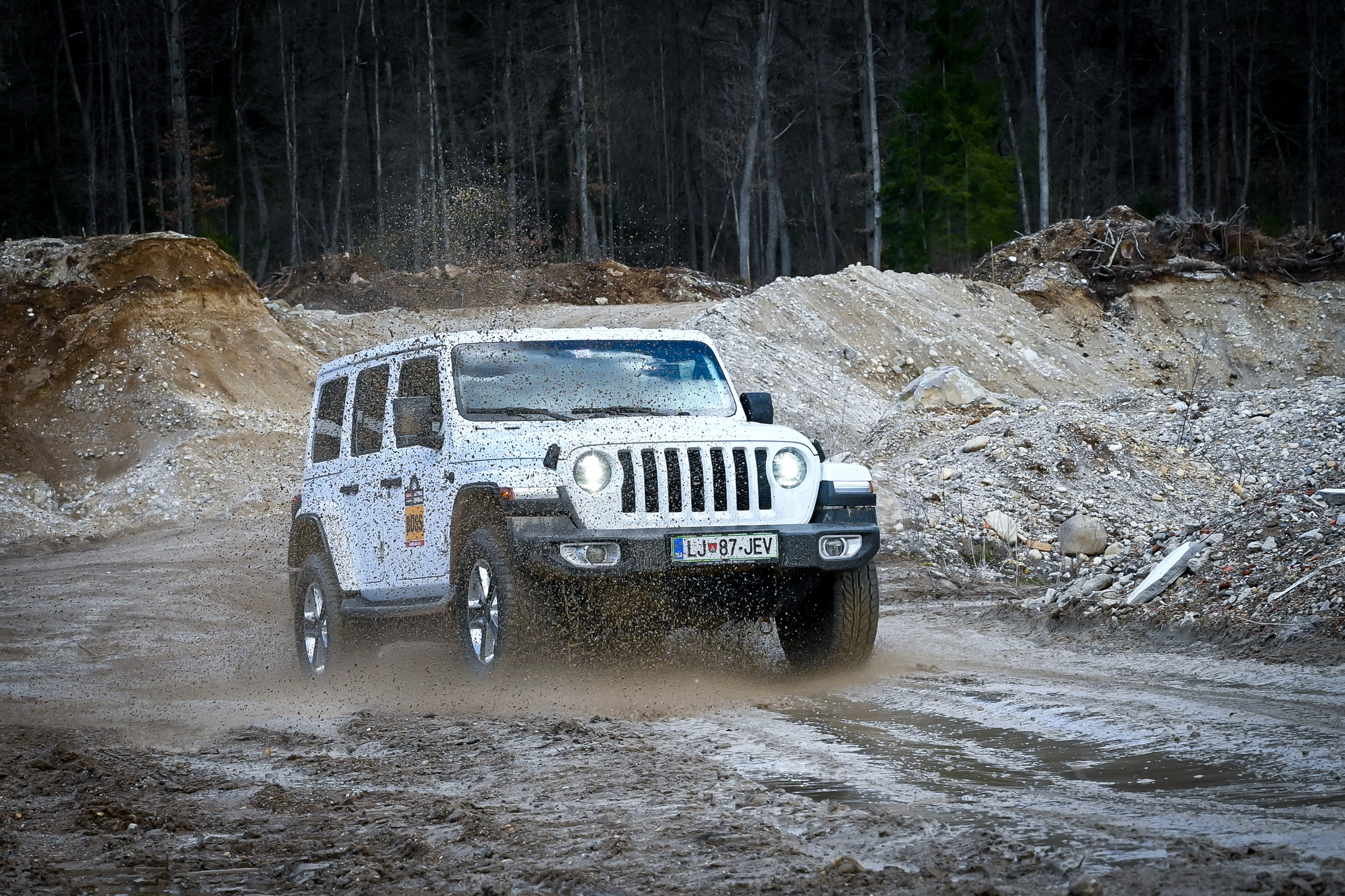 V gramoznici v Lescah smo z novo generacijo Jeepove ikone wranglerjem tudi mi preizkusili čare njegovega pravega življenjskega okolja in dobili odgovore, zakaj je ostal edini terenec, ki še vztraja s togo premo na prednjih kolesih. Kljub dejstvu, da je wrangler na asfaltu veliko bolj uglajen, kot je bil, to še vedno ostaja avto za prave terenske podvige. Dve ročici med prednjima sedežema dajeta vedeti, da lahko računaš na vselej pravi prenos navora na kolesa. Wrangler še vedno najbolj blesti, ko hitrost pade pod 40 km/h, ko se svet postavi pokonci in karoserija dobil okrasje zemeljskih barvnih tonov. Ko ročico njegovega priklopljivega in še vedno povsem mehanskega štirikolesnega pogona prestaviš v območje reduktorskega prenosa 4L, se začne prava avtomobilska svoboda. To je avto, za katerega je dovolj, da je pot le nakazana. Onstran asfalta zmore veliko in ob pravem vozniškem znanju z njim zlepa ne boste obtičali. Brede lahko po več kot 70 centimetrov globoki vodi, z veliko oddaljenostjo od tal (serijsko 27,7 cm) je zmožen prestopati korenine in se s hitrostjo od 3 do 5 km/h plaziti preko kamenja. Z inštruktorjem Janezom Maroltom sva v gramoznici z wranglerjem premagala nekaj zares strmih terenov, kjer je do izraza prišla tudi njegova karoserija s kolesi, postavljenimi na skrajne robove.