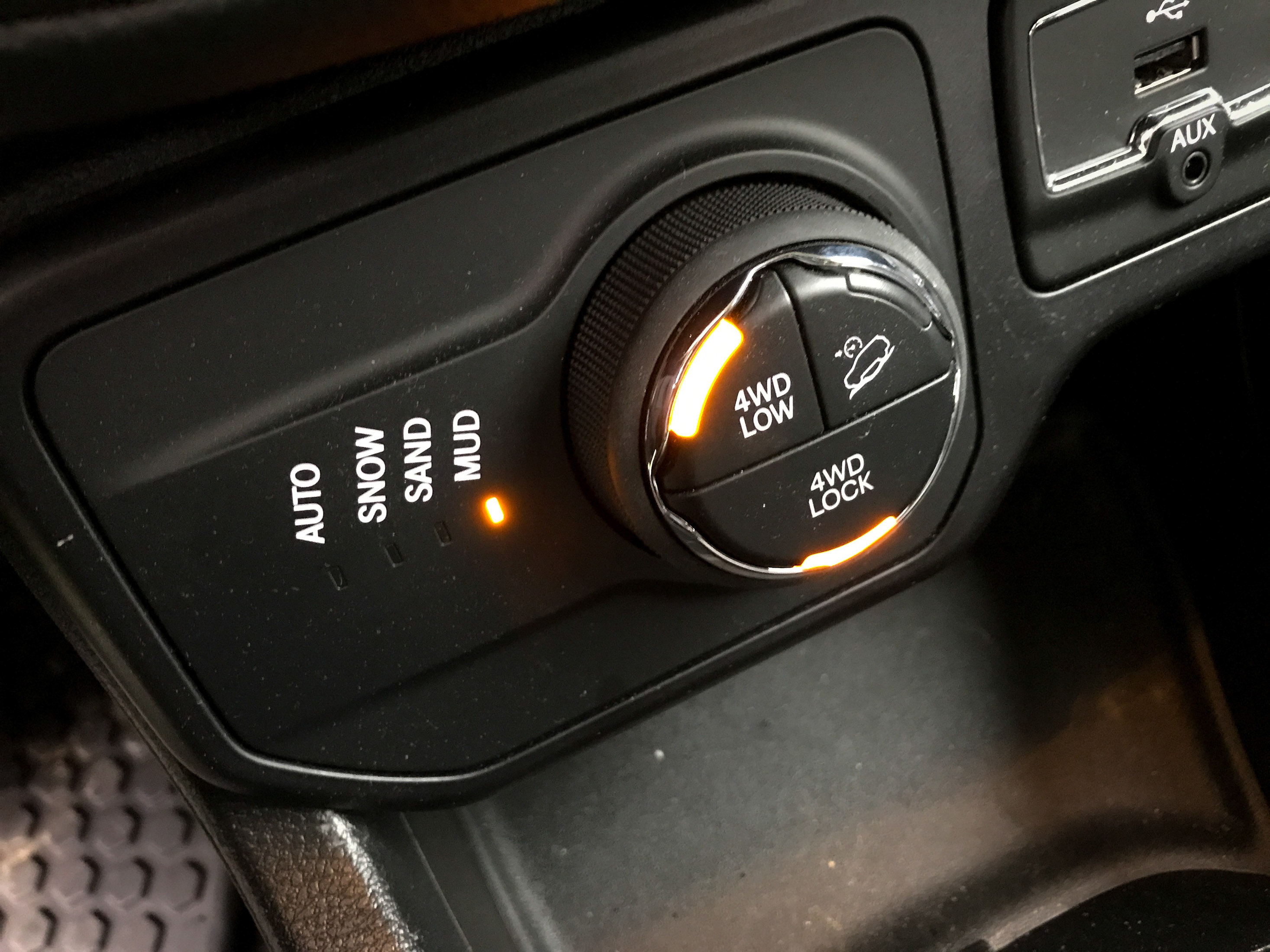 Testni renegade je bil opremljen z zmogljivejšo različico štirikolesnega pogona Jeep active drive low. Ta je na voljo le v kombinaciji z močnejšim dizelskim motorjem in 9-stopenjskim samodejnim menjalnikom. V osnovi je pogon speljan na prednji kolesi in ob vklopljenem samodejnem programu štirikolesnega pogona le v primeru zdrsa navora prenese tudi na zadnjo os. Ta način ne potrebuje nikakršnega posredovanja voznika, namenjen pa je tudi vožnji po asfaltu, saj izboljšuje vozniško dinamiko oziroma povečuje oprijem in zmanjša možnosti zdrsa preko prednjih koles ali izgube oprijema na zadnjih kolesi oziroma zdrsa zadnjega dela avta. Preko vrtljivega stikala lahko pa lahko voznik pogon v naprej prilagodi za vožnjo po snegu, pesku in blatu. Z vklopom stikala 4WD lock se sproži zaklop sklopke v prednji odgonski enoti in kardanska gred pogon v prilagodljivem razmerju vseskozi prenaša še na zadnji kolesi. Kot zadnji steber obrambe predvsem v strmih in razritih poteh, kjer je potrebno inercijo vzdrževati pri nižjih hitrostih, a z dovolj navora na kolesih, pa je testni renegade ponujal vklop načina 4WD low. Ta funkcija zvišuje prestavno razmerje na 20 : 1 z drugačno razporeditvijo navora med prednjo in zadnjo osjo. Renegade torej v zasnovi pogona nima klasičnega mehanskega reduktorja kot wrangler rubicon.
