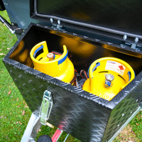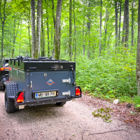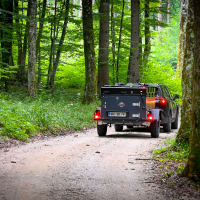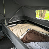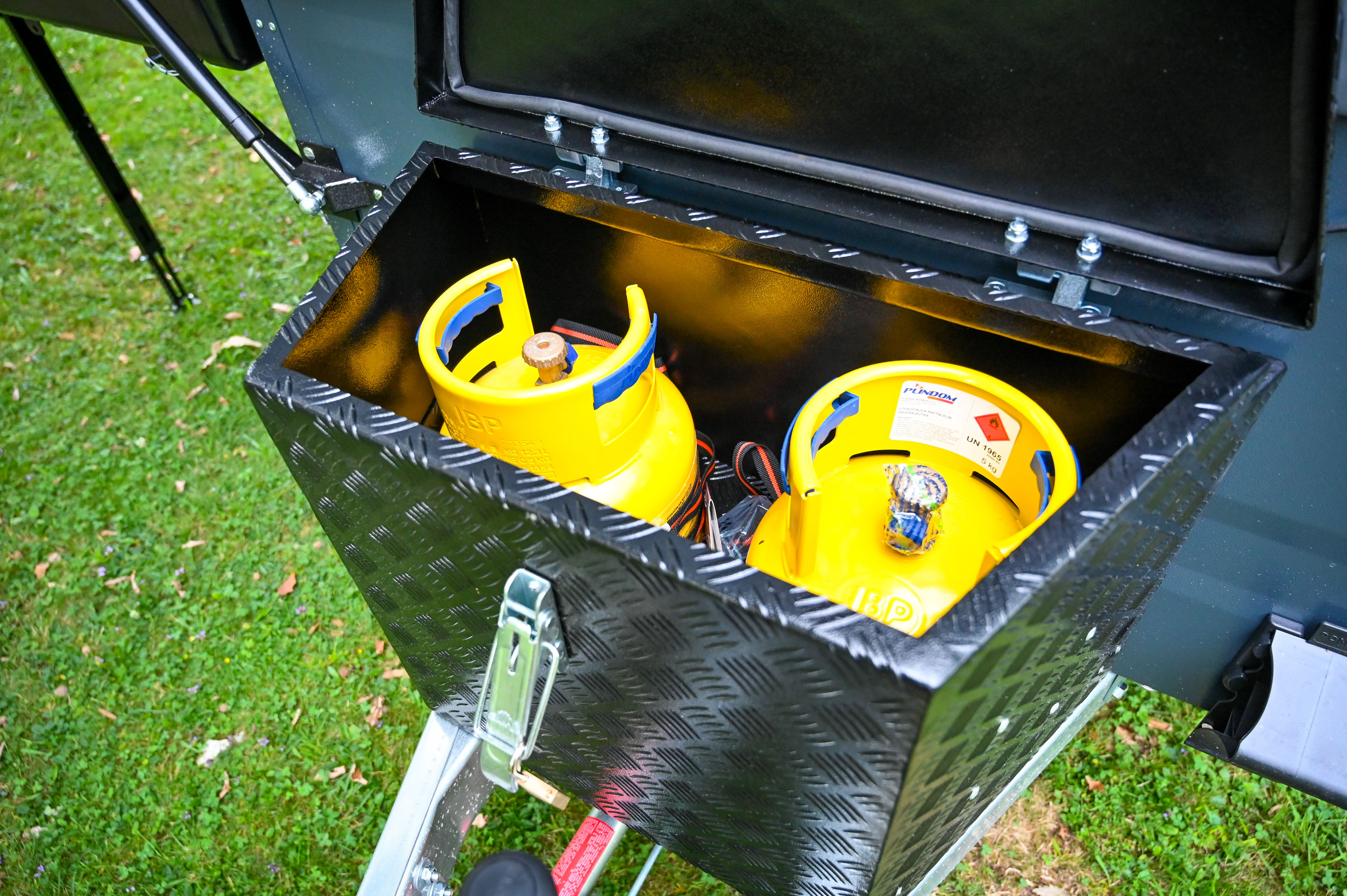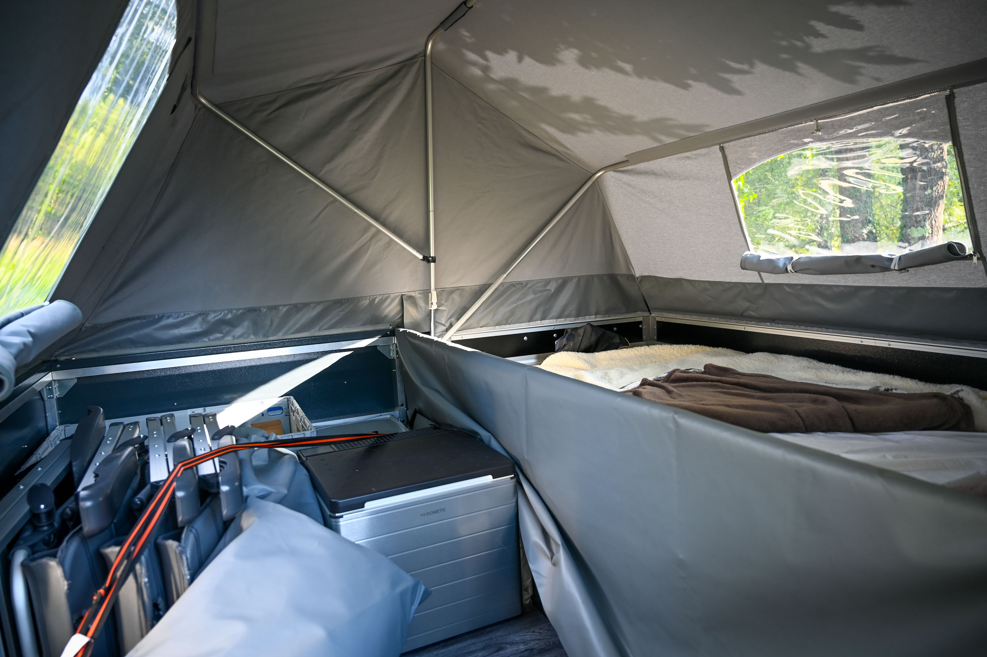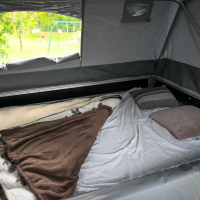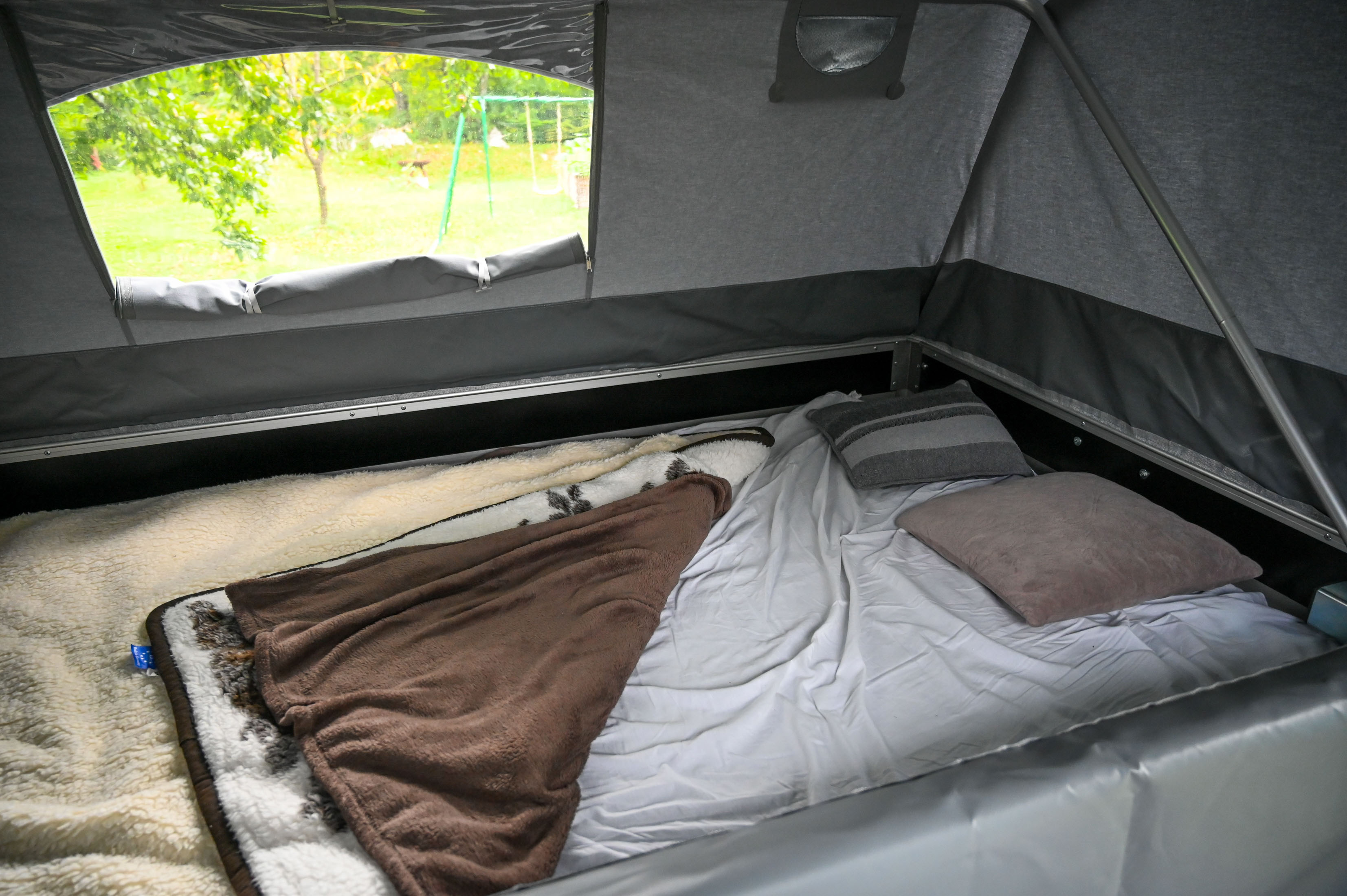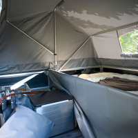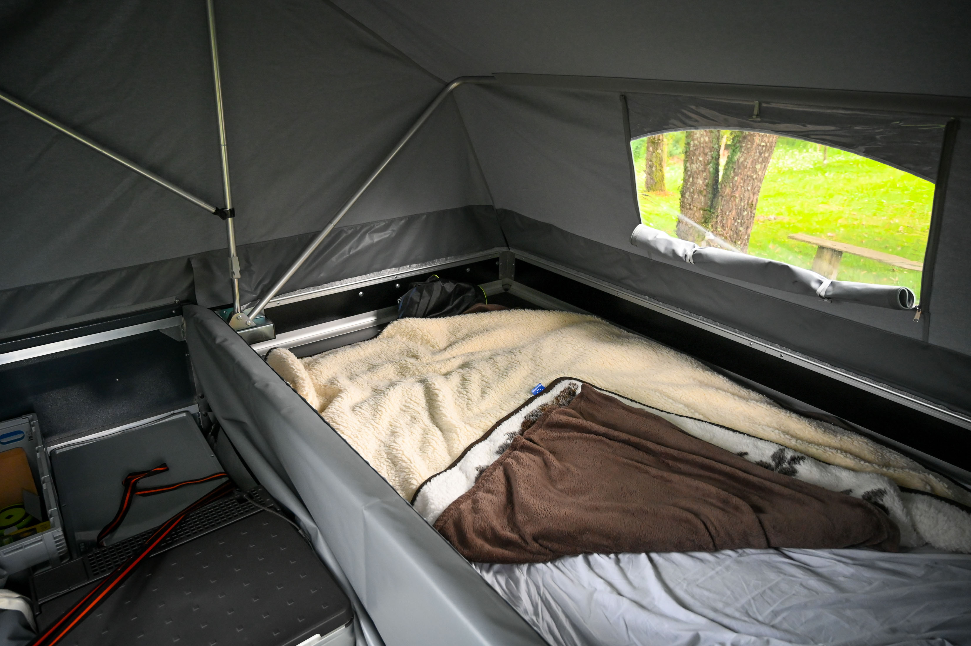 V robustni terenski prikolici smo preživeli tudi nevihtno noč z močnim vetrom in nalivom: zaradi velike stabilnosti in čvrstih elementov ter odličnega odvodnjavanja s strehe ni v notranjost prišla niti kaplja vode. Prenočevanje visoko nad tlemi nudi veliko udobja predvsem v klimatsko zahtevnejših okoljih. Pod mansardni del ležišča je mogoče namestiti platnene stranice, s čimer dobimo suh prostor za shranjevanje opreme.