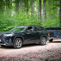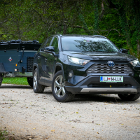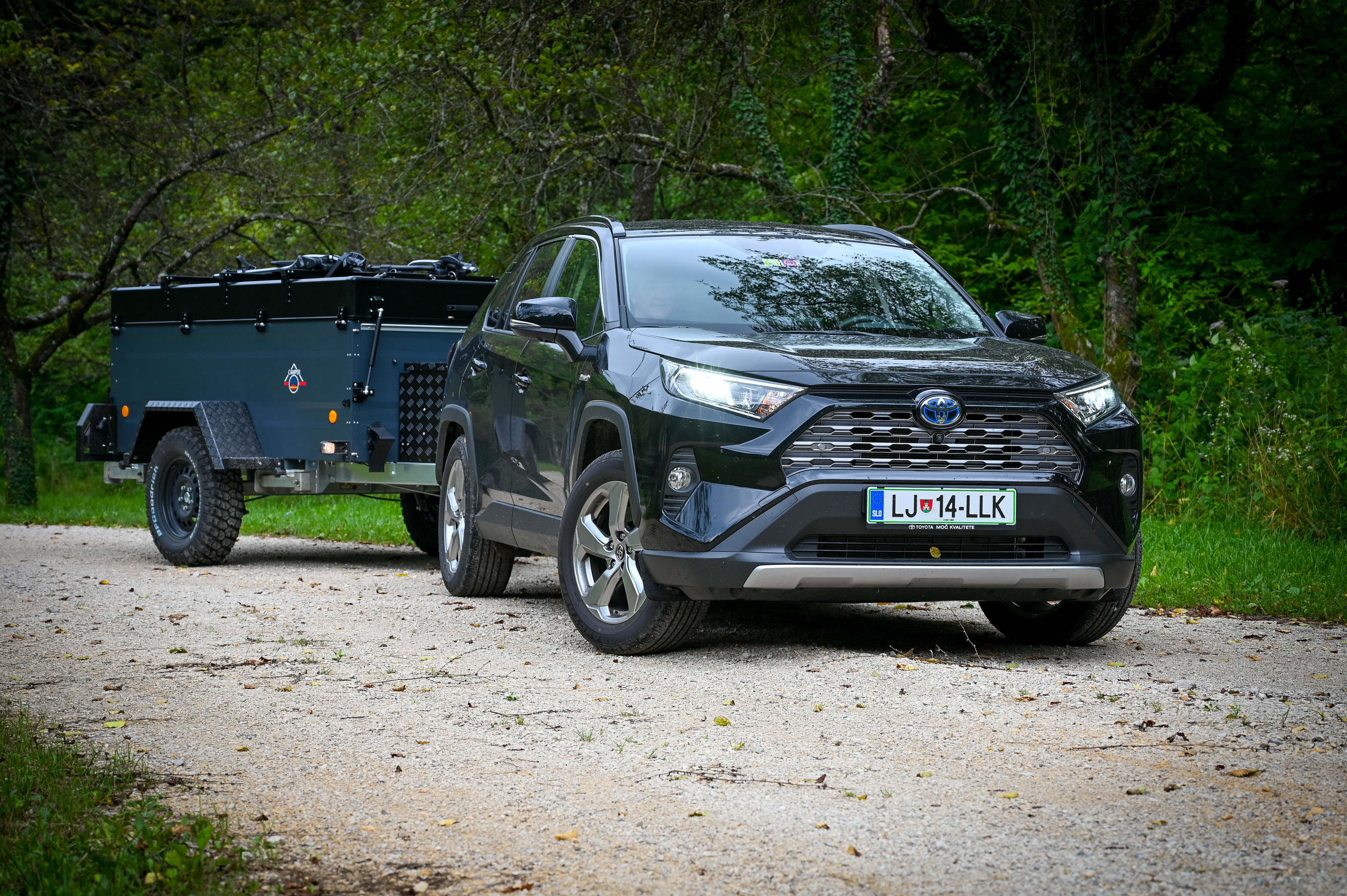 Na testu smo dobrih 400 kilometrov za seboj vlekli skoraj 4-metre dolgo počitniško šotorsko prikolico s skupno dovoljeno maso 1000 kg - tudi po zelo slabi makadamski cesti. RAV4 je tudi s pripeto prikolico odlično vodljiv, stabilen in dobro odziven. Električni štirikolesni pogon je prikolico brez težav potegnil tudi strmo navkreber do kamp parcele, pa čeprav je bil pod kolesi moker travnat kolovoz. Ob 163 bencinsko-električnih kW nismo v nobenem trenutku začutili, da bi vleka kakorkoli vpliva ne odzivnost motorja ali brezstopenjskega menjalnika. RAV4 je ob tem v povprečju zahteval dobra dva decilitra več goriva na 100 kilometrov.