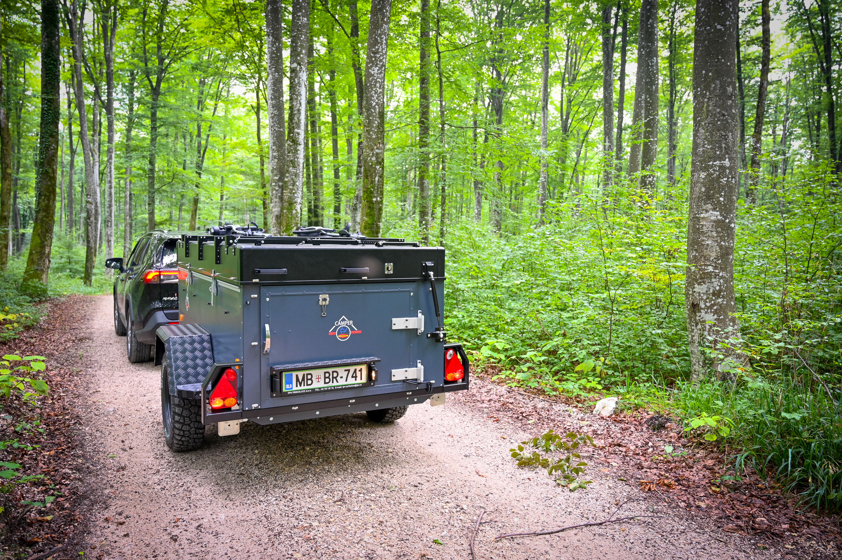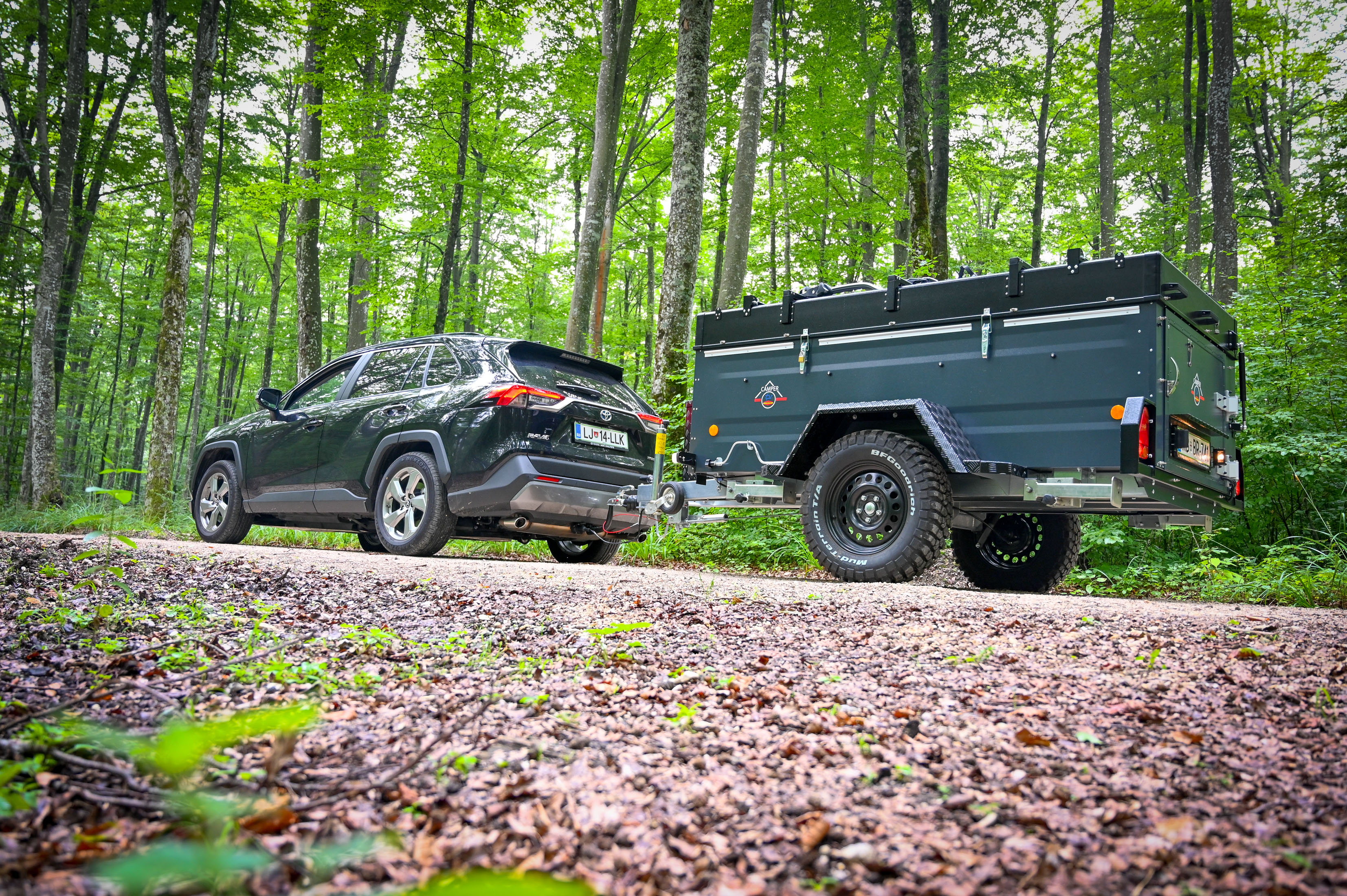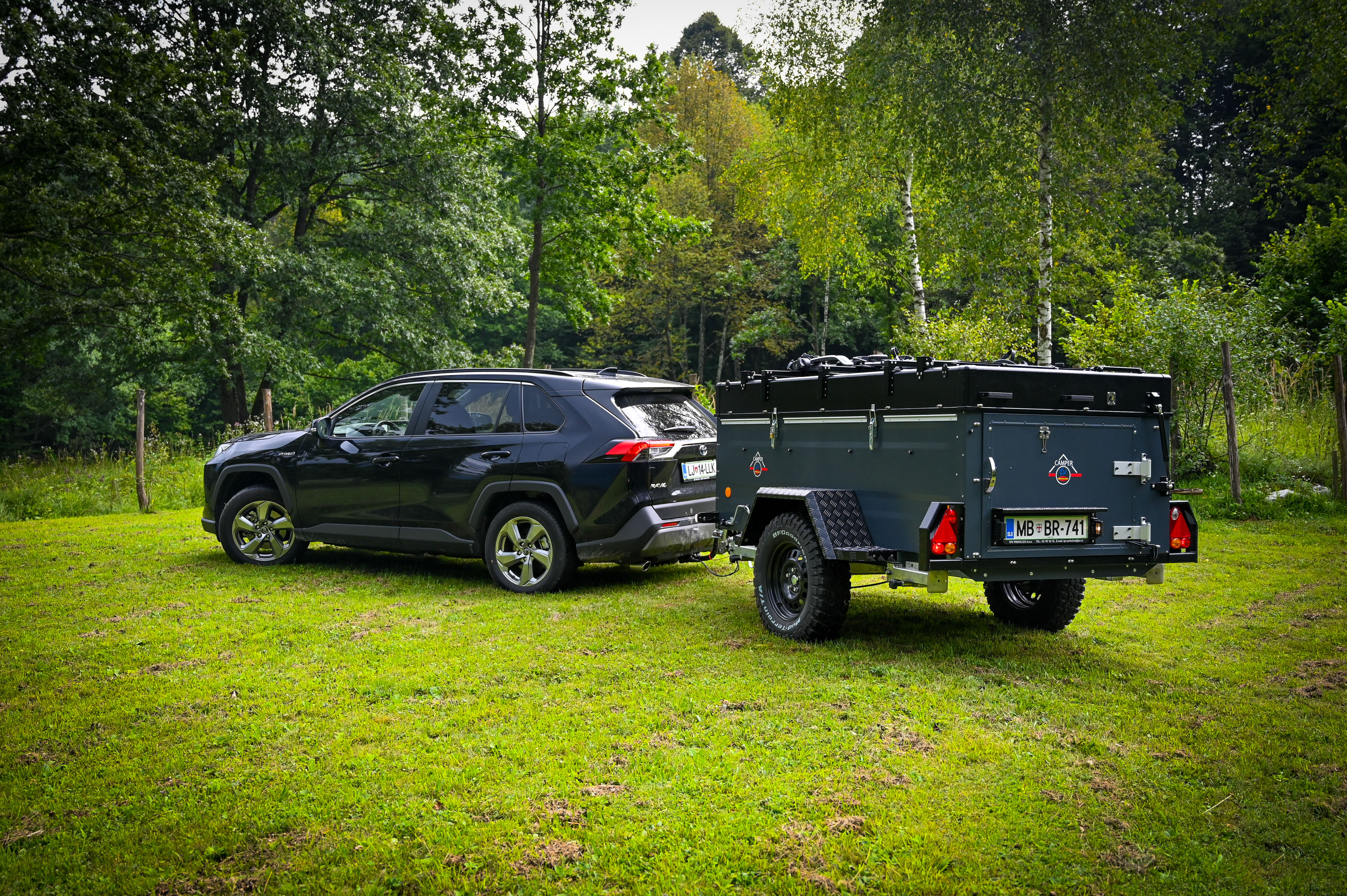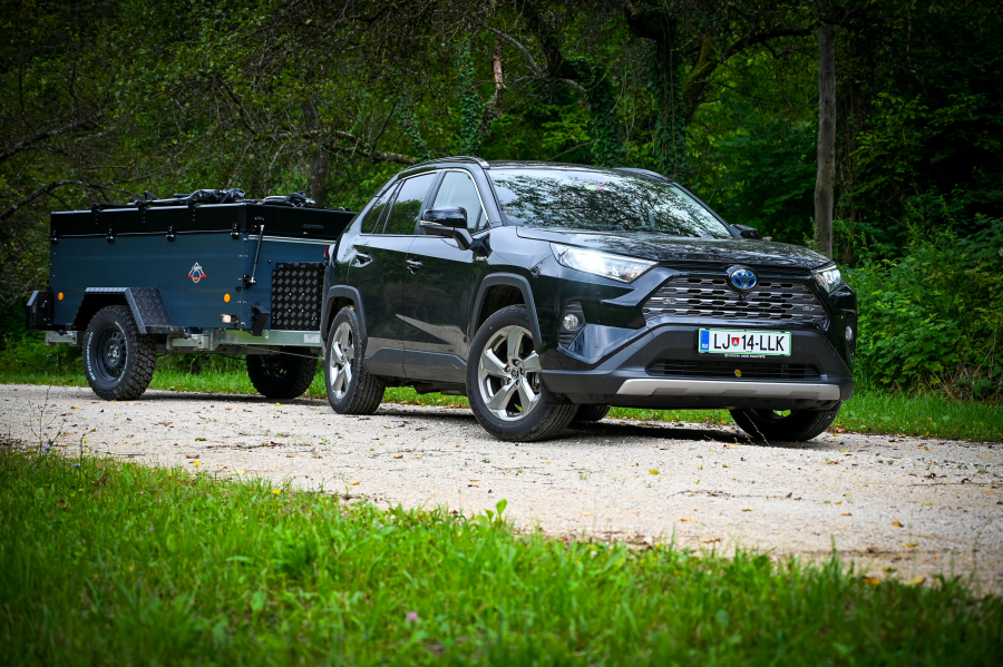 Na testnega RAV4 smo tokrat pripeli zelo zanimivo počitniško prikolico - hibrid med robustno tovorno prikolico in šotorsko prikolico. Ta praktična, kakovostna in robustno narejena prikolica je plod domačega razvoja, saj so jo zasnovali na Ptuju v podjetju TPV prikolice, kjer na leto izdelajo več kot 25.000 lahkih tovornih prikolic. 3,85 metra dolga, 1,8 metra široka in 1,54 metra visoka prikolica je opremljena z zmogljivimi terenskimi pnevmatikami dimenzije 235/70 R 16 in ima tono dovoljene osne obremenitve.