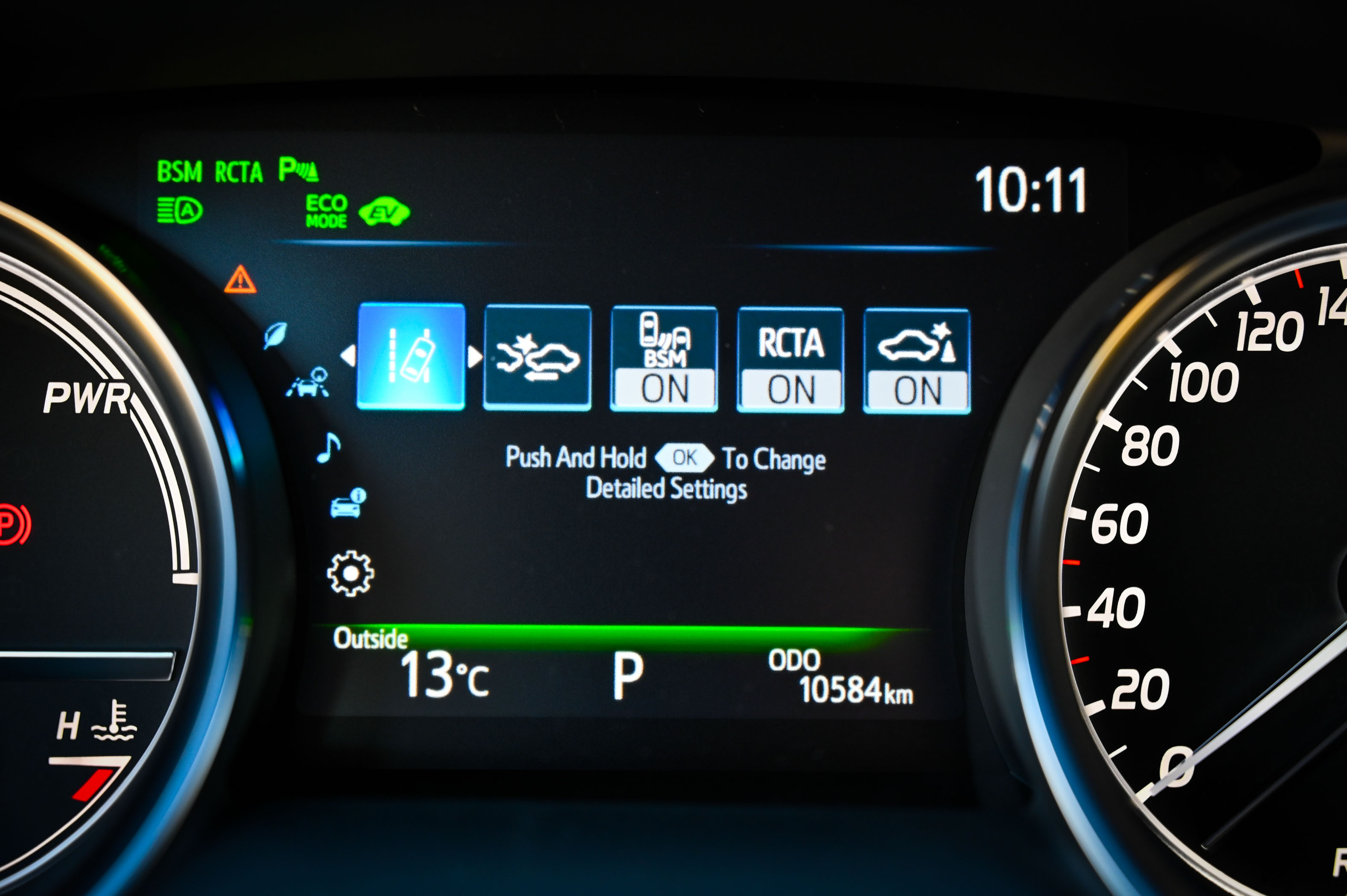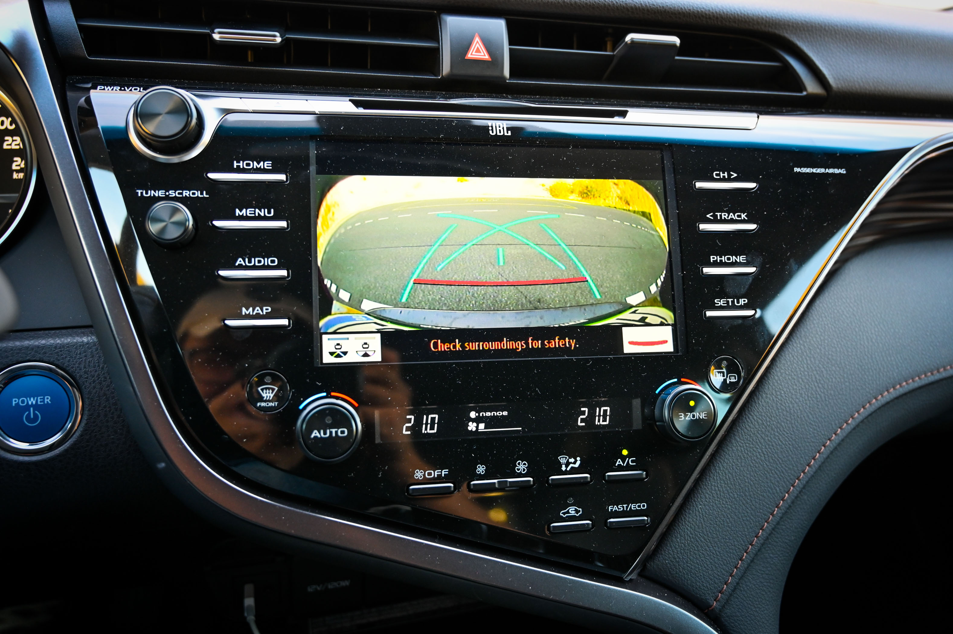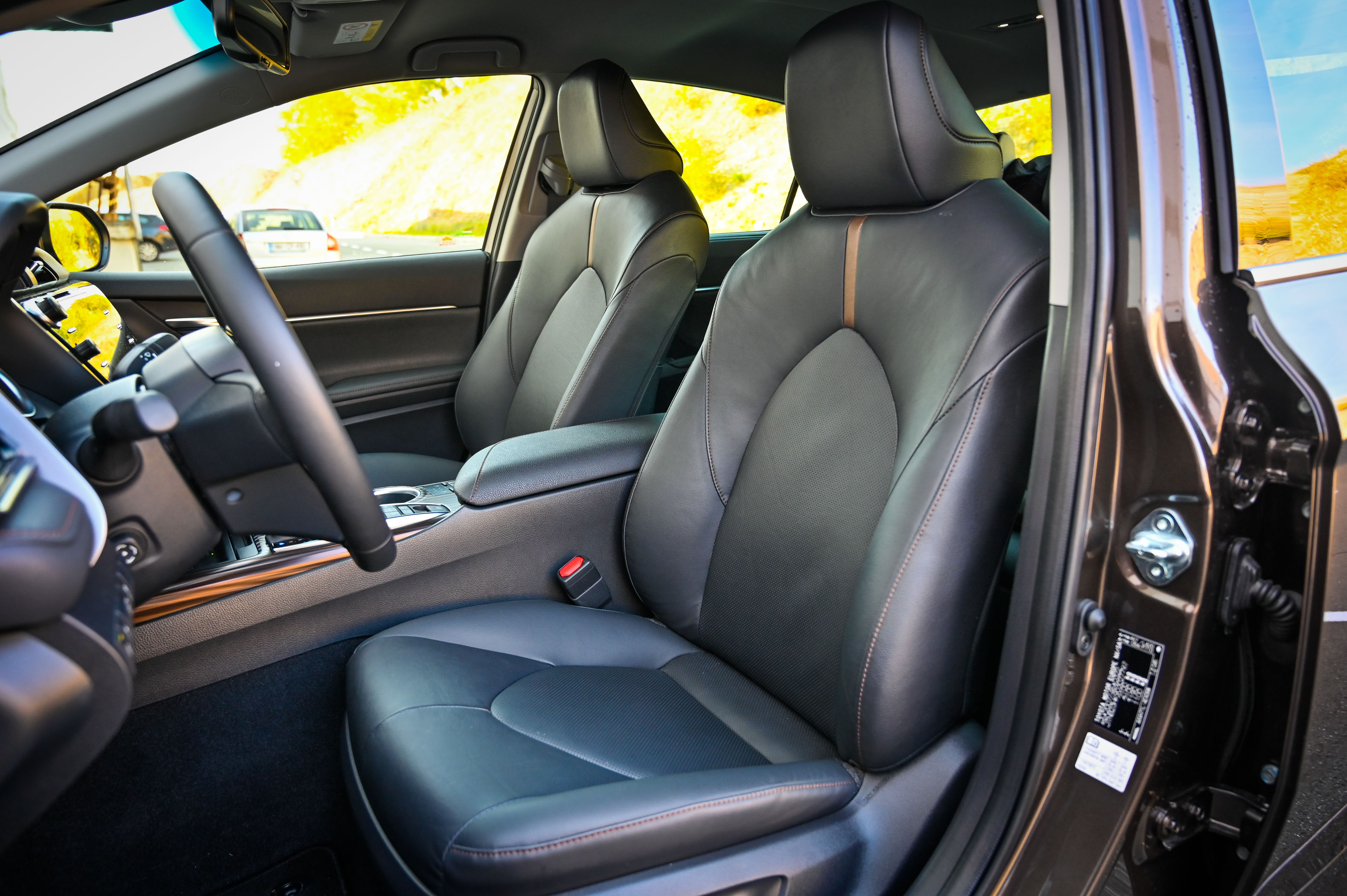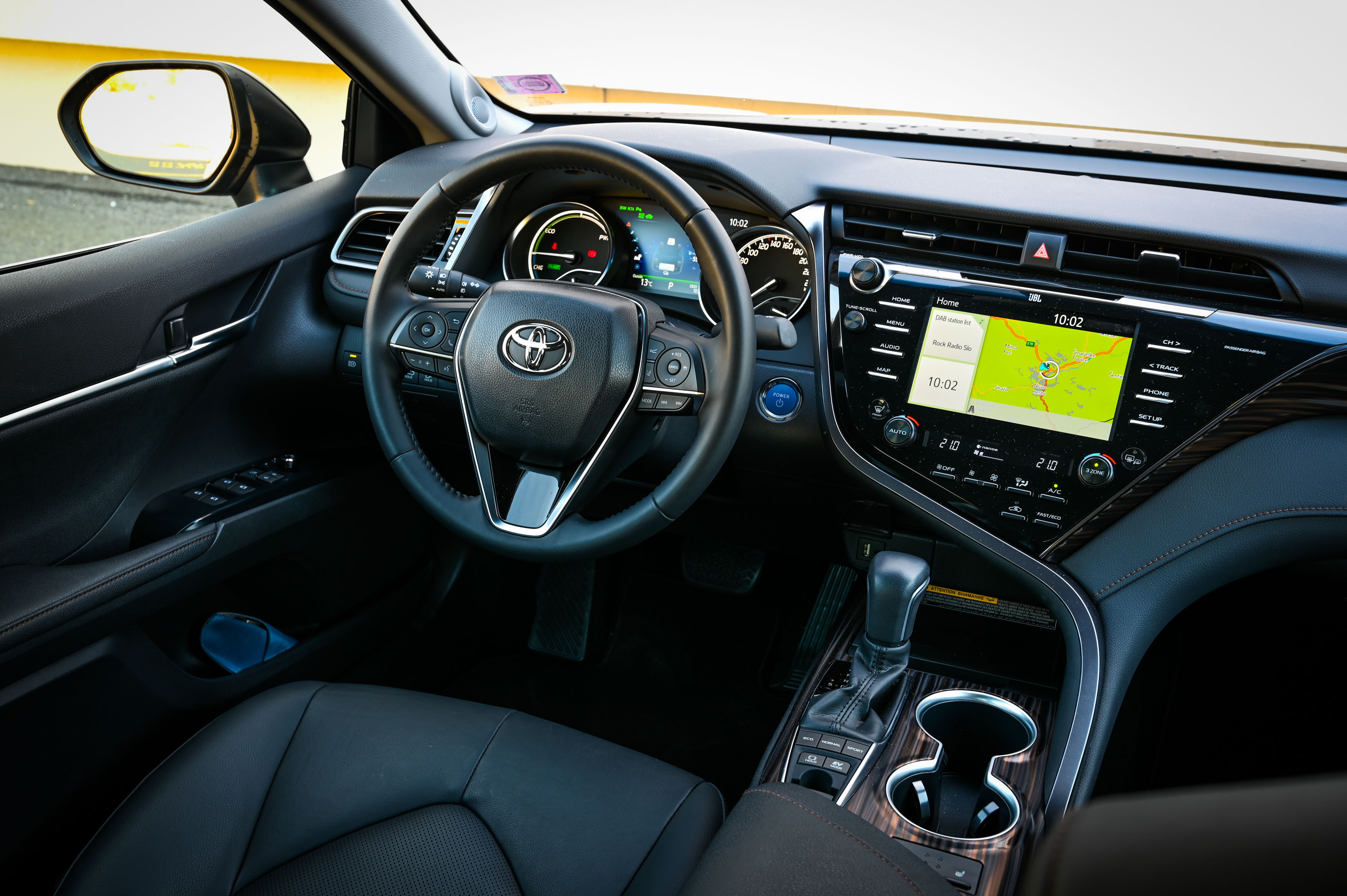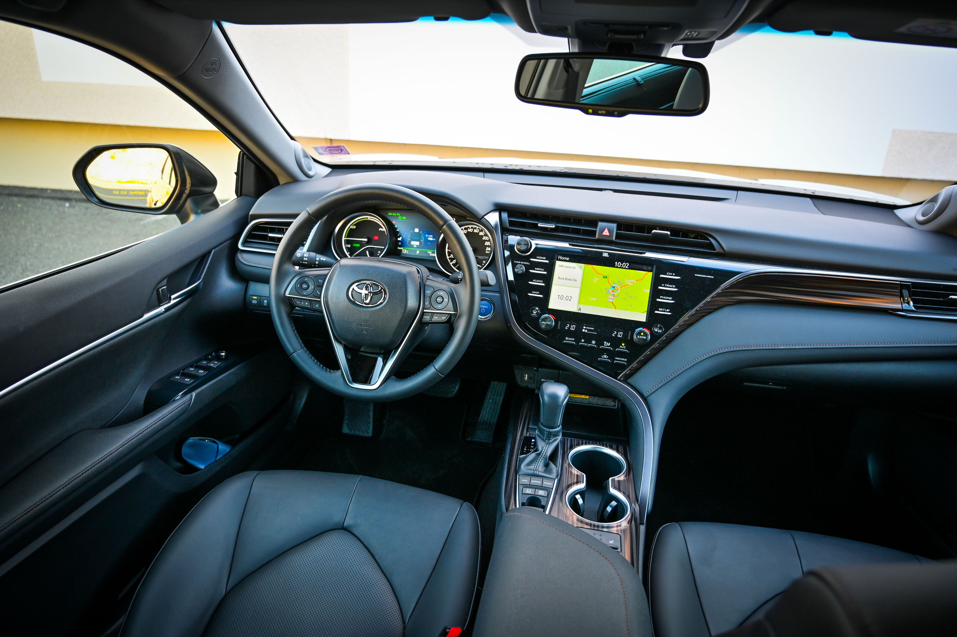 Camry z najboljšo opremo executive že z zasnovo in vgrajenimi materiali v potniški kabini (usnje na spodnjem delu armaturne plošče, usnjeno oblazinjenje sedežev, oblikovalski dodatki…) nakazuje svojo naravnanost k prestižu, a brez ekstravagantnih rešitev. Do podatkov na velikem sredinskem zaslonu se dostopa prek klasičnih gumbov, a dostop do nekaterih funkcij je kljub vsemu dokaj zapleten. Instrumentna plošča z velikima okroglima merilnikoma je dobro pregledna. Voznikova ergonomija je dobra, k osredotočenosti na vožnjo pripomore tudi projekcijski prikazovalnik (head up zaslon).