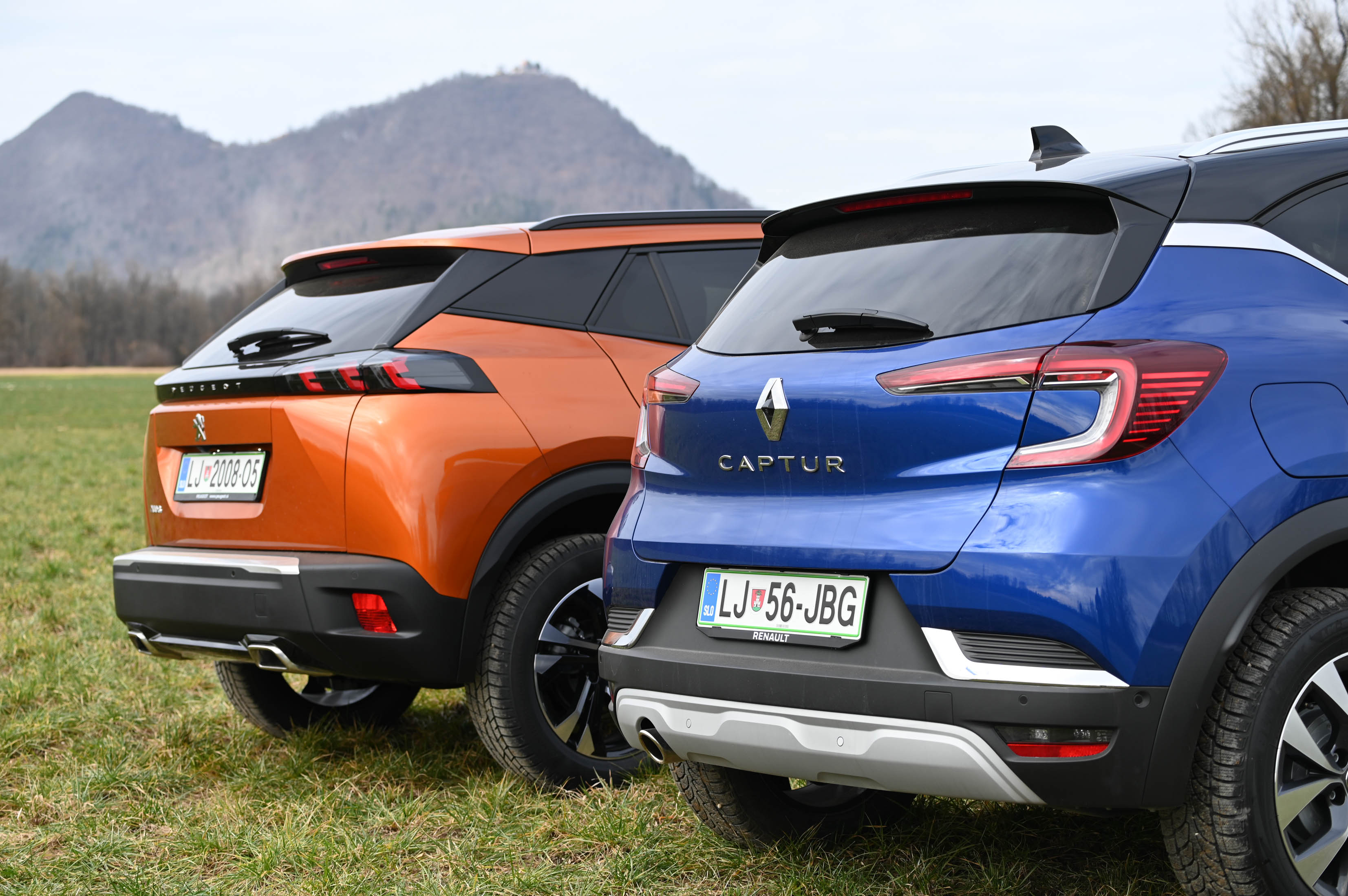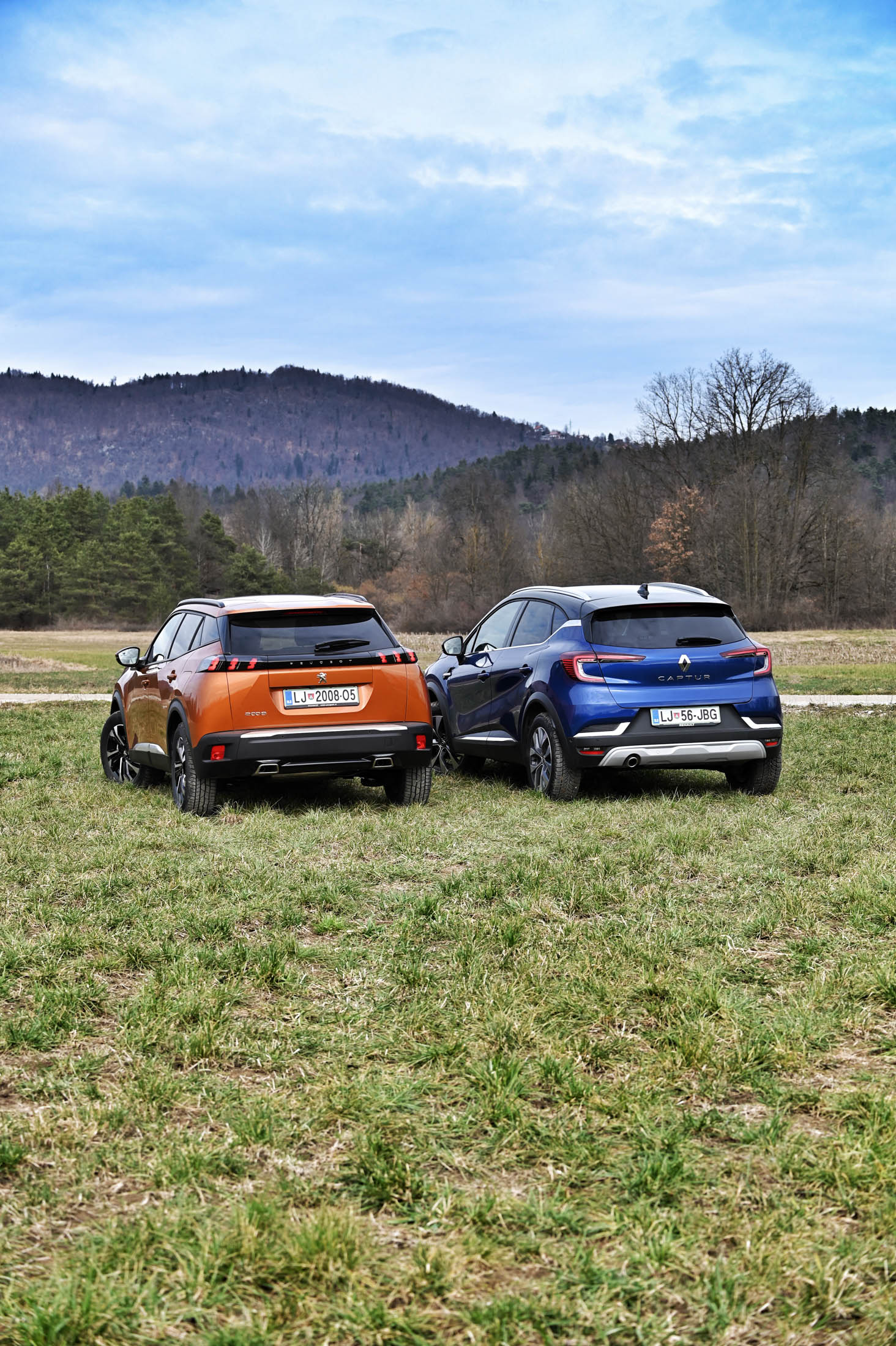 Oba sta Francoza, oba zelo sveža, oba polna podobnih obljub o čudovitih vozniških doživetjih - pa vseeno precej različna. Če zanemarimo centimetrske razlike - 2008 je na primer nekaj daljši od capturja, ima pa captur daljšo medosno razdaljo - se mnenja krešejo že pri obliki. Peugeotovi ostri robovi in robustno izklesana postava ali capturjeve zaobljene mišice in eleganca? Oba sta po svoje zelo prepoznavna, a oba na cesti od daleč lahko tudi kaj hitro zamenjamo - 2008 za 3008, capturja pa za scenica ali espaca.
