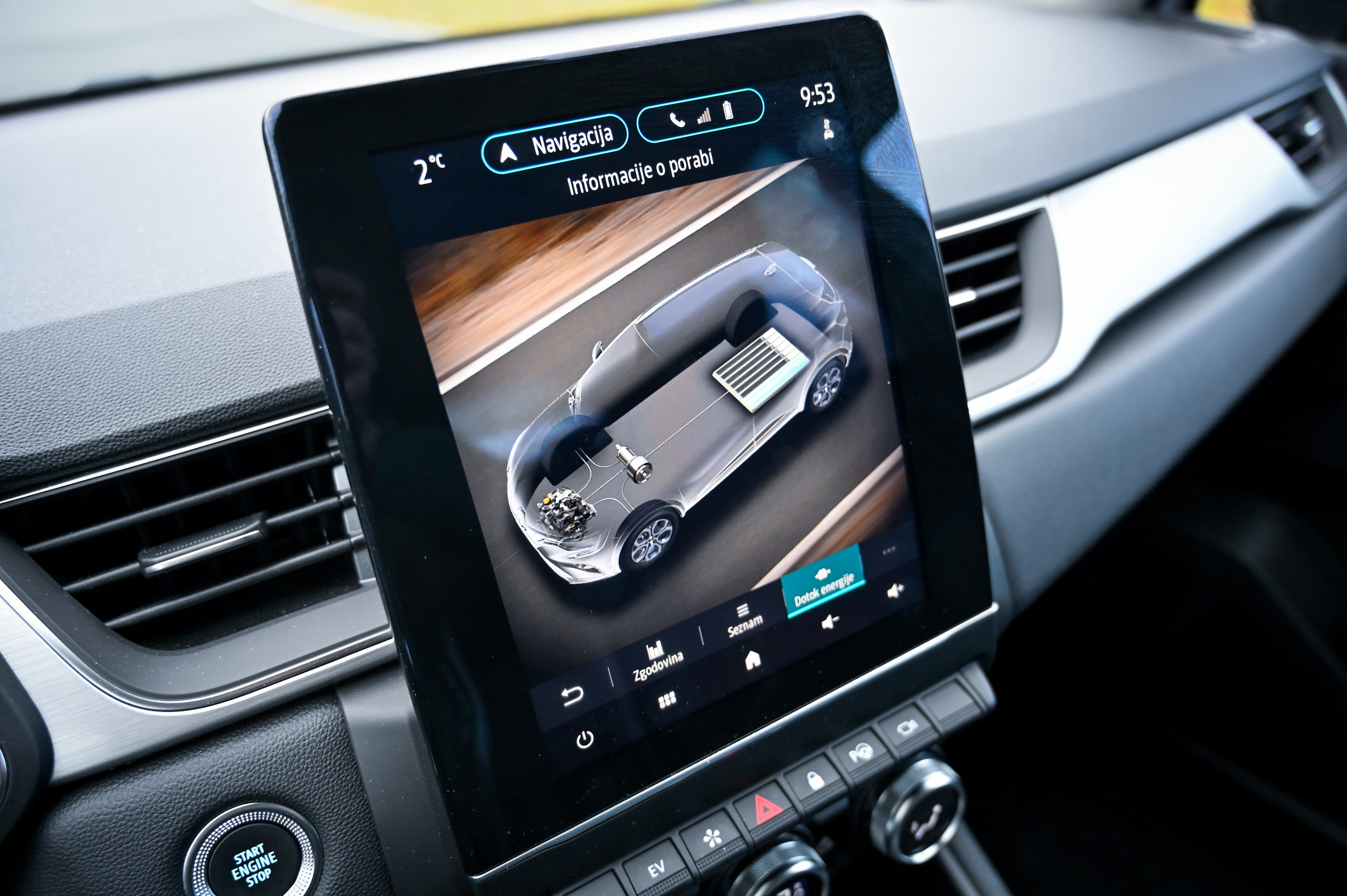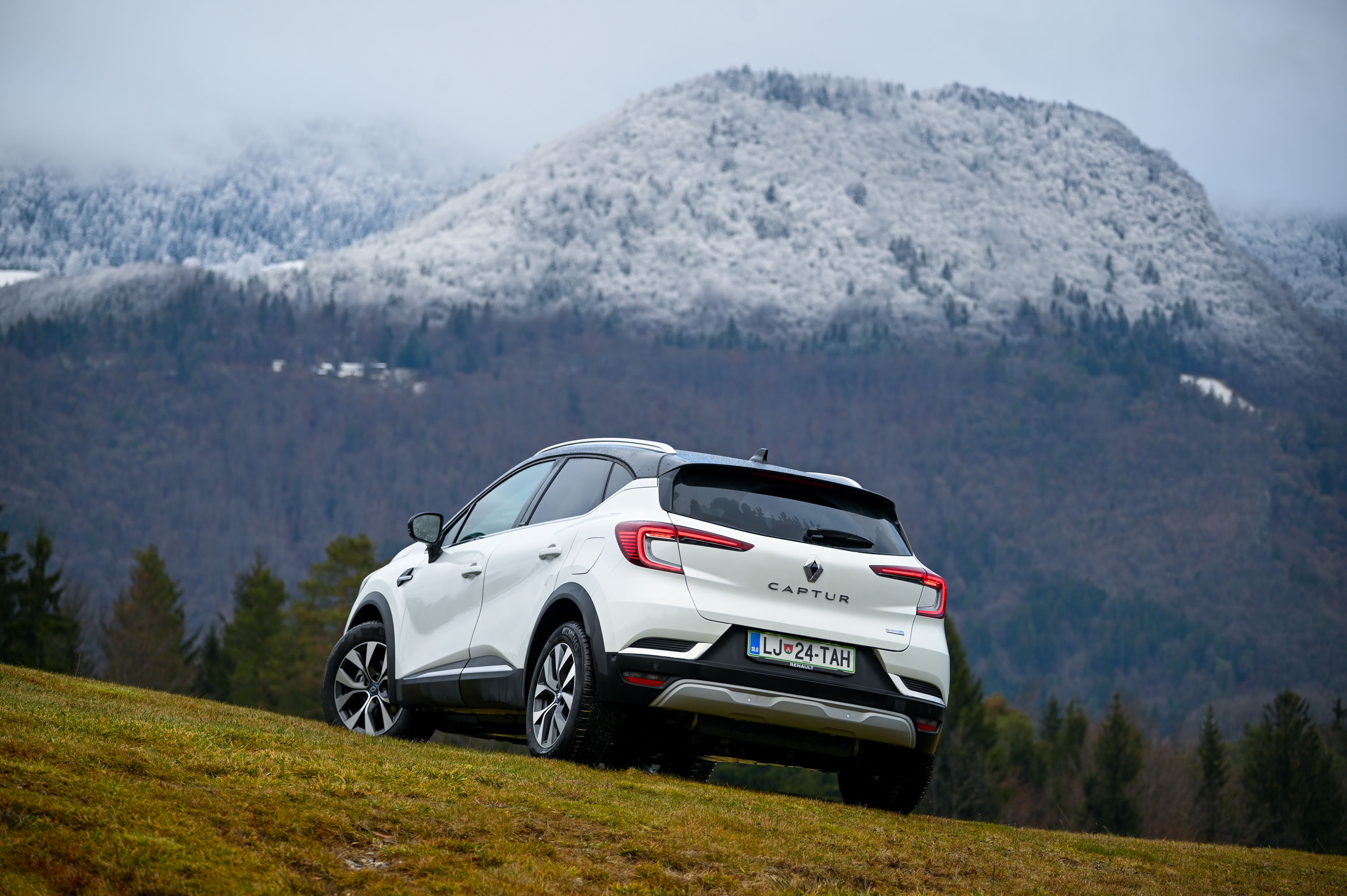 Renaultovo novo hibridno tehnologijo e-tech smo v Motoreviji podrobno že predstavili. Pogonski sklop hibridnega capturja obsega 1,6-litrski bencinski motor, dva elektromotorja - pogonskega in visokonapetostni zaganjalnik - in novi sekvenčni menjalnik brez sklopke. Da je takega capturja mogoče uporabljati tudi kot električni avto, so mu dodali polnilni kabel in pod pomično zadnjo klop namestili še 105-kilogramsko litij-ionsko električno shrambo zmogljivosti 9,8 kWh. Na pogled hibridni captur ni prav nič drugačen. Da se zna peljati na tudi na elektriko, dajo vedeti dodatne oznake e-tech, ki so nameščene na različne karoserijske dele. Da električno energijo z največjo močjo 3,6 kW “črpa” tudi iz omrežja, pa razkrivajo dodatna vratca nad desnim kolesom zadaj, ki pokrivajo električni vtikač. Na običajni električni vtičnici bo energijska shramba ponovno polna v dobrih štirih urah.