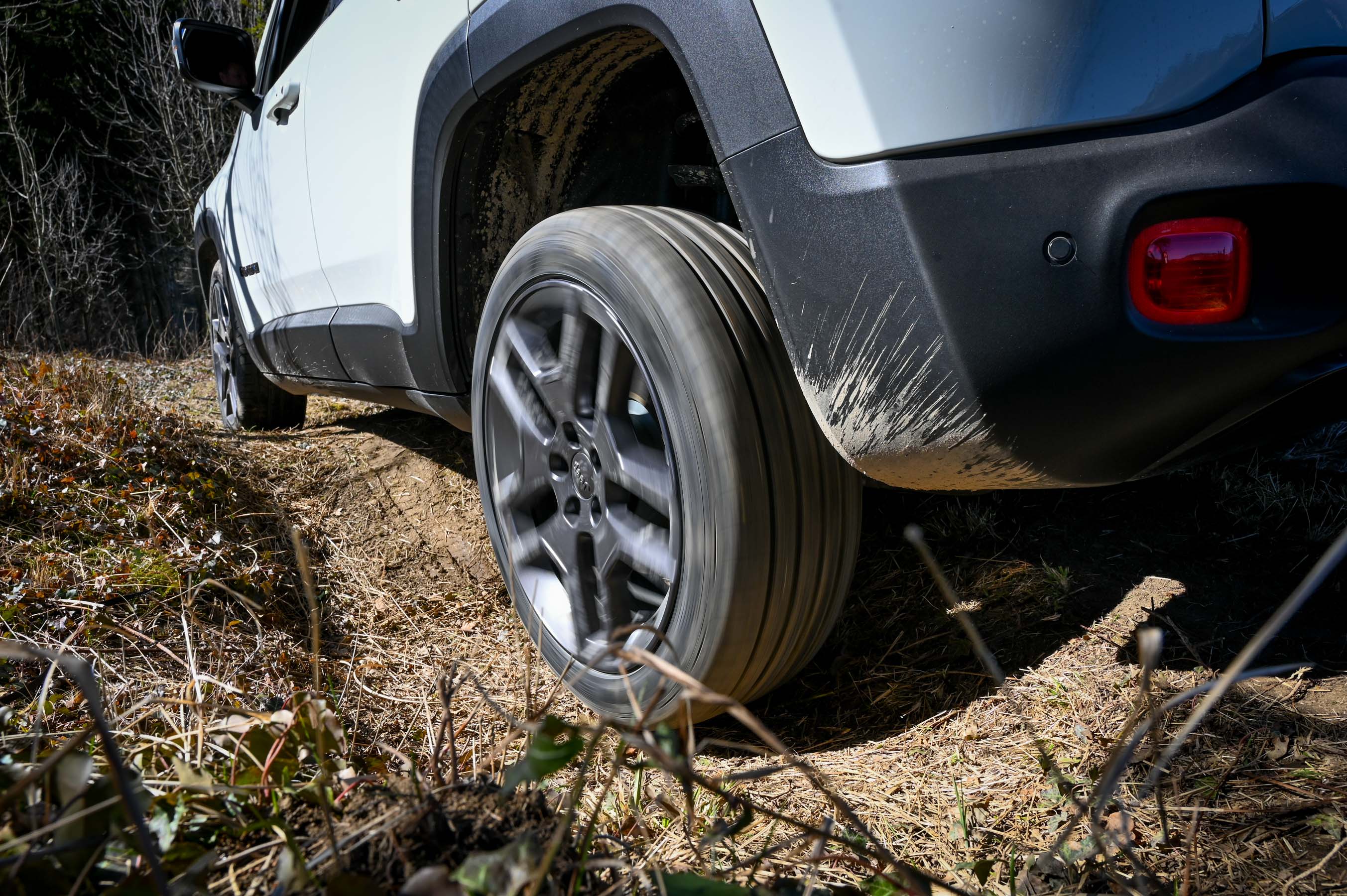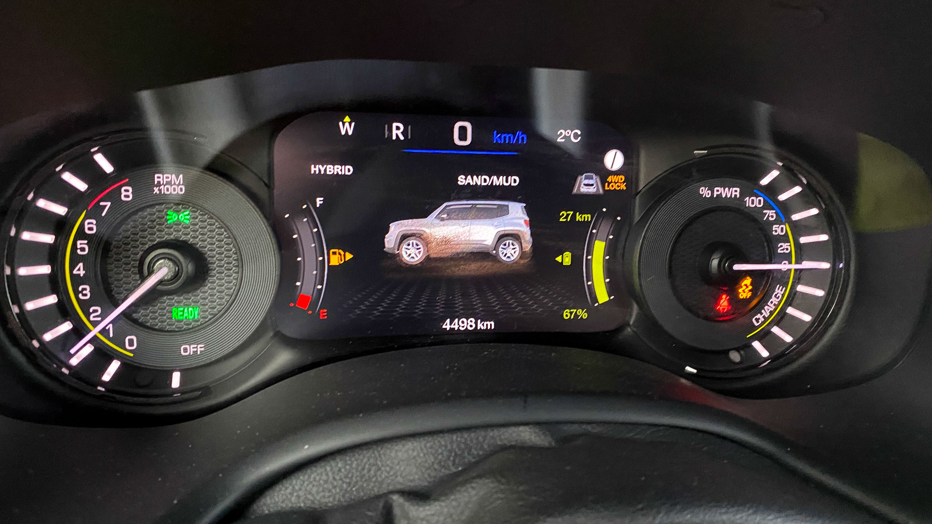 Jeepova kompaktna cestna terenca renegade in compass sta z oznako 4xe prva priključna hibrida, ki se v bitko za oprijem podajata z električnim štirikolesnim pogonom brez mehanske povezave med kolesnima paroma. To seveda ni revolucija, smo pa prvič sedli v priključni hibrid, ki ima poleg različnih voznih načinov pretoka energije tudi reducirano prestavno razmerje, terenske vozne programe in zaklep razmerja (50 : 50) deleža navora med kolesnima paroma. Jeep je torej tudi pri elektrificiranem pogonu ostal zvest svoji tradiciji in ohranil sistem select terrain, ki omogoča izbiro različnih voznih programov za različne podlage.