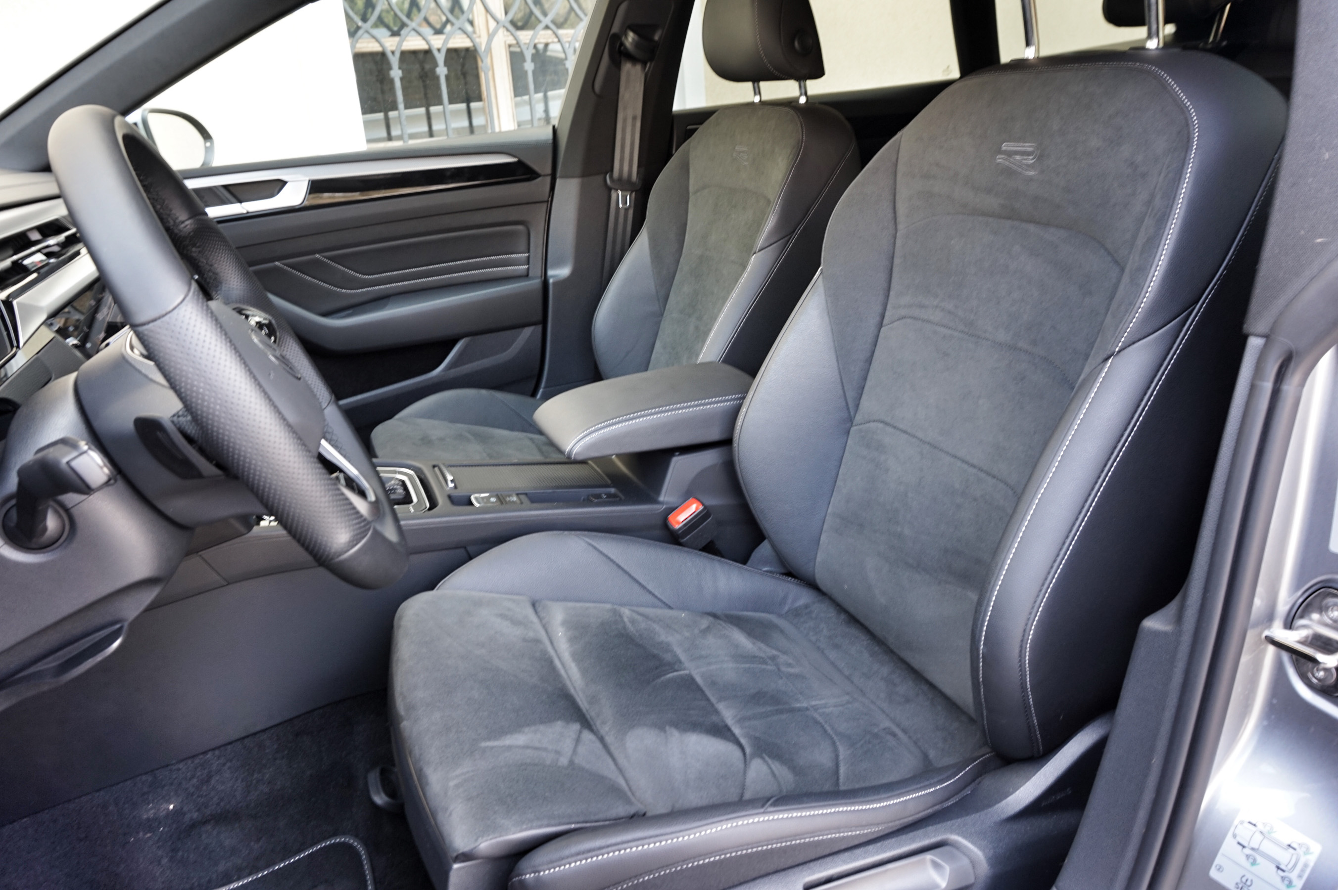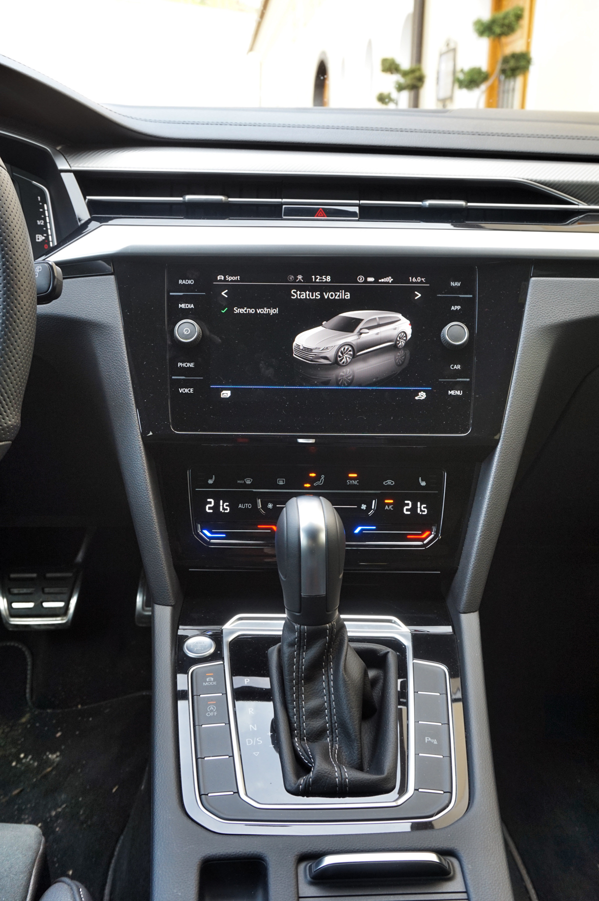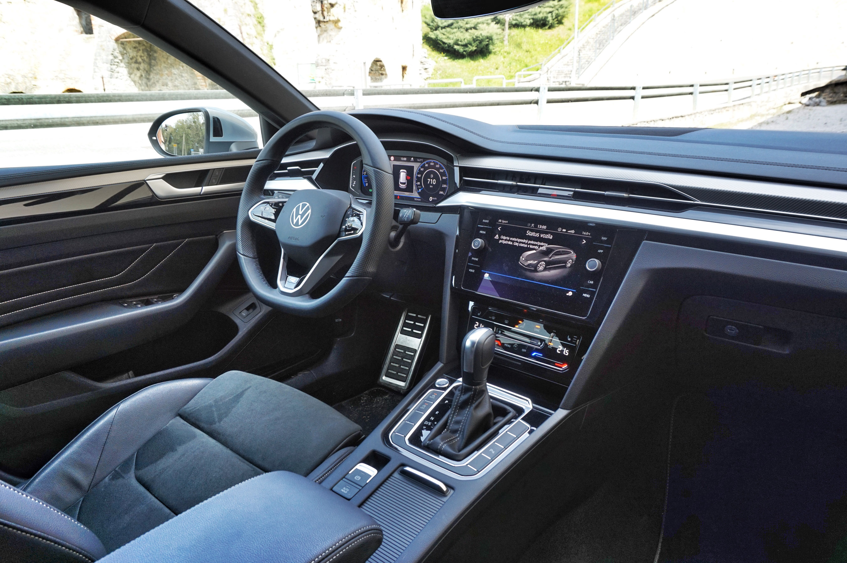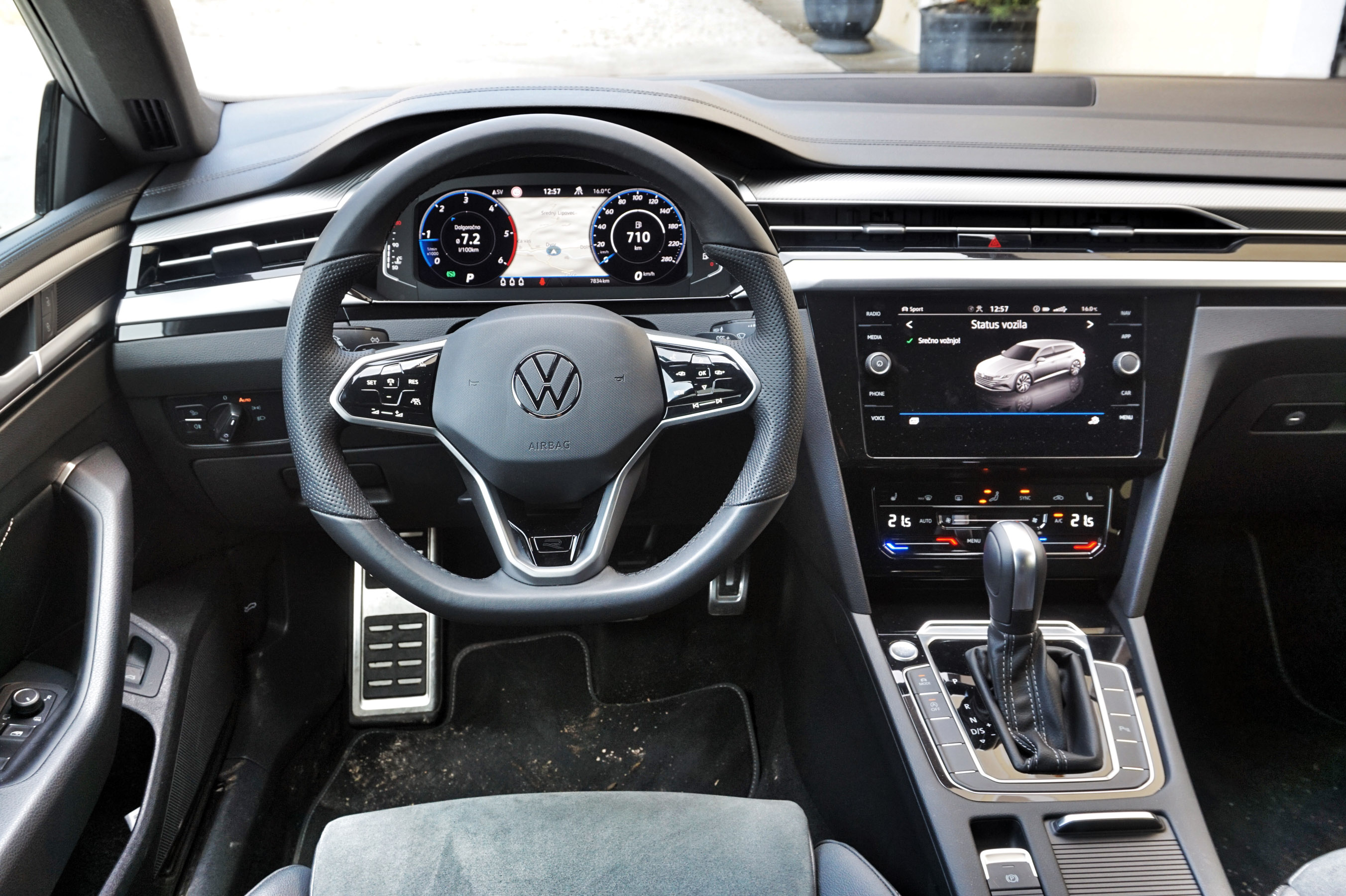 Arteon je tehnično gledano imenitnejša različica passata, zato ne čudi, da si s passatom delita velik del voznikovega okolja. Za poznavalce to pomeni domačnost in dobro ergonomijo; odlična prednja sedeža ponujata udobno in stabilno sedenje, armaturna plošča pa digitalne merilnike, velik sredinski zaslon multimedijske naprave in klasično ročico avtomatiziranega menjalnika. Ob nedavni prenovi so vsi arteoni dobili nov volanski obroč s kapacitivnimi drsniki namesto gumbov, gumbi pa so izginili tudi iz sredinske konzole. Tudi klimatsko napravo namreč zdaj upravljamo z dotiki in potegi prstov po drsnih površinah, kar je morda videti trendovsko, a je po našem mnenju manj uporabno od nekdanjih okroglih gumbov in stikal.