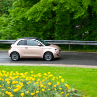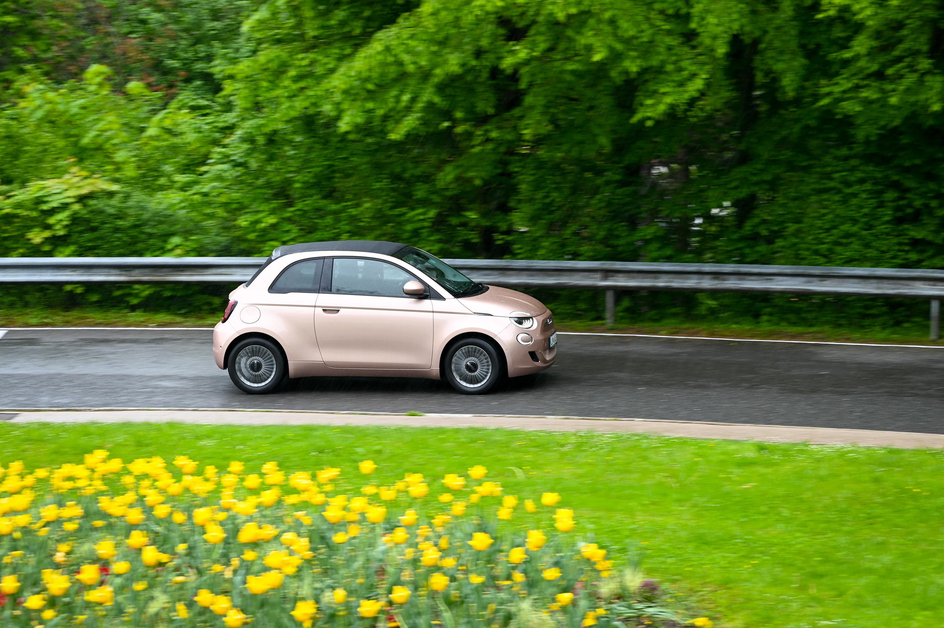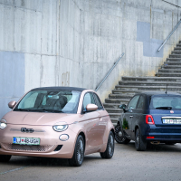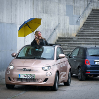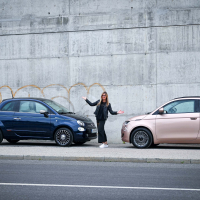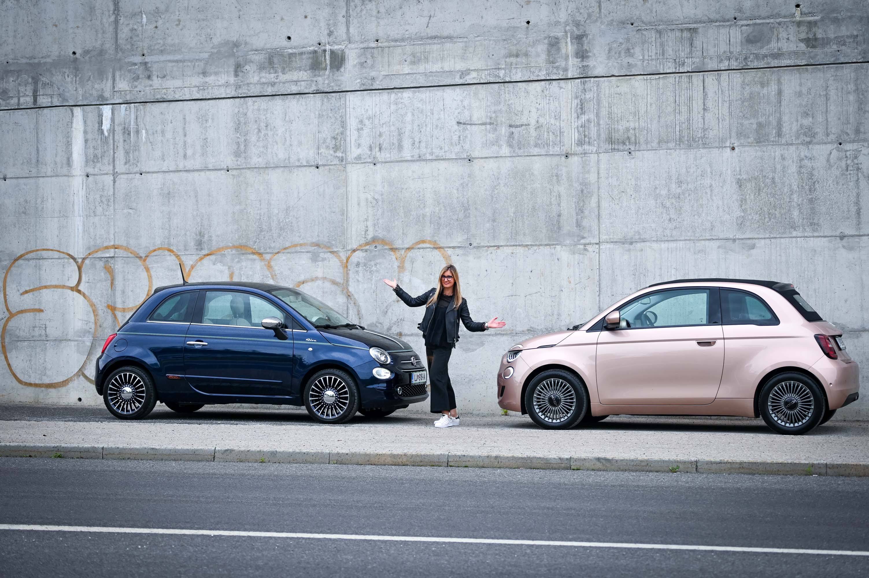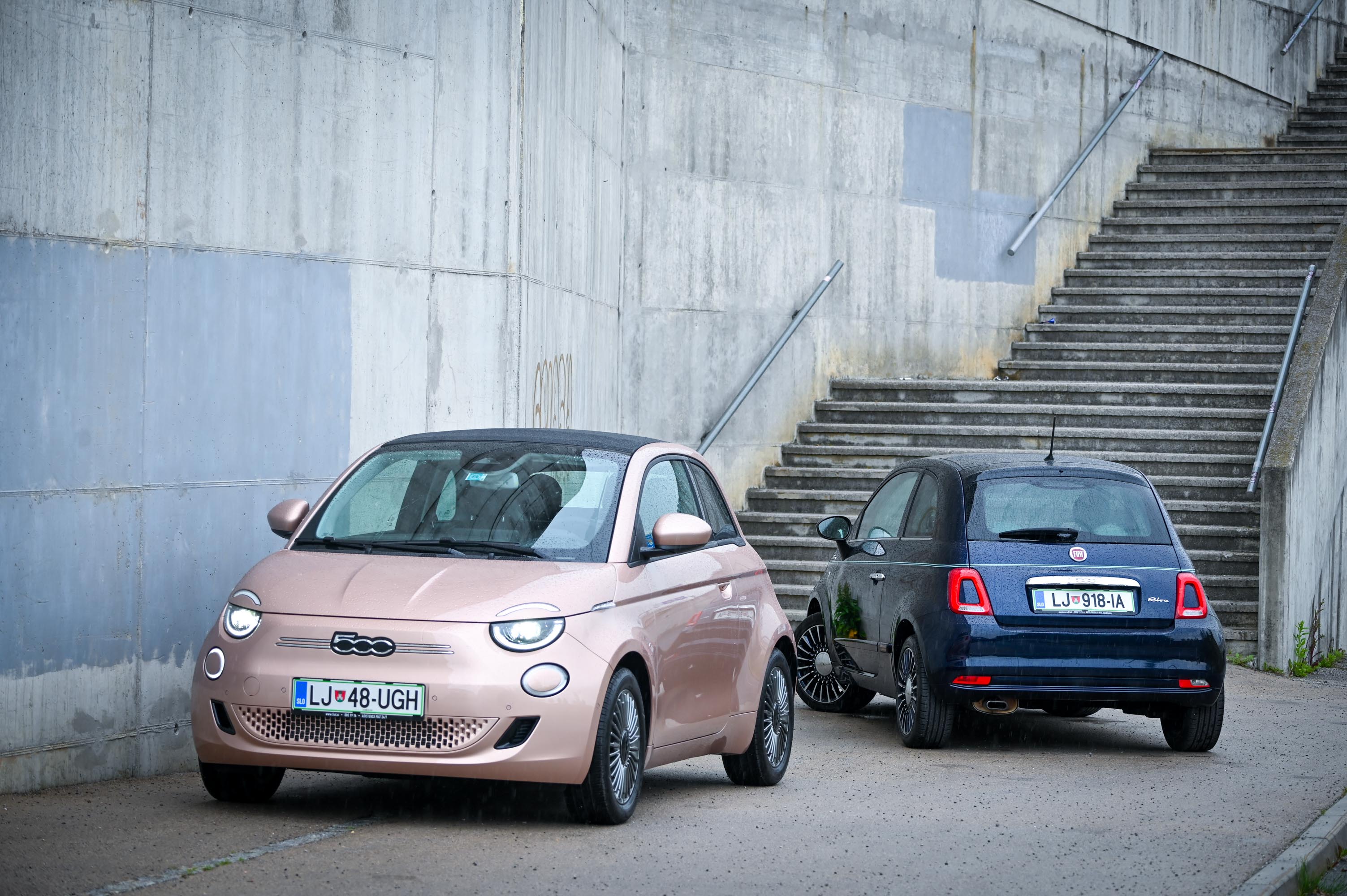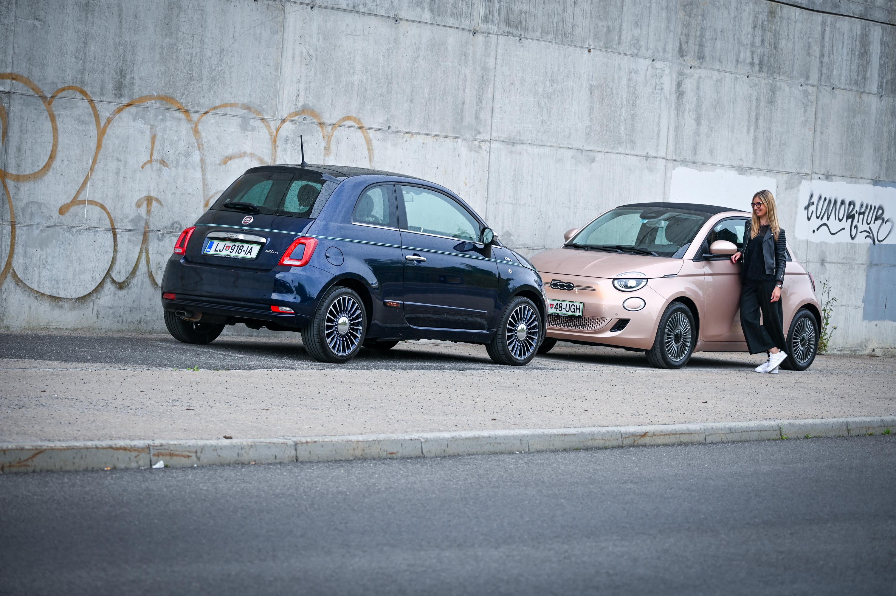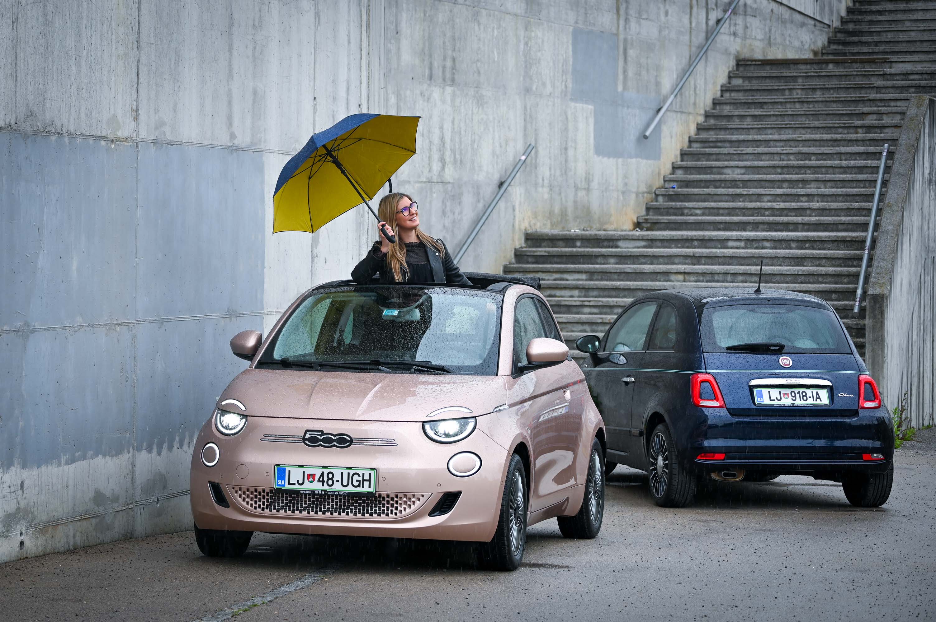 Špela si z zanimanjem ogleda električnega novinca, takoj opazi lična stikala za odpiranje vrat. Ko oba avtomobila postavimo skupaj, njena zgledno zloščena modra riva letnika 2017 ni videti prav nič zastarelo. Najprej se dotaknemo naše prej opisane zadrege. Je tako pobarvan kabriolet v resnici bolj ženski avto, vprašamo damo: “Mislim, da obstajajo bolj moški in bolj ženski avtomobili. Svojega fiata 500 riva bi uvrstila nekam vmes. Ne zdi se mi povsem tipično ženski avto, morda tudi zato, ker je moj partner nad njim izjemno navdušen in se odlično počuti, ko ga vozi. Če pa pogledam tega električnega, s platneno streho in odetega v sijočo zlato-roza kovinsko barvo, ga vidim kot izrazito ženski avto. Moram sicer priznati, da ta odtenek meni ni najbolj blizu in si avtomobila v taki barvi ne bi kupila.”