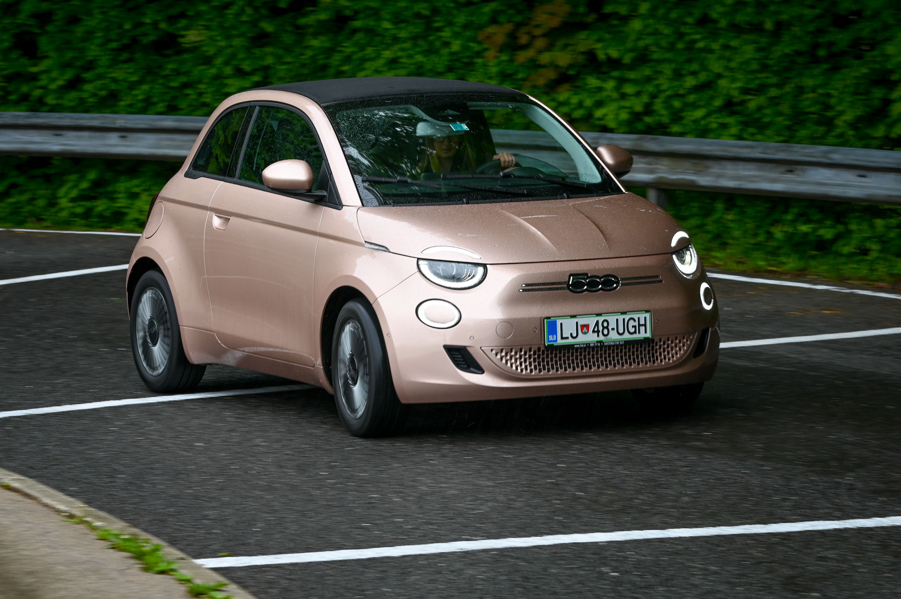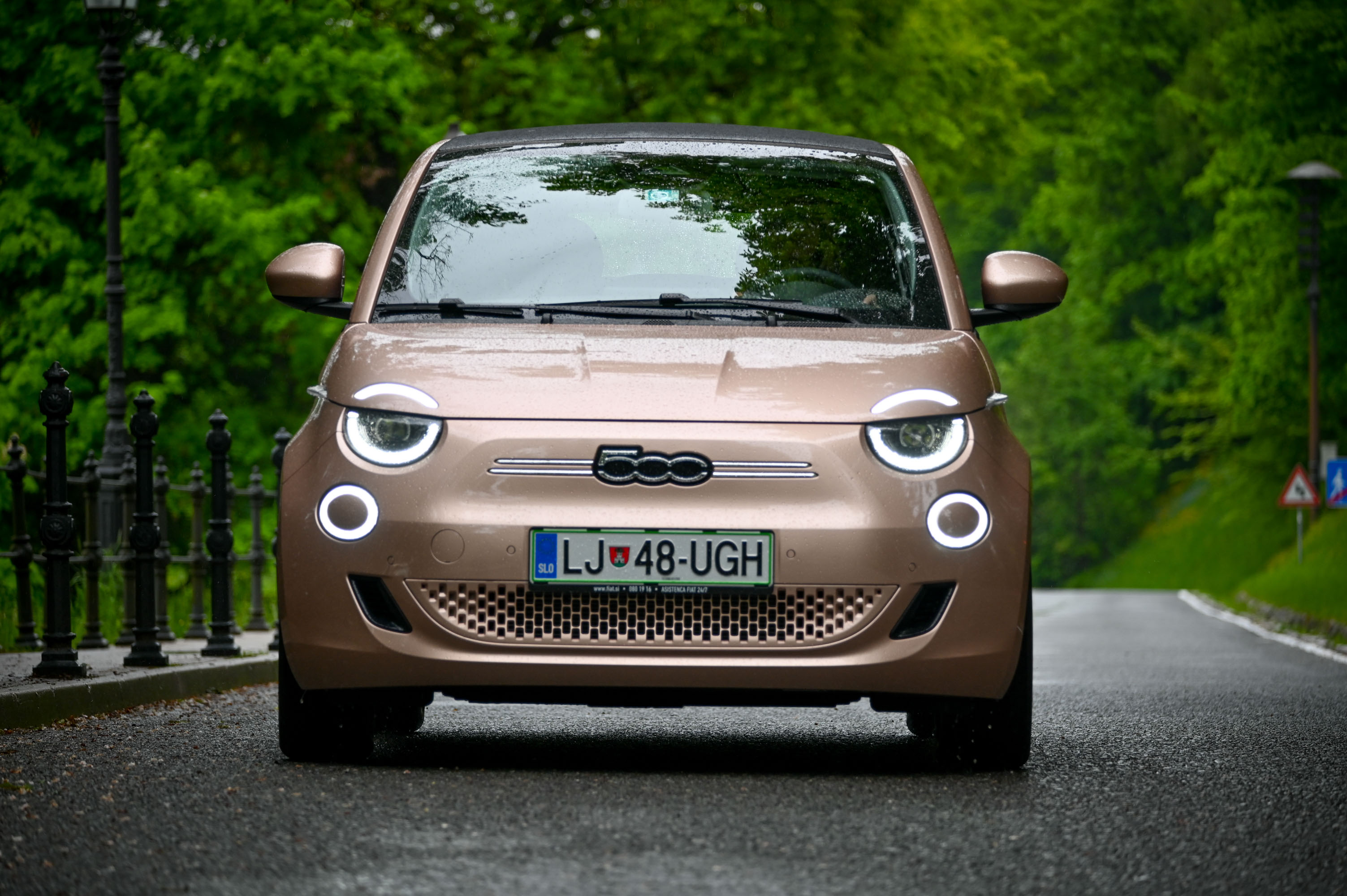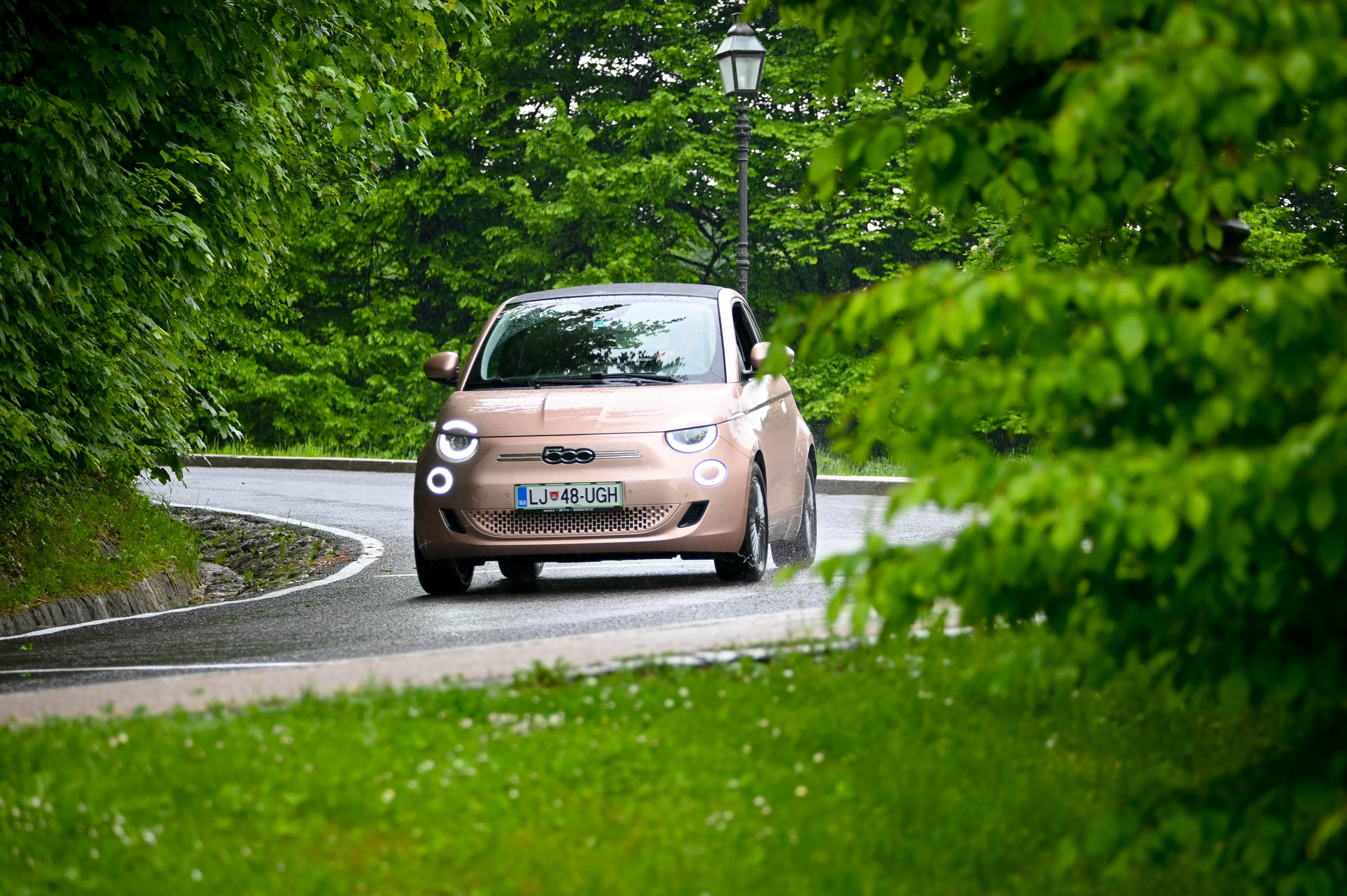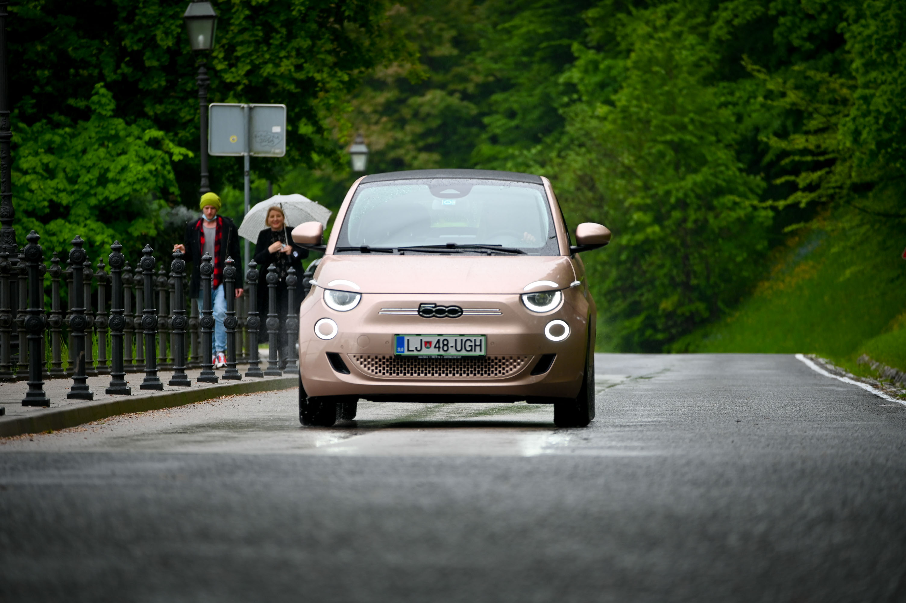 Tisti dan vreme res ni obetalo veliko, a simpatična pojava fiata 500, odetega v precej nenavadno barvo, ki jo v Torinu uradno imenujejo rose gold oziroma zlato-rožnata, je v klavrni sivini deževnega jutra dodala nekaj zagona. Barva, ki bi po naši nestrokovni kozmetični oceni lahko bila tudi na barvnih kartah lakov za nohte in šmink, je ob našemu moškem pogledu na svet zbudila malce zadrege: kako nas bodo mimoidoči razumeli za volanom tega posebneža? Tudi zato smo tokrat na kilometre doživetja povabili ljubiteljico fiata 500, našo sodelavko iz marketinga AMZS, ki pozna modne, digitalne in avtomobilske trende. Špela Žužek je lastnica fiata 500 riva, zato nas je zanimalo, kakšen vtis bo na njo naredil njegov najmlajši brat s platneno streho in električnim pogonom, ki ga do največje v mestu dovoljene hitrosti (50 km/h) v tišini požene v pičle 3,1 sekunde.