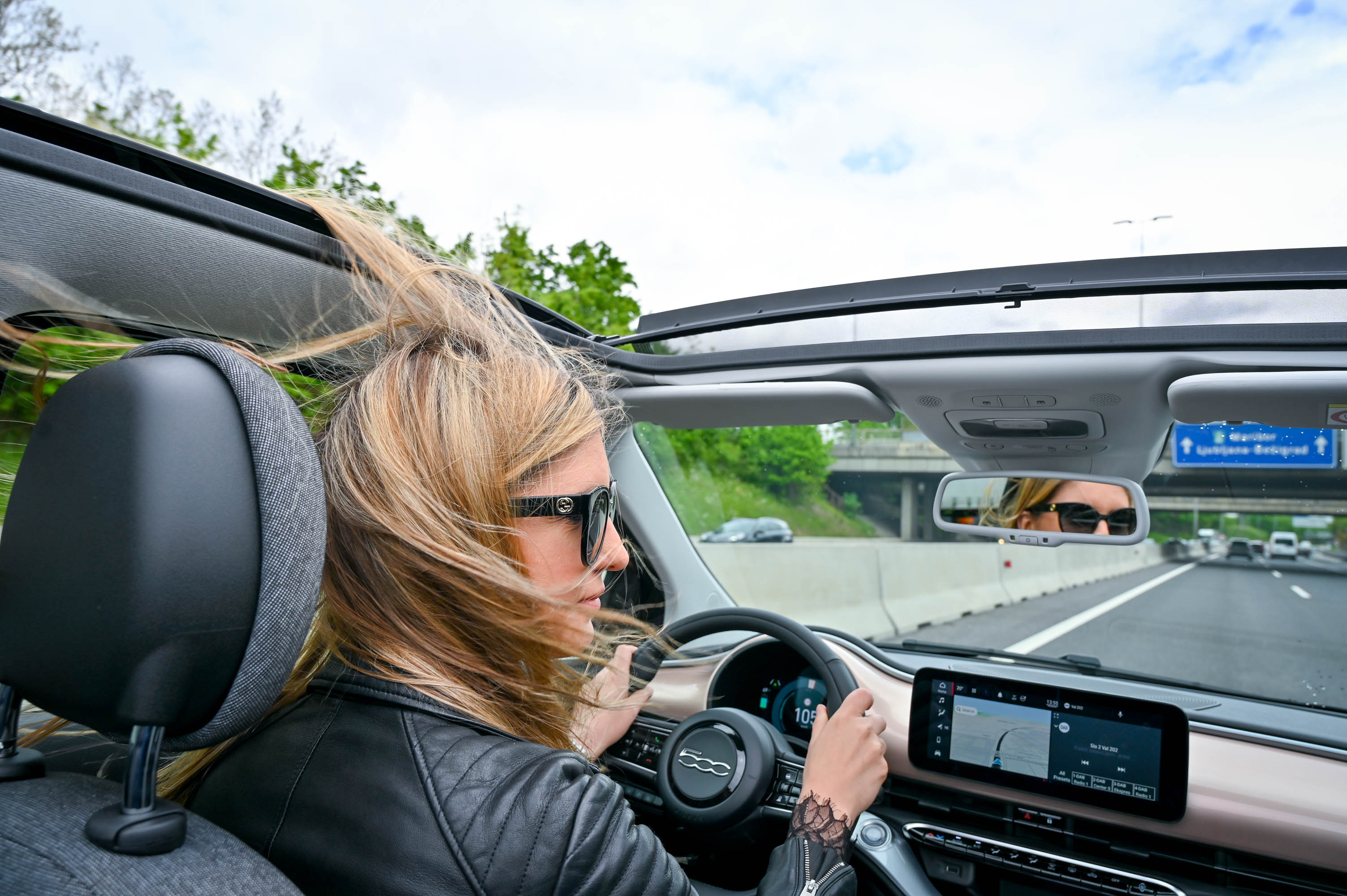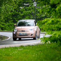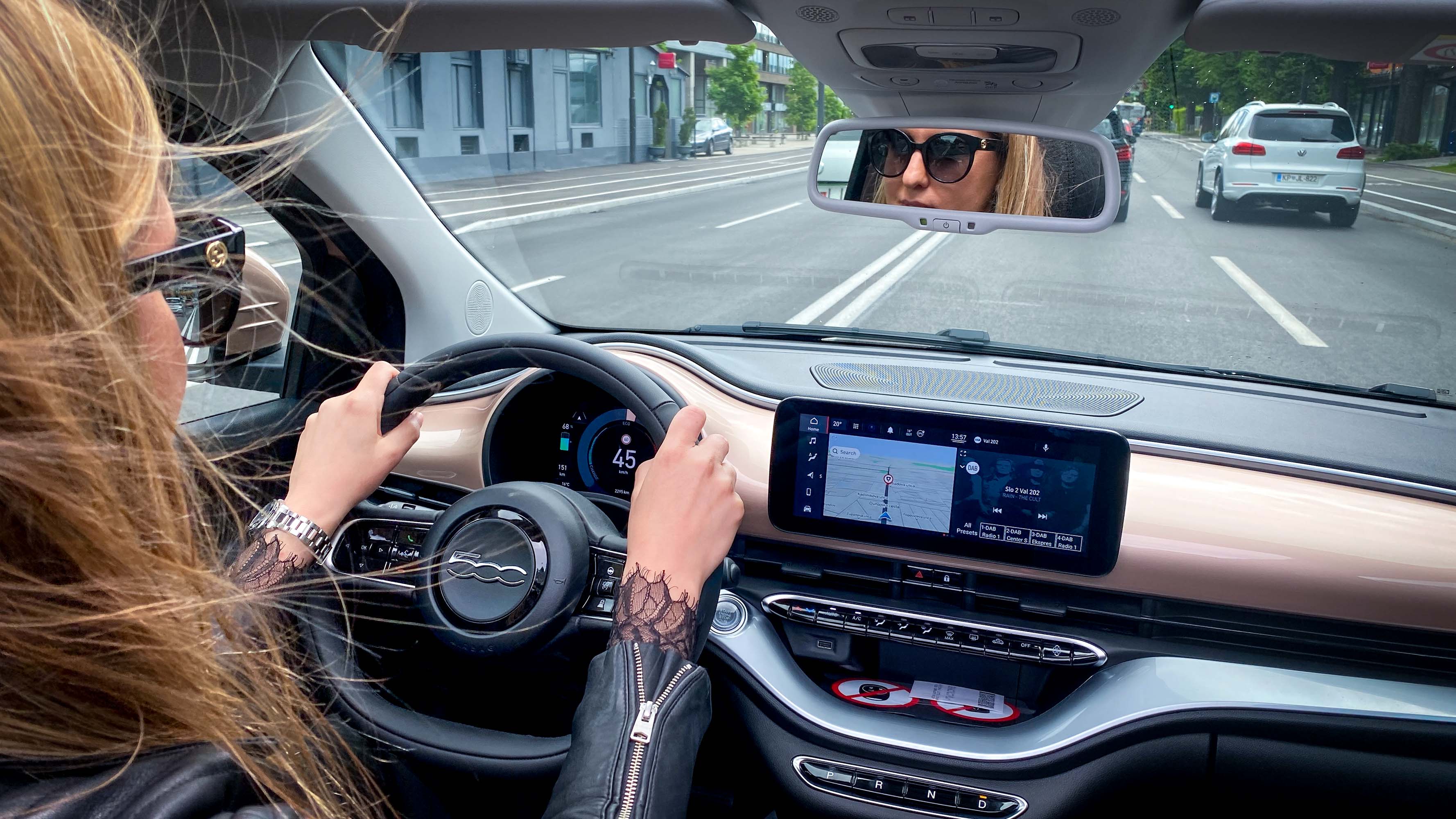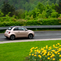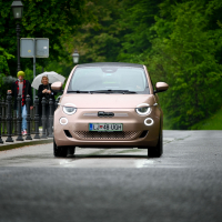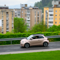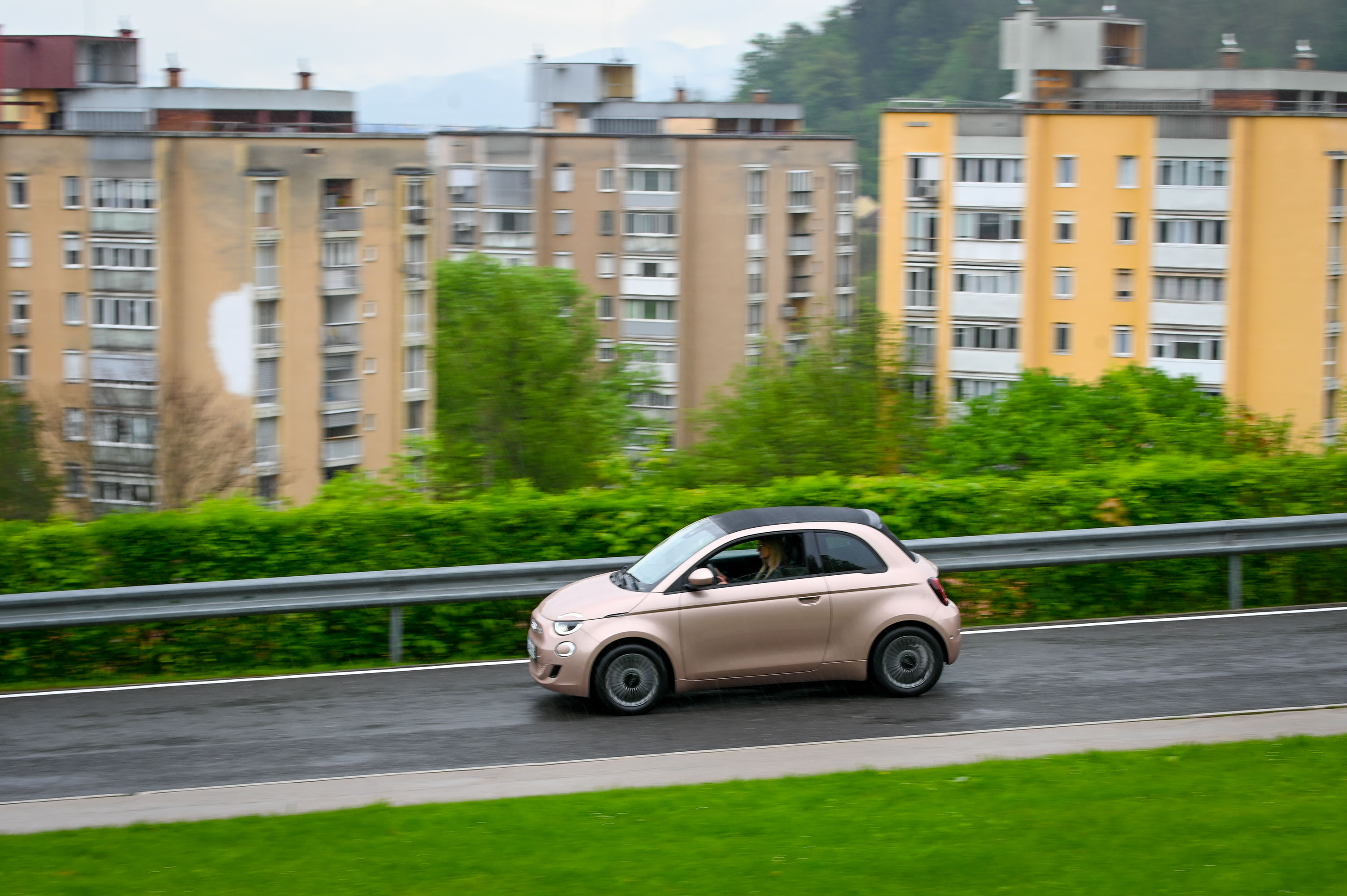 Tisti dan vreme res ni obetalo veliko, a simpatična pojava fiata 500, odetega v precej nenavadno barvo, ki jo v Torinu uradno imenujejo rose gold oziroma zlato-rožnata, je v klavrni sivini deževnega jutra dodala nekaj zagona. Barva, ki bi po naši nestrokovni kozmetični oceni lahko bila tudi na barvnih kartah lakov za nohte in šmink, je ob našemu moškem pogledu na svet zbudila malce zadrege: kako nas bodo mimoidoči razumeli za volanom tega posebneža? Tudi zato smo tokrat na kilometre doživetja povabili ljubiteljico fiata 500, našo sodelavko iz marketinga AMZS, ki pozna modne, digitalne in avtomobilske trende. Špela Žužek je lastnica fiata 500 riva, zato nas je zanimalo, kakšen vtis bo na njo naredil njegov najmlajši brat s platneno streho in električnim pogonom, ki ga do največje v mestu dovoljene hitrosti (50 km/h) v tišini požene v pičle 3,1 sekunde.