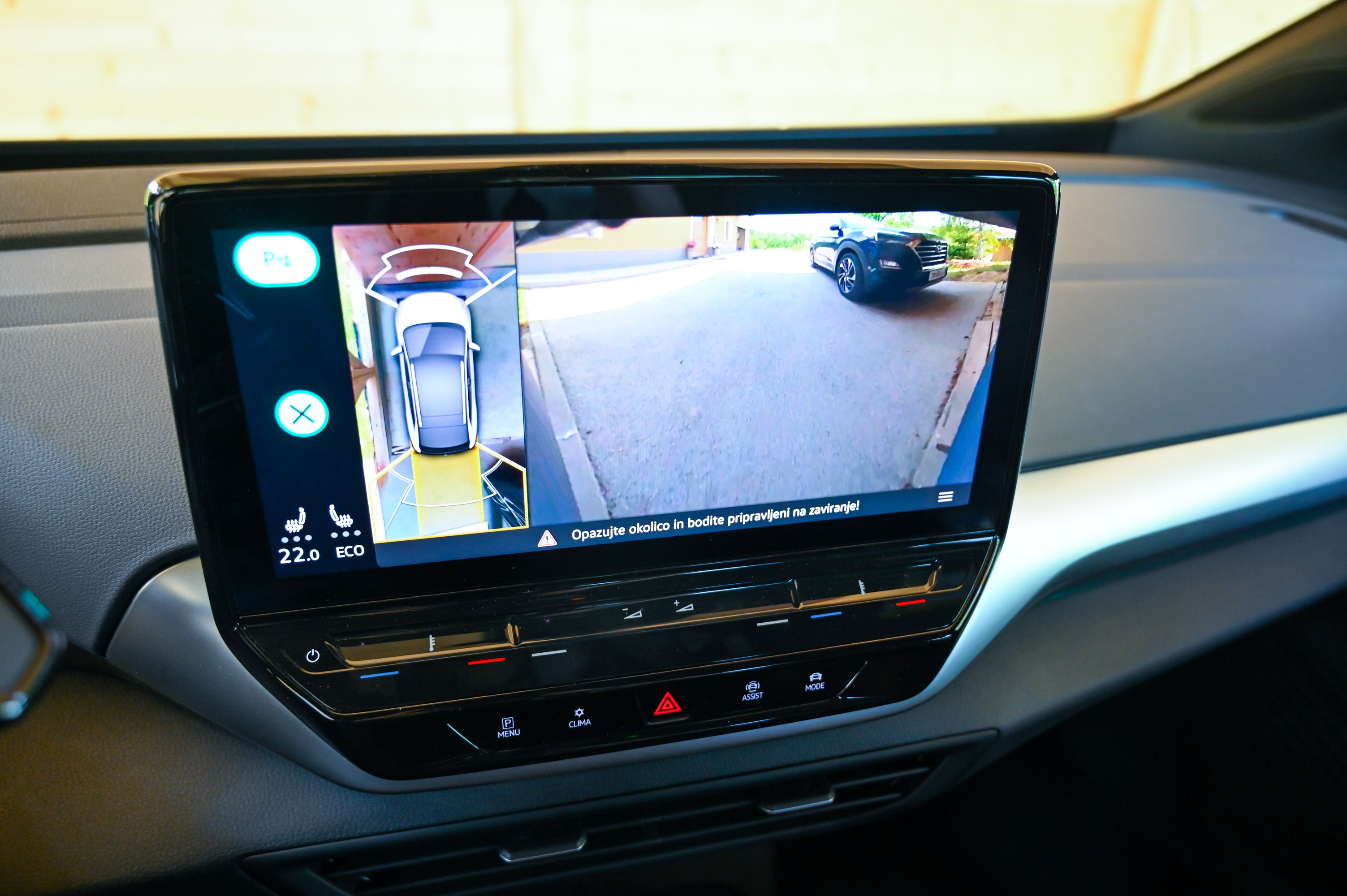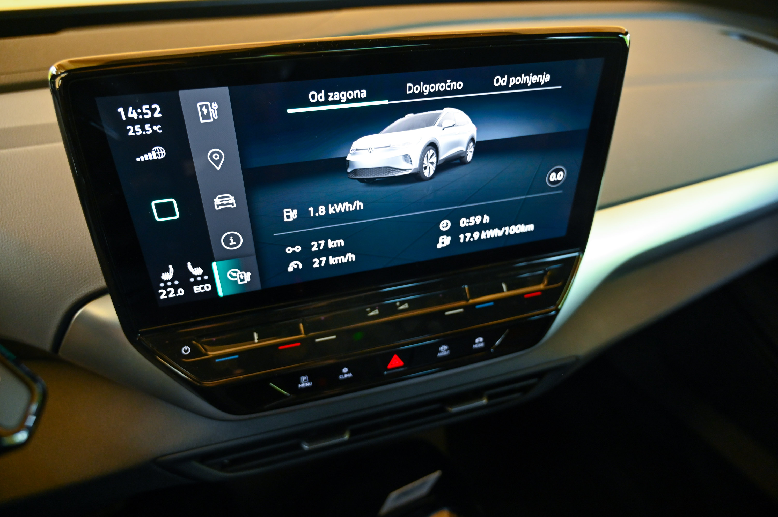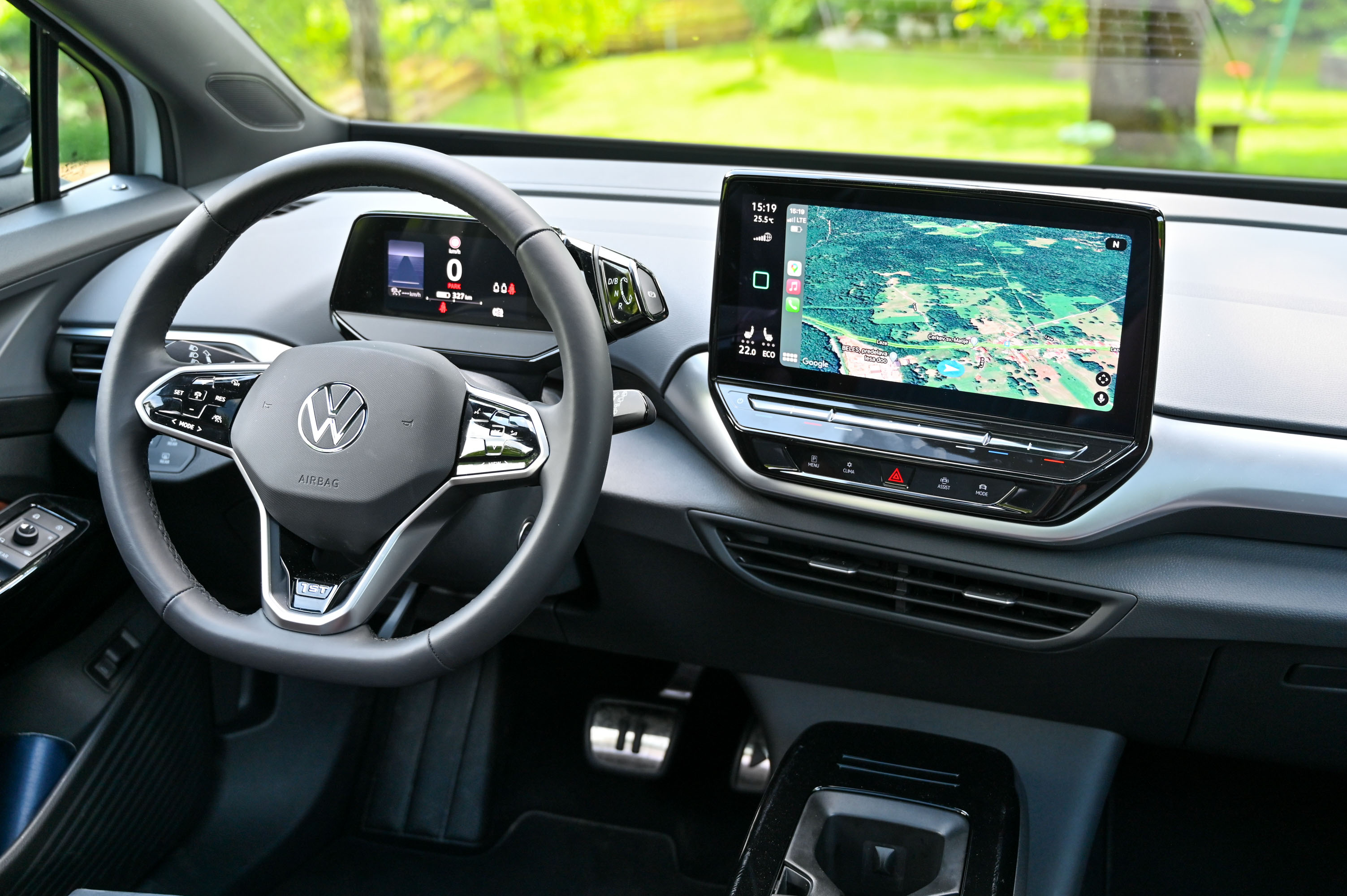 Povsem digitalna zasnova merilnikov s preprosto oblikovano armaturno ploščo še vedno deli mnenja. Digitalizacija, ki spremlja Volkswagnovo elektrifikacijo, ima še precej rezerve v odzivnosti in stabilnosti programske opreme, ki skrbi za komunikacijo in zabavo ter nadzira dogajanje na osrednjem zaslonu. Bolj analogno usmerjeni vozniki utegnejo imeti še vedno nekaj težav s kompleksnimi izbirniki in bližnjicami na dotik za upravljanje nekaterih najbolj osnovnih funkcij … Voznikovo okolje je brez stikal, umetna inteligenca pa s svojo ustrežljivostjo nekaj zmede povzroči že pri zagonu vozila. Takoj, ko voznik sede na svoje mesto, se avto samodejno pripravi na vožnjo in seveda neslišno vklopi tudi električni pogon. Zagonsko stikalo pa je še vedno na voljo - marsikdo ga bo pritisnil in pravzaprav izklopil avto, ko ga bo hotel zagnati. Drobni zeleni napis ready (pripravljen) bo marsikdo spregledal. Pripombo si zasluži tudi ergonomsko ne najbolj posrečen vmesnik menjalnika, pohvalo pa številna uporabna odlagalna mesta in dober sedežni položaj voznika.